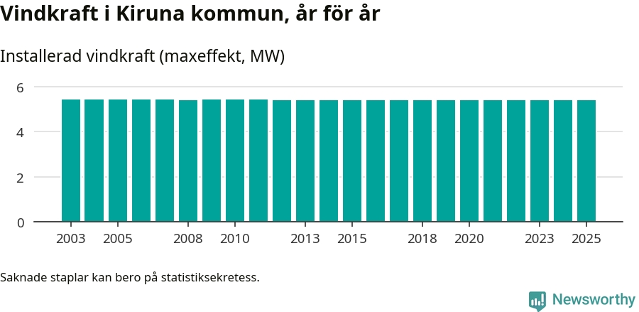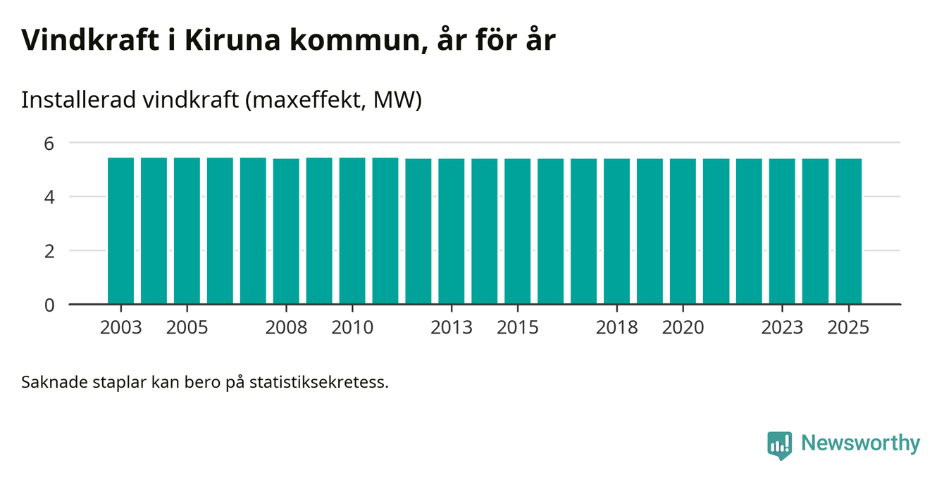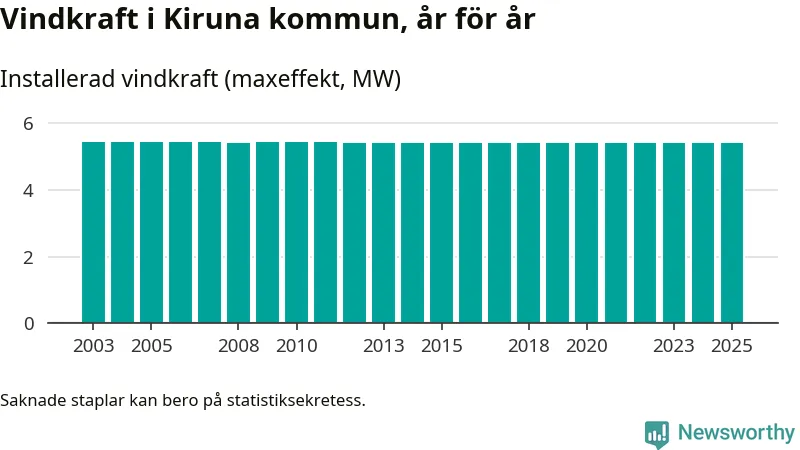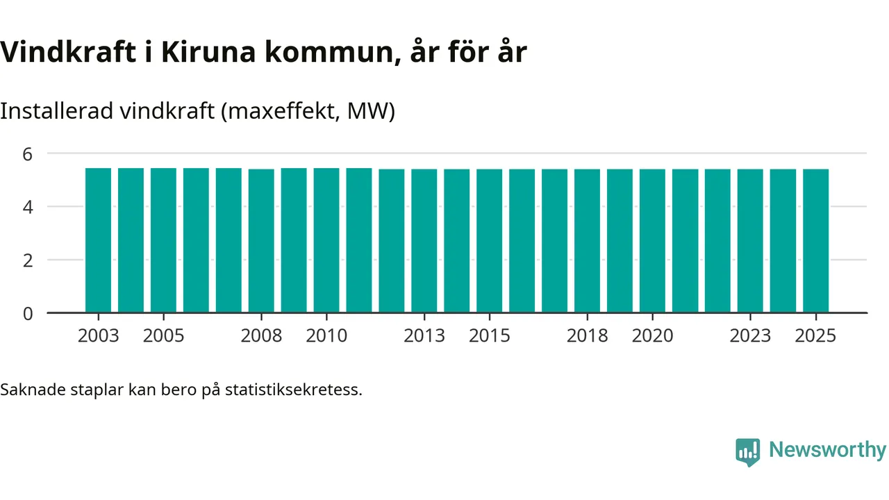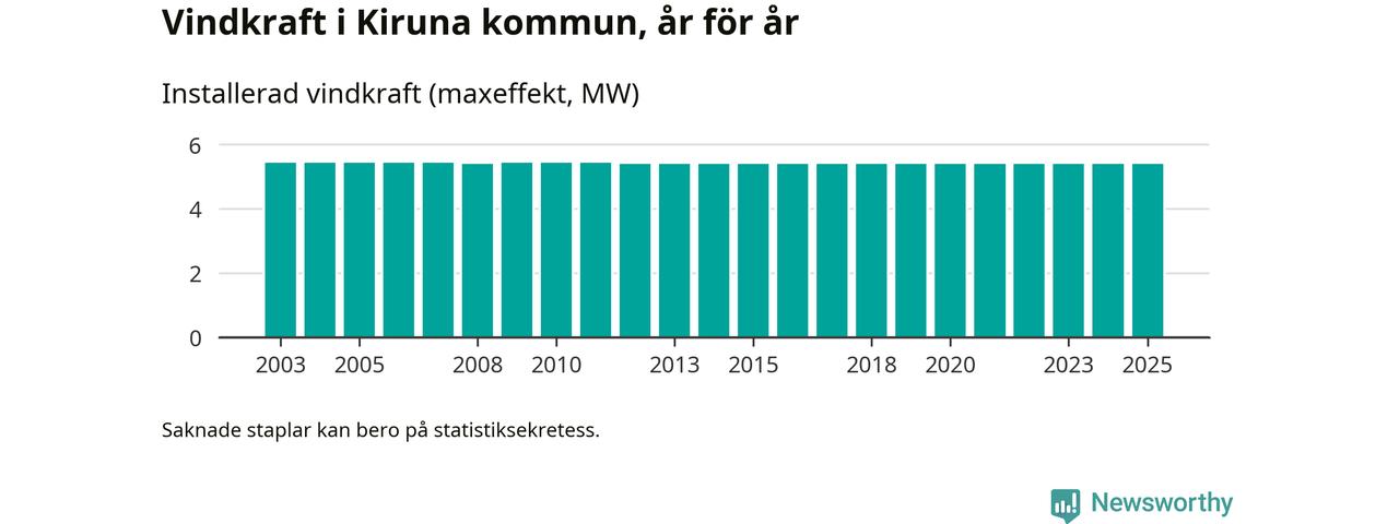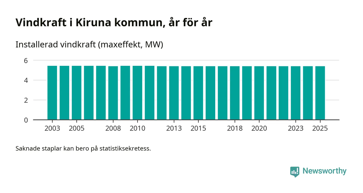 Totalt fanns i slutet av förra året sex vindkraftverk i Kiruna kommun, med en sammanlagd maxeffekt på 5 megawatt. Det är, för 13:e året i rad, oförändrade siffror jämfört med året innan. Det visar nya siffror från Energimyndigheten.