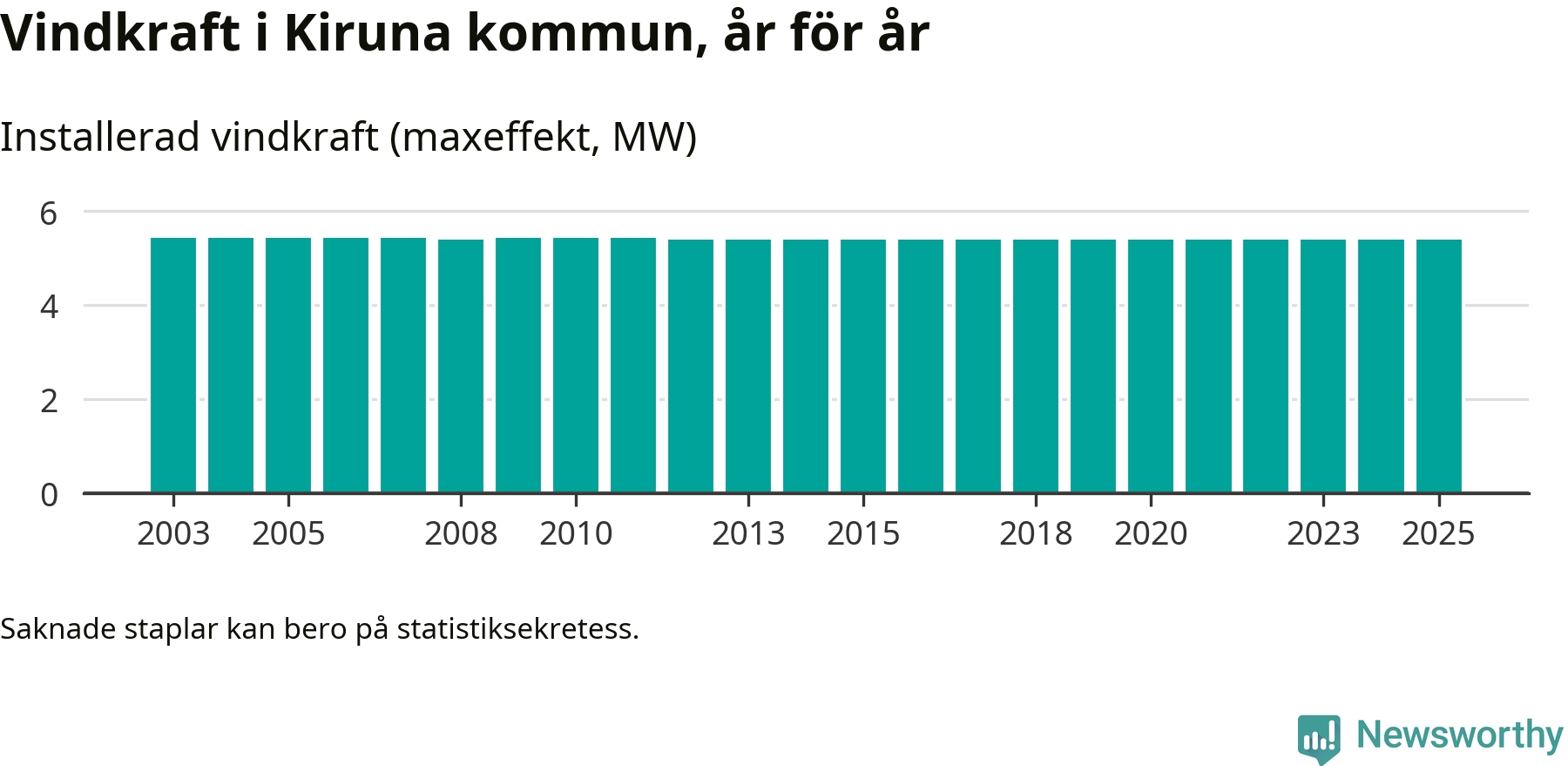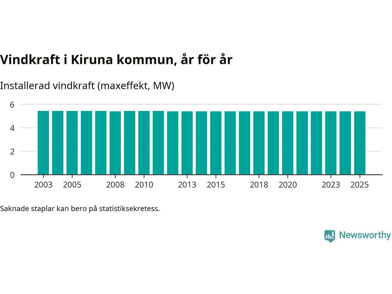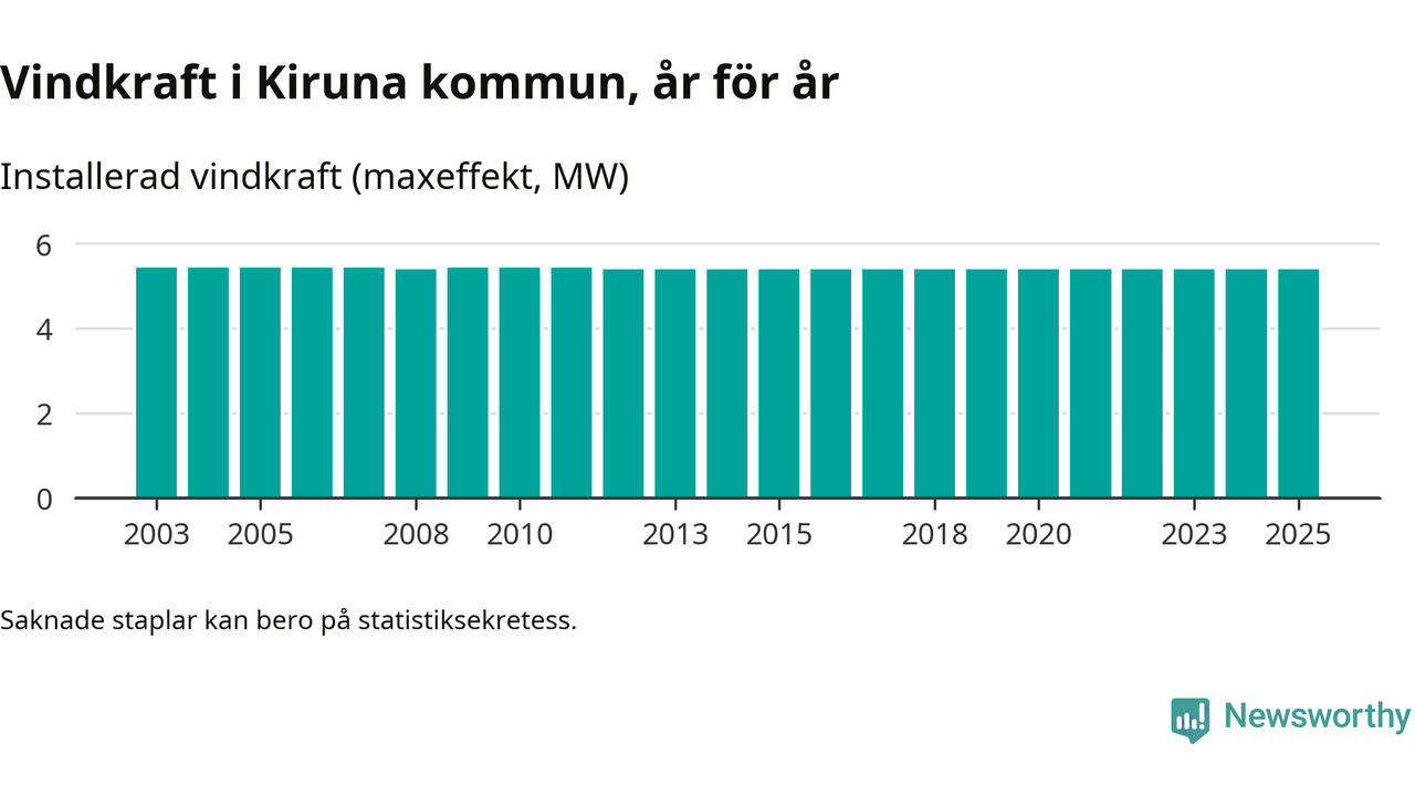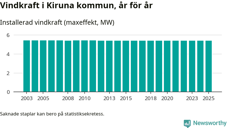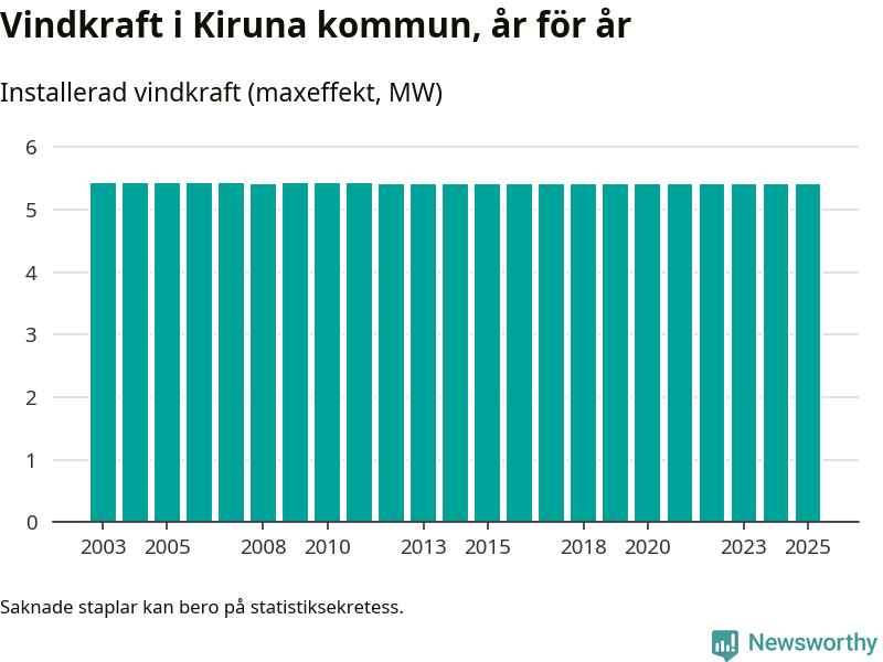 Totalt fanns i slutet av förra året sex vindkraftverk i Kiruna kommun, med en sammanlagd maxeffekt på 5 megawatt. Det är, för 13:e året i rad, oförändrade siffror jämfört med året innan. Det visar nya siffror från Energimyndigheten.