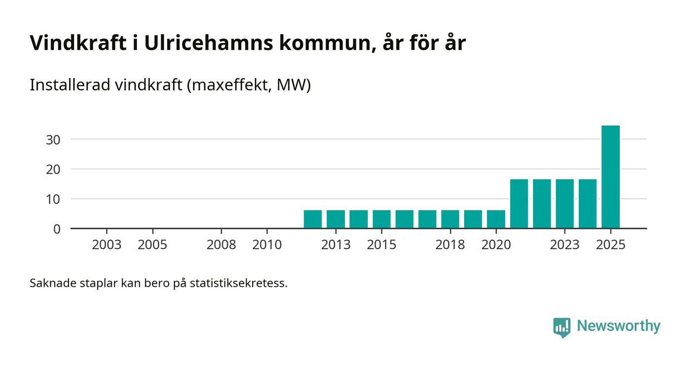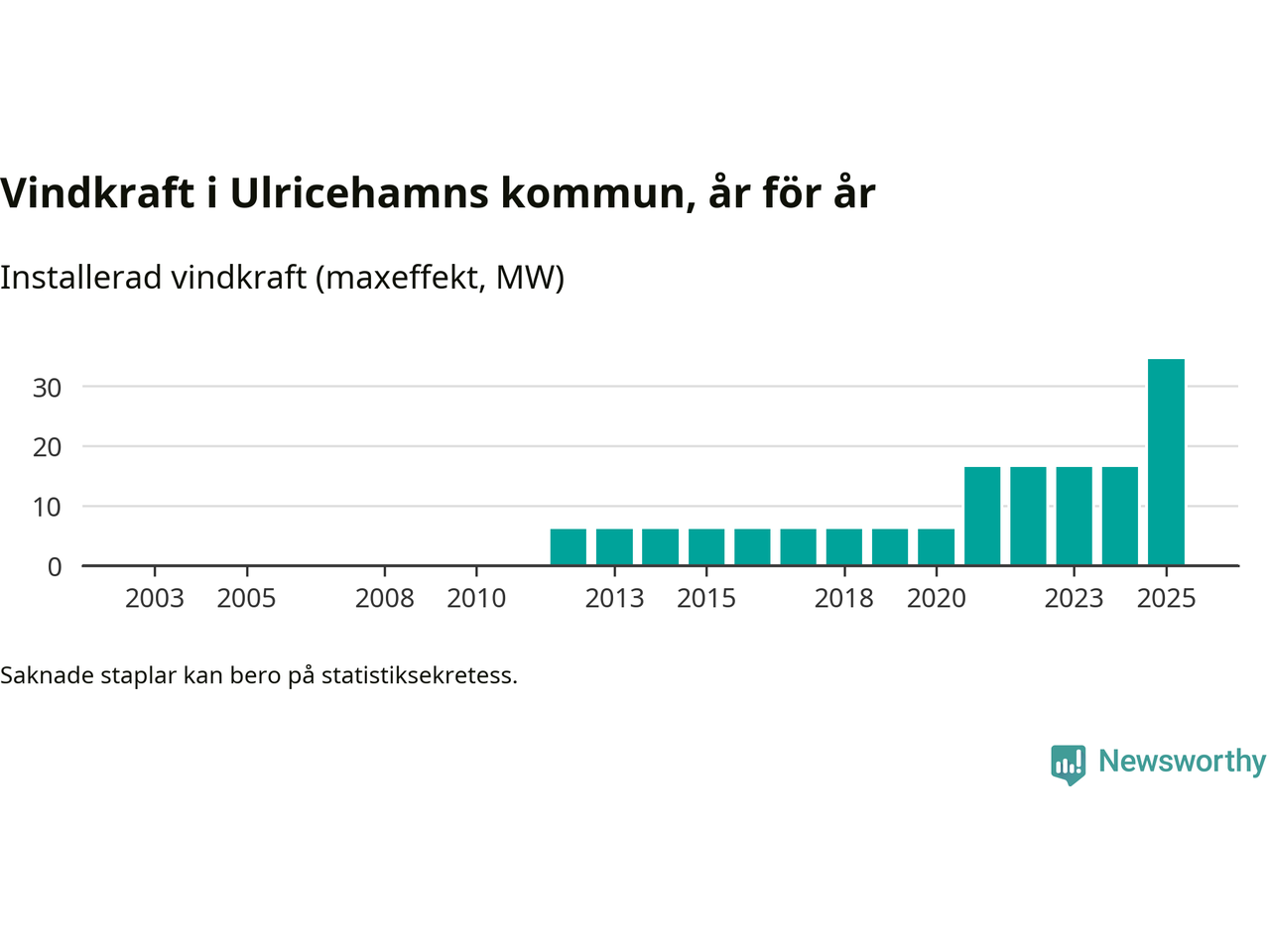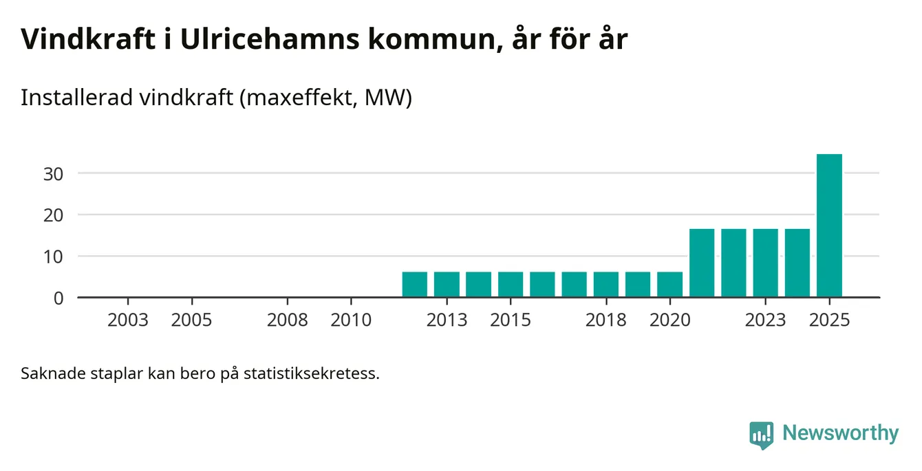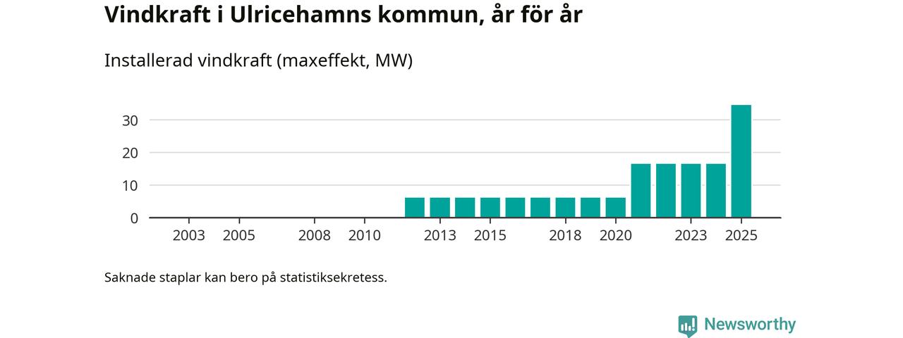 Totalt fanns i slutet av förra året tio vindkraftverk i Ulricehamns kommun, med en sammanlagd maxeffekt på 35 megawatt. Det är en ökning med 18 megawatt, eller 109 procent, jämfört med året innan. Det visar nya siffror från Energimyndigheten.