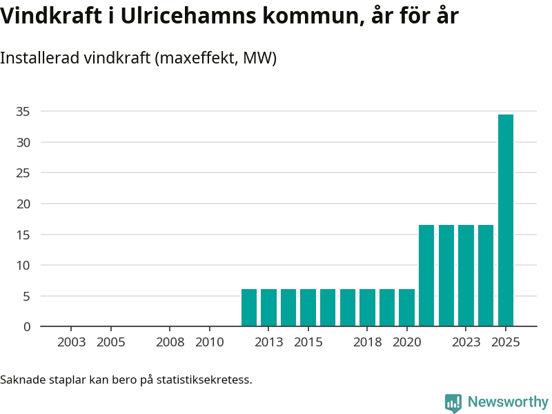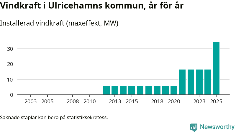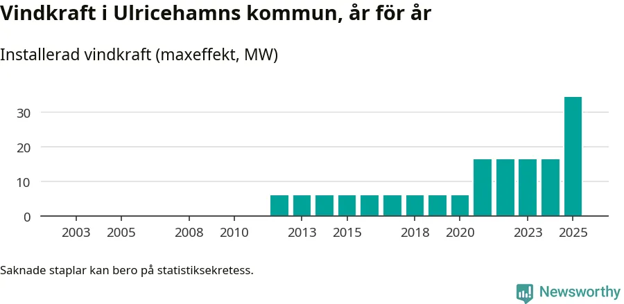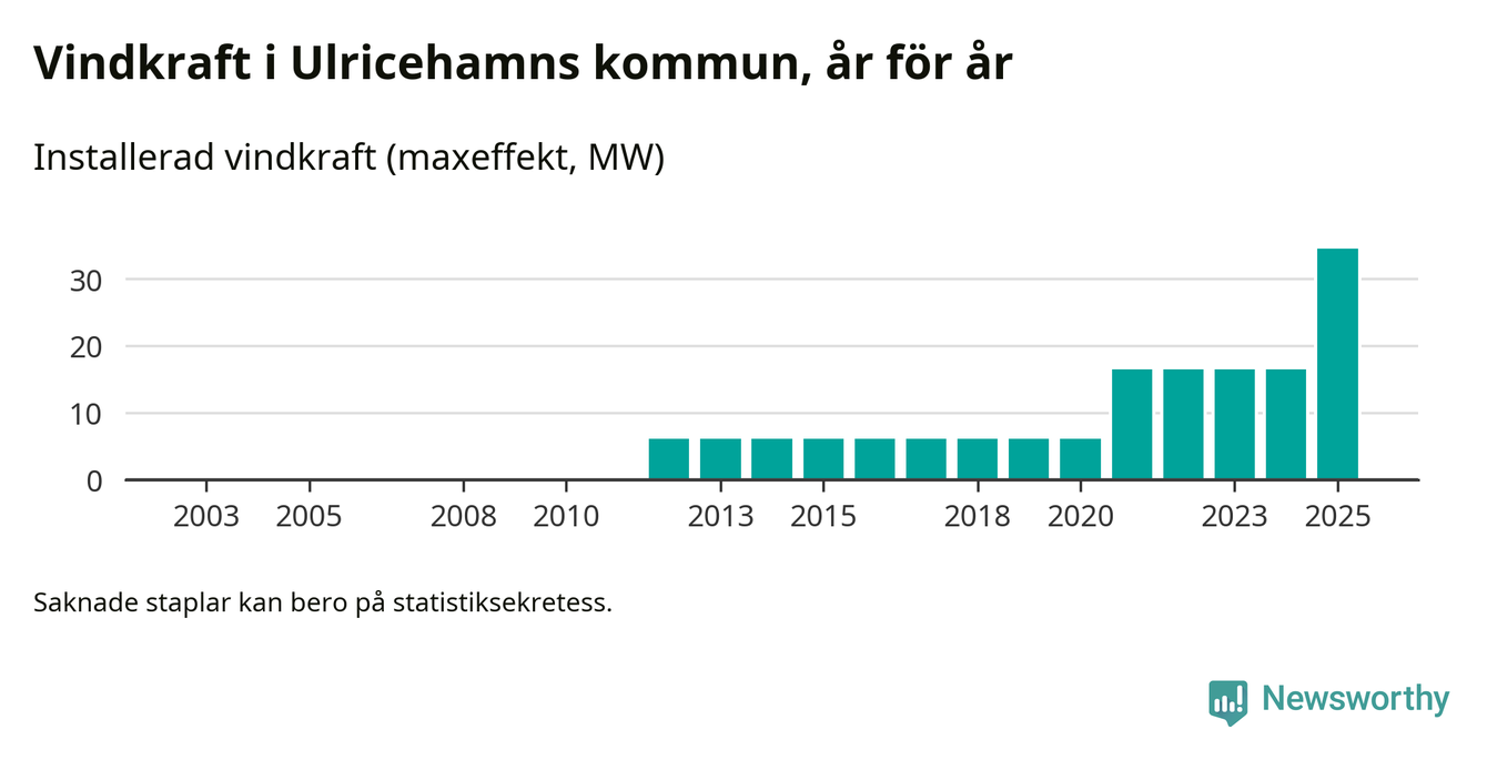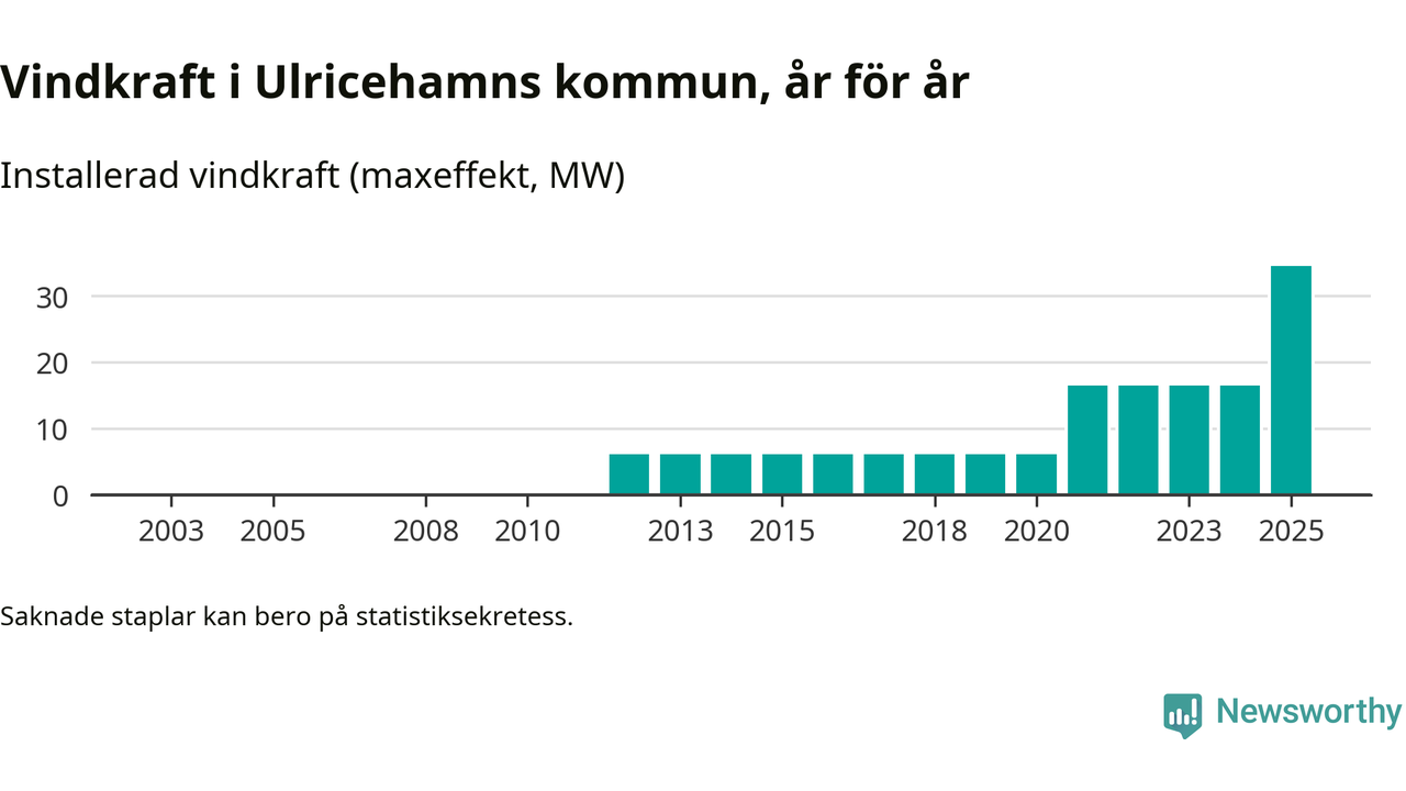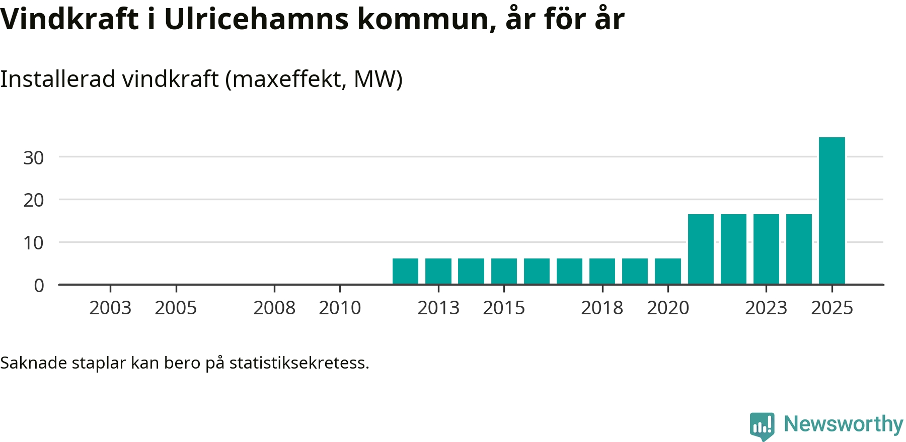 Totalt fanns i slutet av förra året tio vindkraftverk i Ulricehamns kommun, med en sammanlagd maxeffekt på 35 megawatt. Det är en ökning med 18 megawatt, eller 109 procent, jämfört med året innan. Det visar nya siffror från Energimyndigheten.