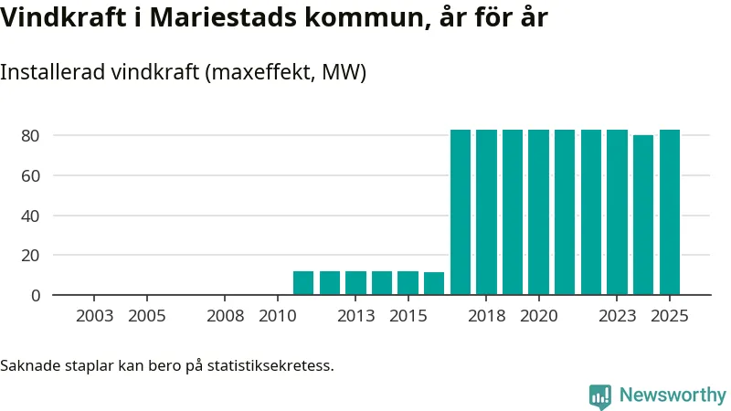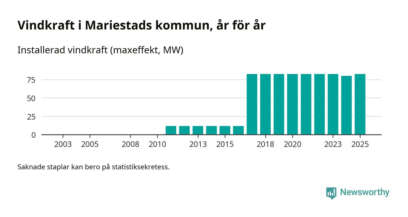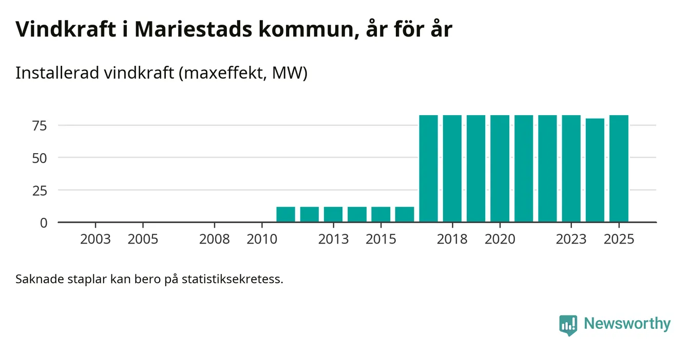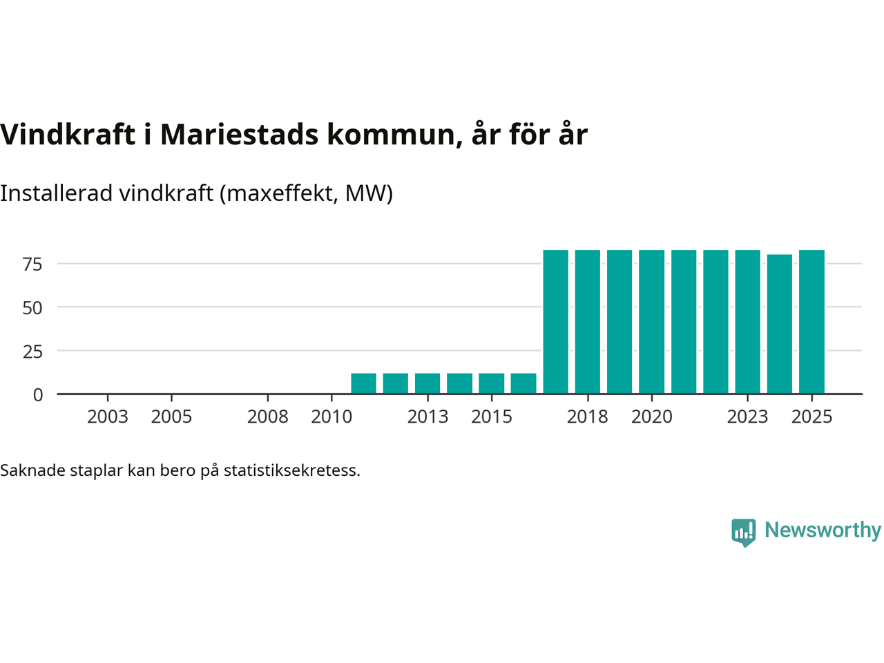 Totalt fanns i slutet av förra året 28 vindkraftverk i Mariestads kommun, med en sammanlagd maxeffekt på 83 megawatt. Det är en liten ökning jämfört med året innan. Det visar nya siffror från Energimyndigheten.