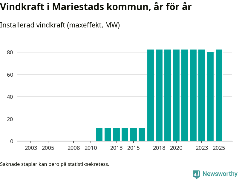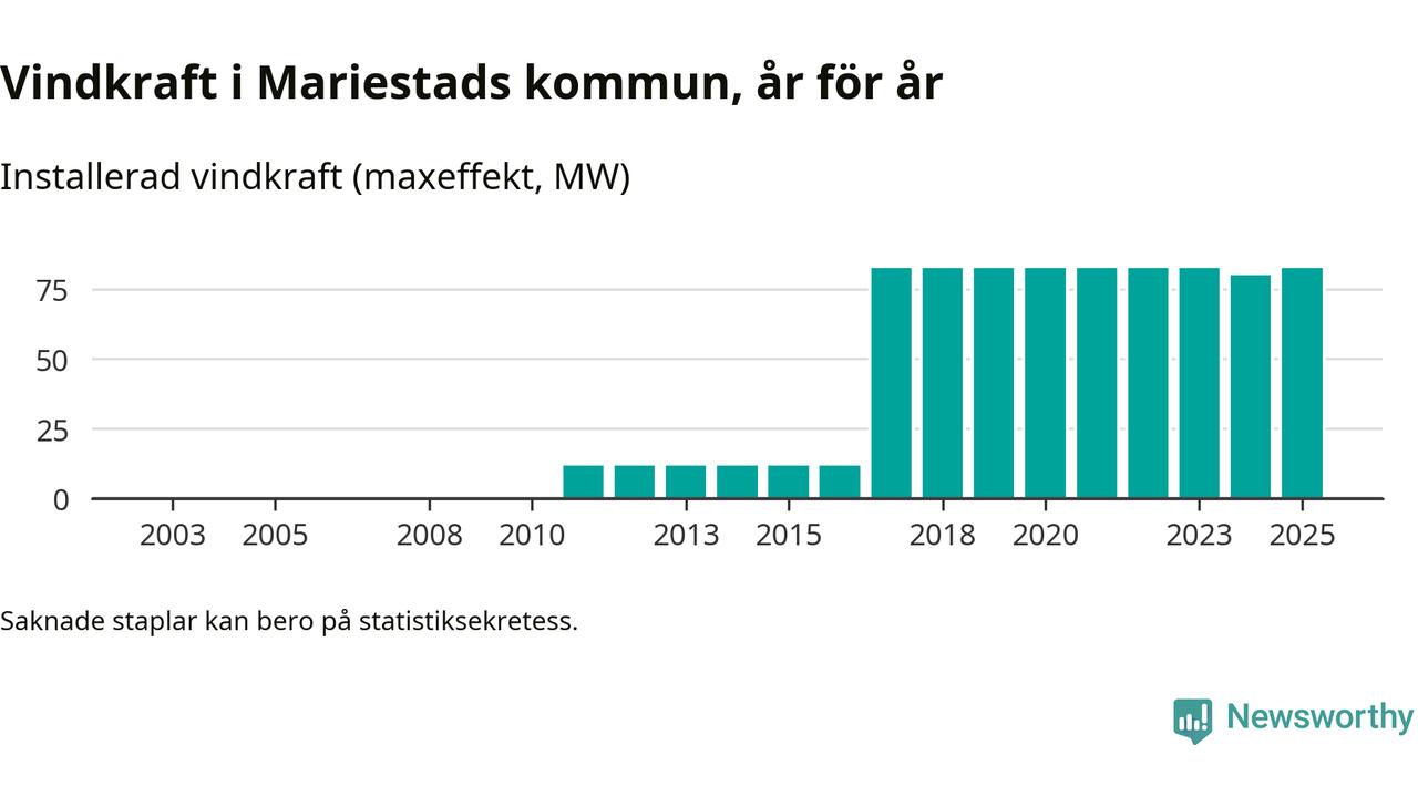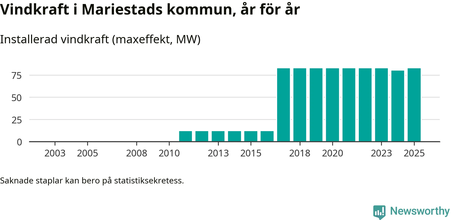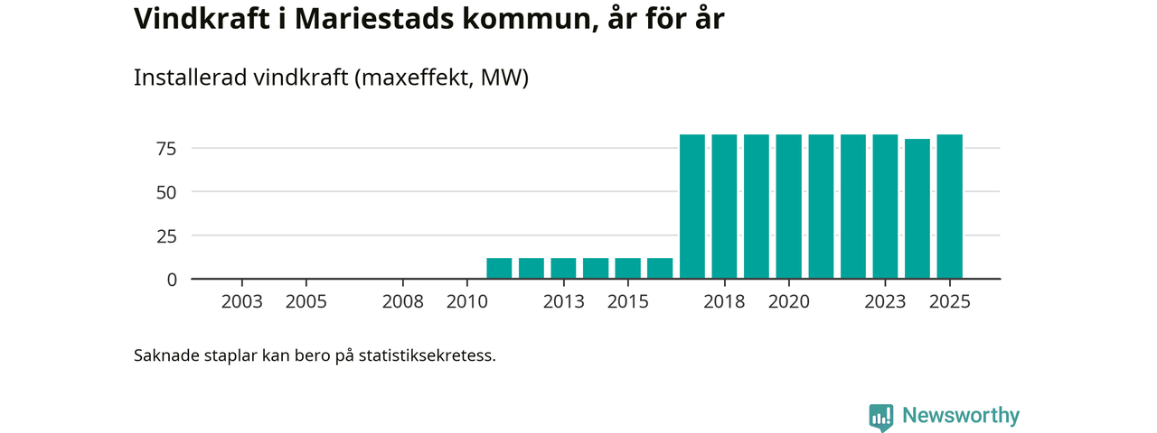 Totalt fanns i slutet av förra året 28 vindkraftverk i Mariestads kommun, med en sammanlagd maxeffekt på 83 megawatt. Det är en liten ökning jämfört med året innan. Det visar nya siffror från Energimyndigheten.