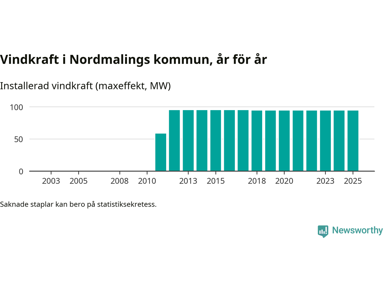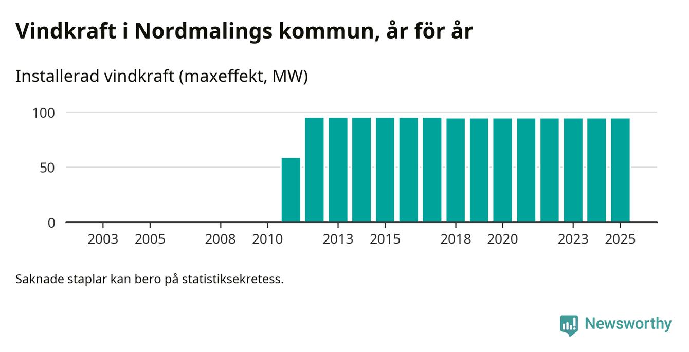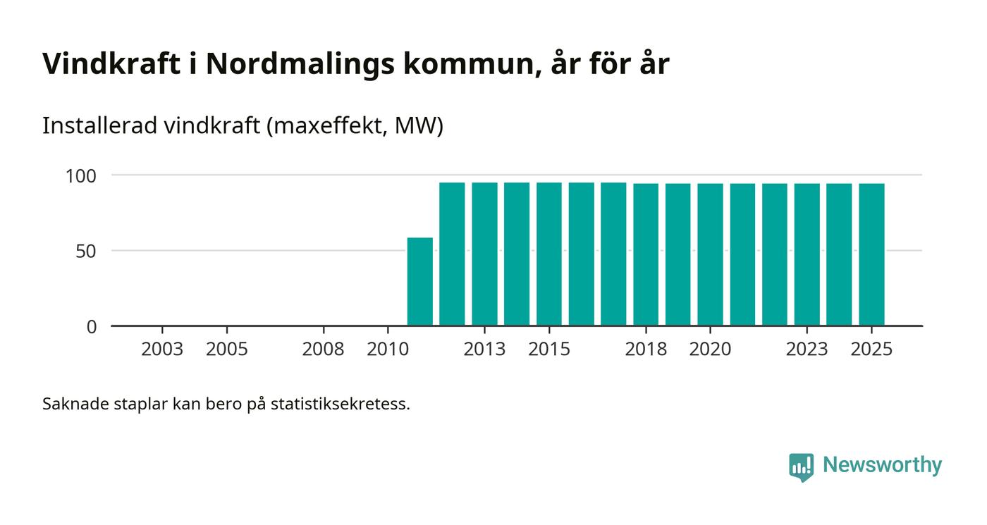 Totalt fanns i slutet av förra året 41 vindkraftverk i Nordmalings kommun, med en sammanlagd maxeffekt på 94 megawatt. Det är, för sjunde året i rad, oförändrade siffror jämfört med året innan. Det visar nya siffror från Energimyndigheten.