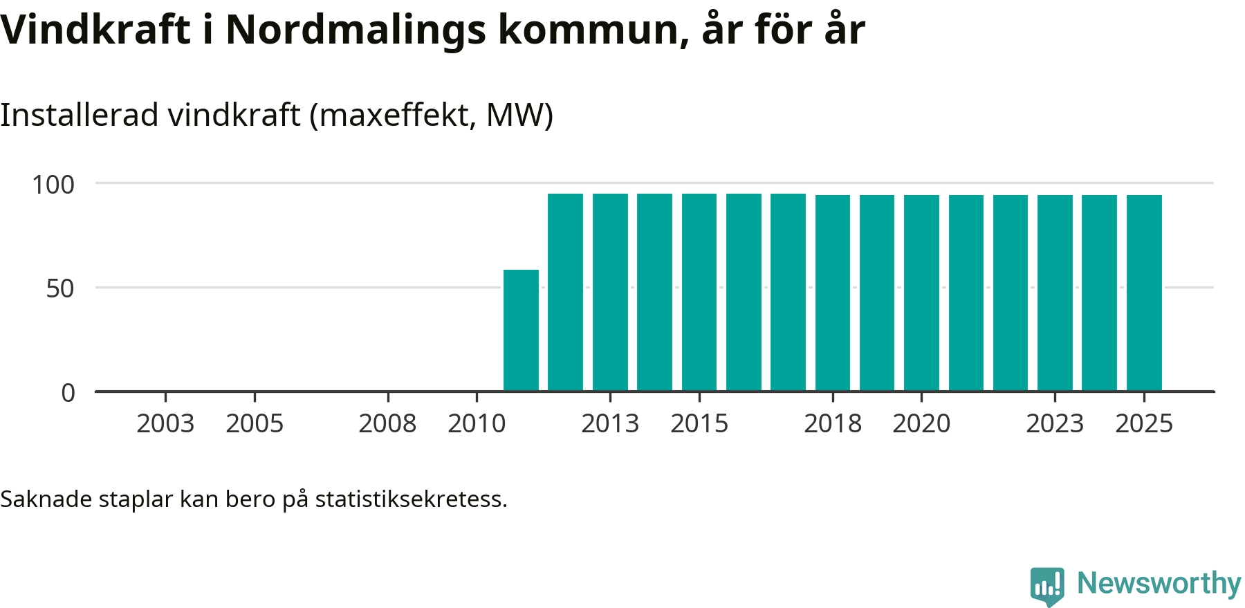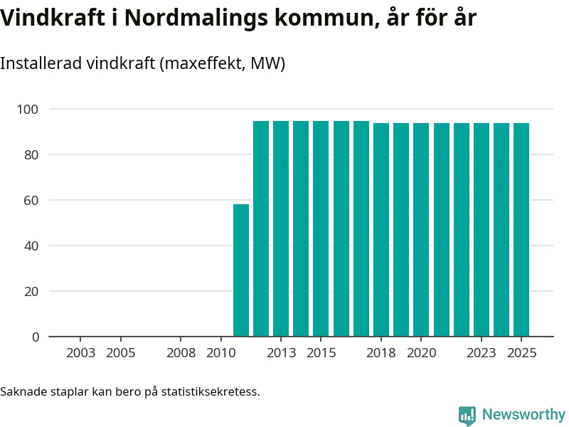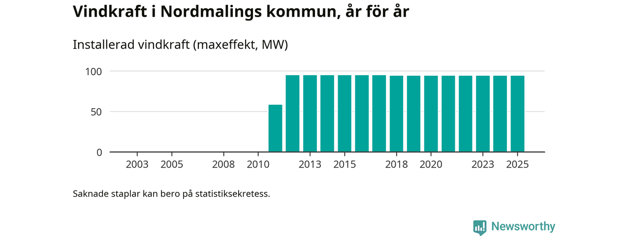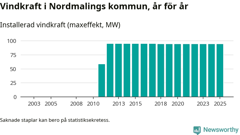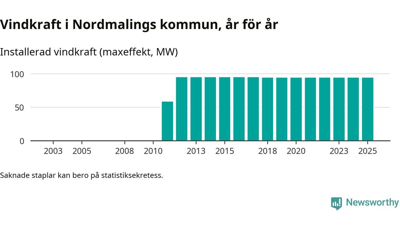 Totalt fanns i slutet av förra året 41 vindkraftverk i Nordmalings kommun, med en sammanlagd maxeffekt på 94 megawatt. Det är, för sjunde året i rad, oförändrade siffror jämfört med året innan. Det visar nya siffror från Energimyndigheten.