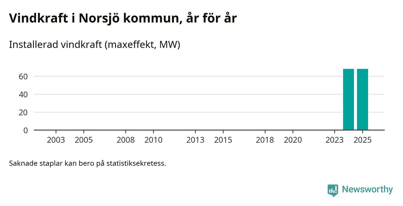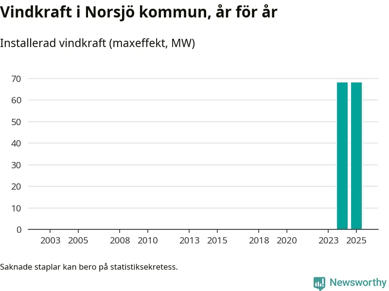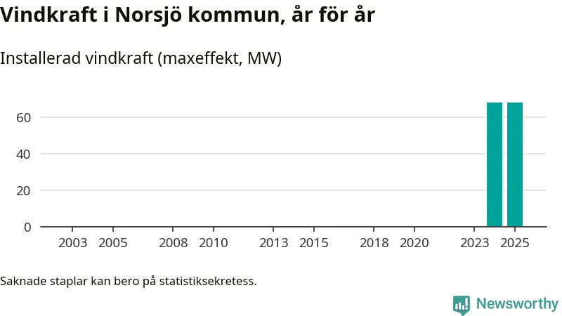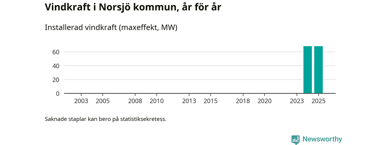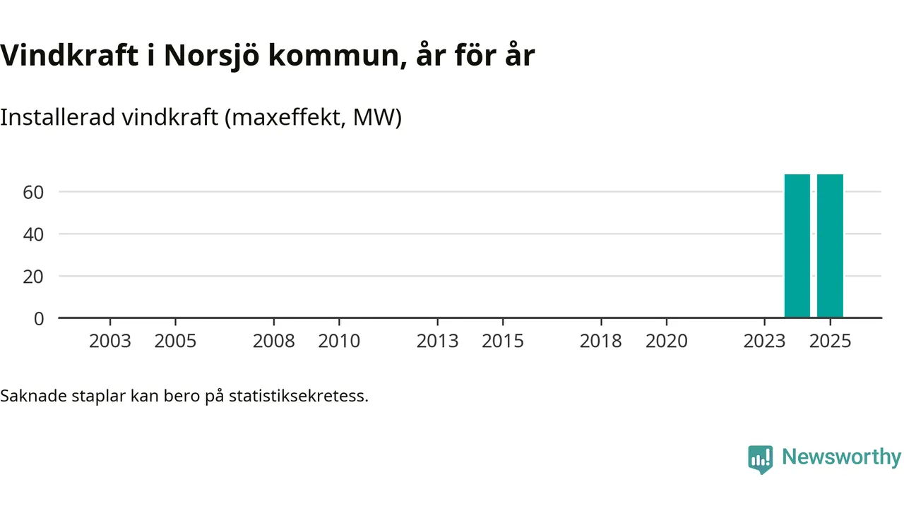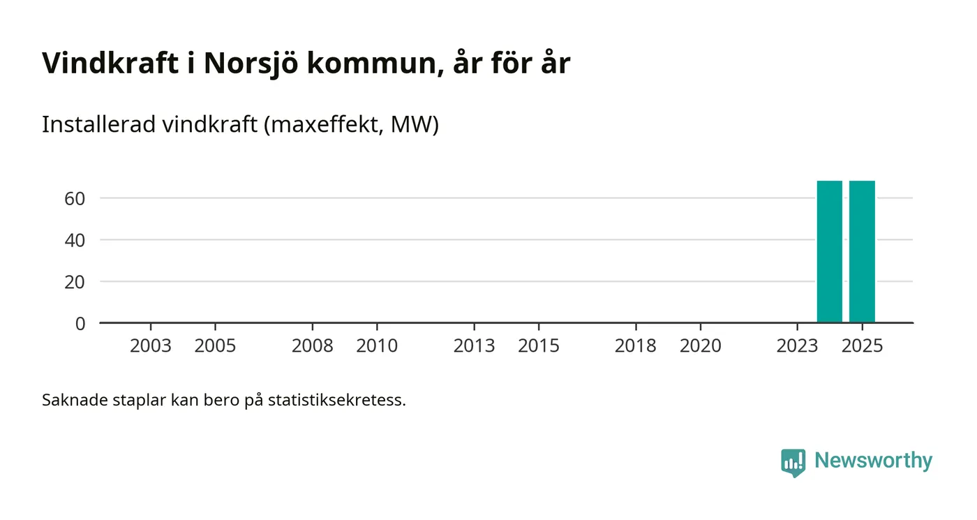 Totalt fanns i slutet av förra året tio vindkraftverk i Norsjö kommun, med en sammanlagd maxeffekt på 68 megawatt. Det är oförändrade siffror jämfört med året innan. Det visar nya siffror från Energimyndigheten.
