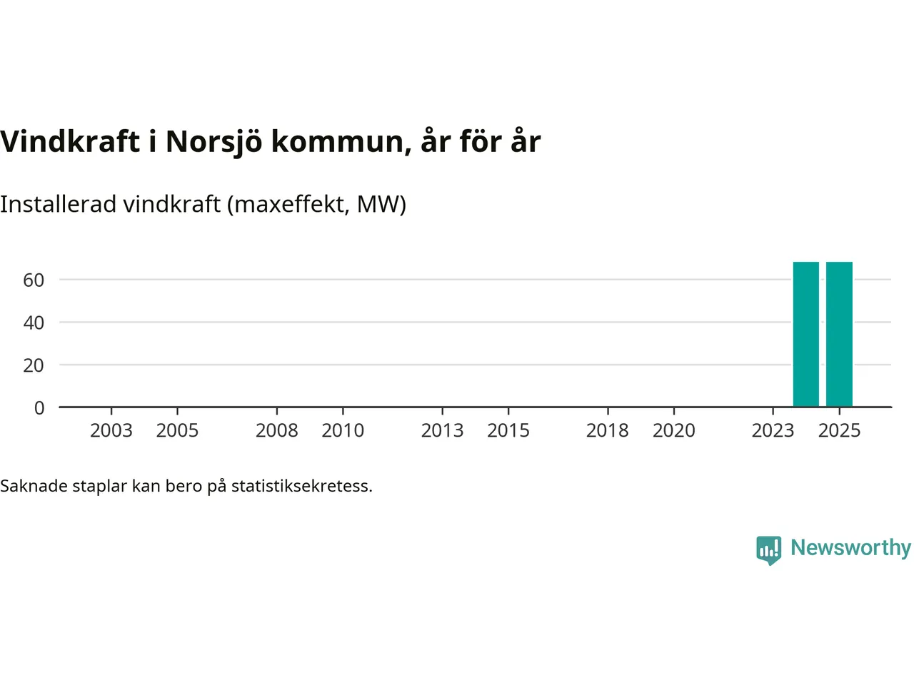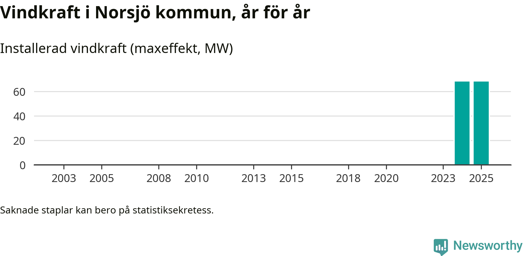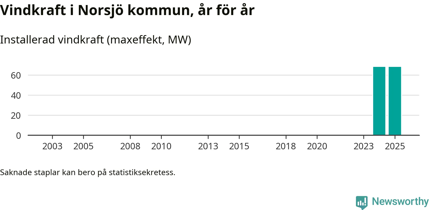 Totalt fanns i slutet av förra året tio vindkraftverk i Norsjö kommun, med en sammanlagd maxeffekt på 68 megawatt. Det är oförändrade siffror jämfört med året innan. Det visar nya siffror från Energimyndigheten.
