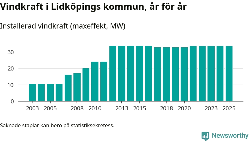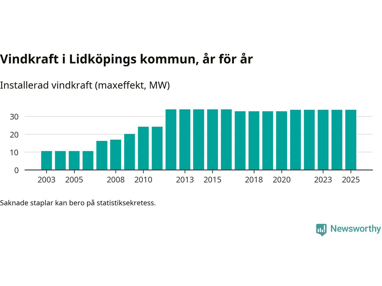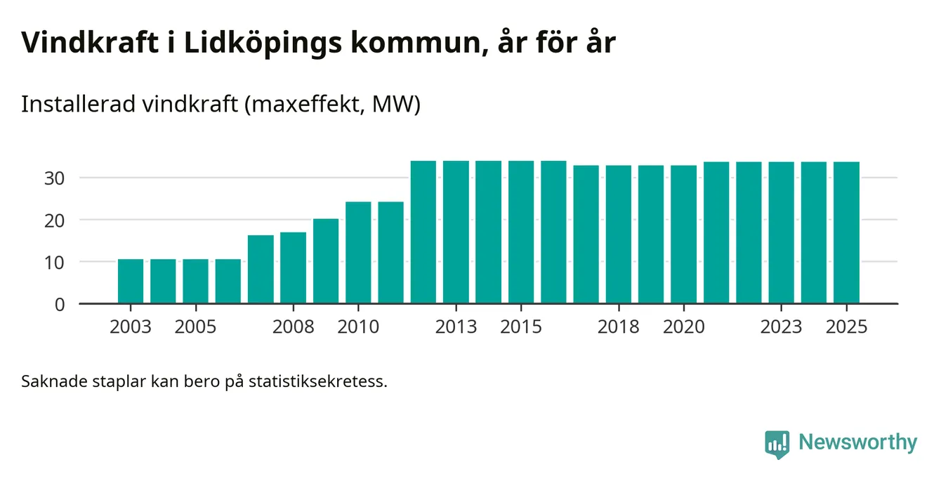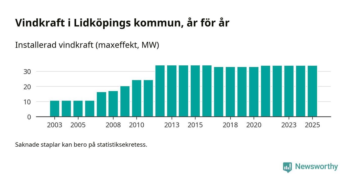 Totalt fanns i slutet av förra året 31 vindkraftverk i Lidköpings kommun, med en sammanlagd maxeffekt på 34 megawatt. Det är, för fjärde året i rad, oförändrade siffror jämfört med året innan. Det visar nya siffror från Energimyndigheten.