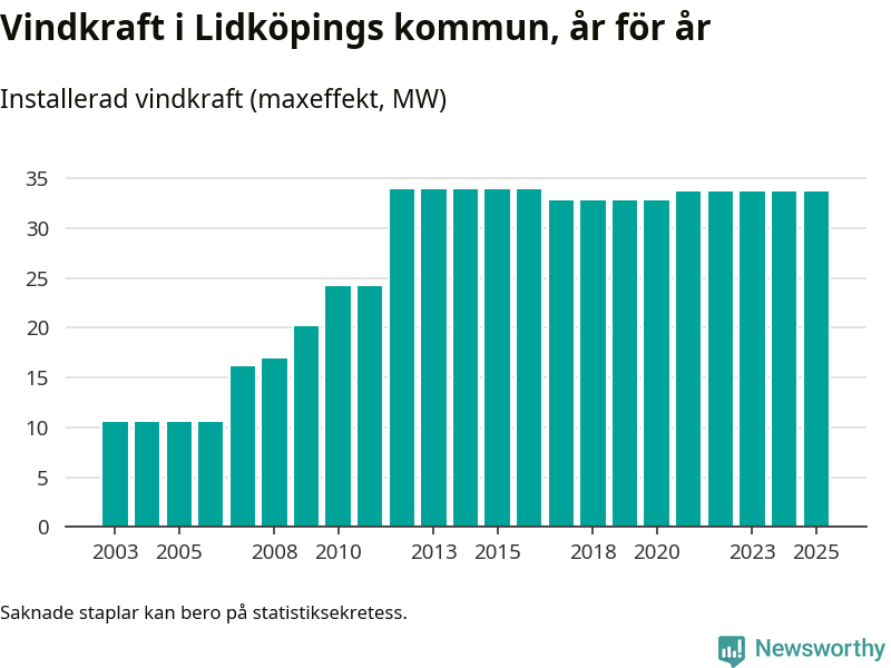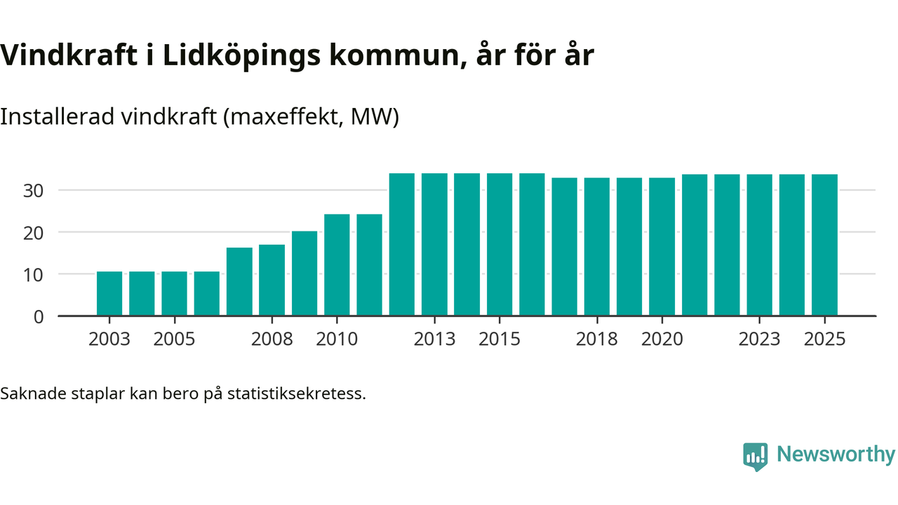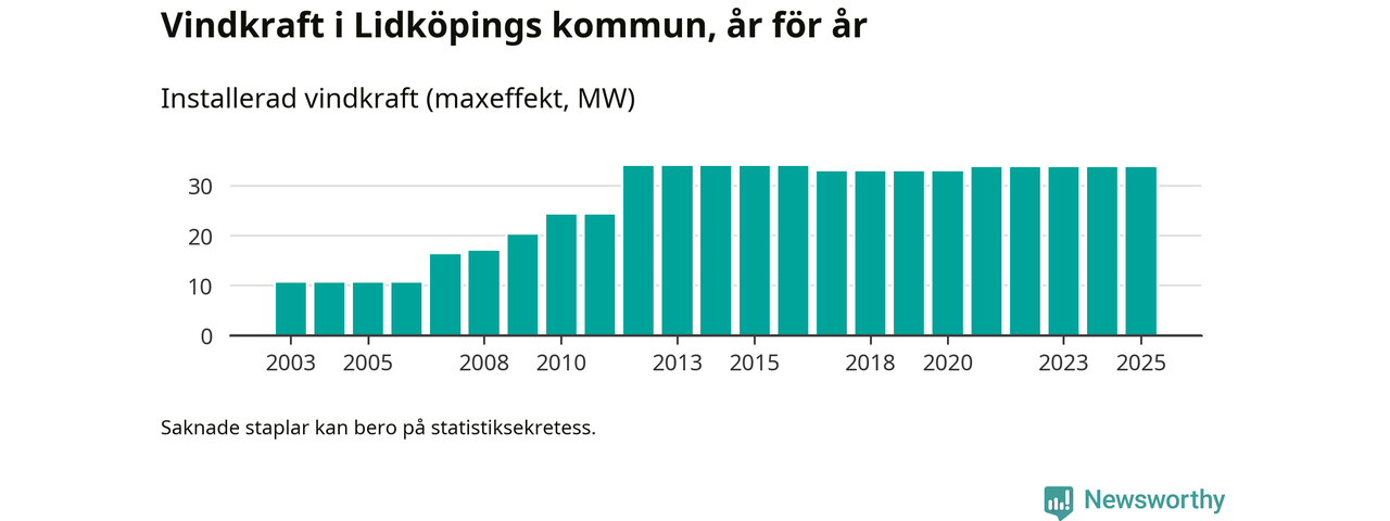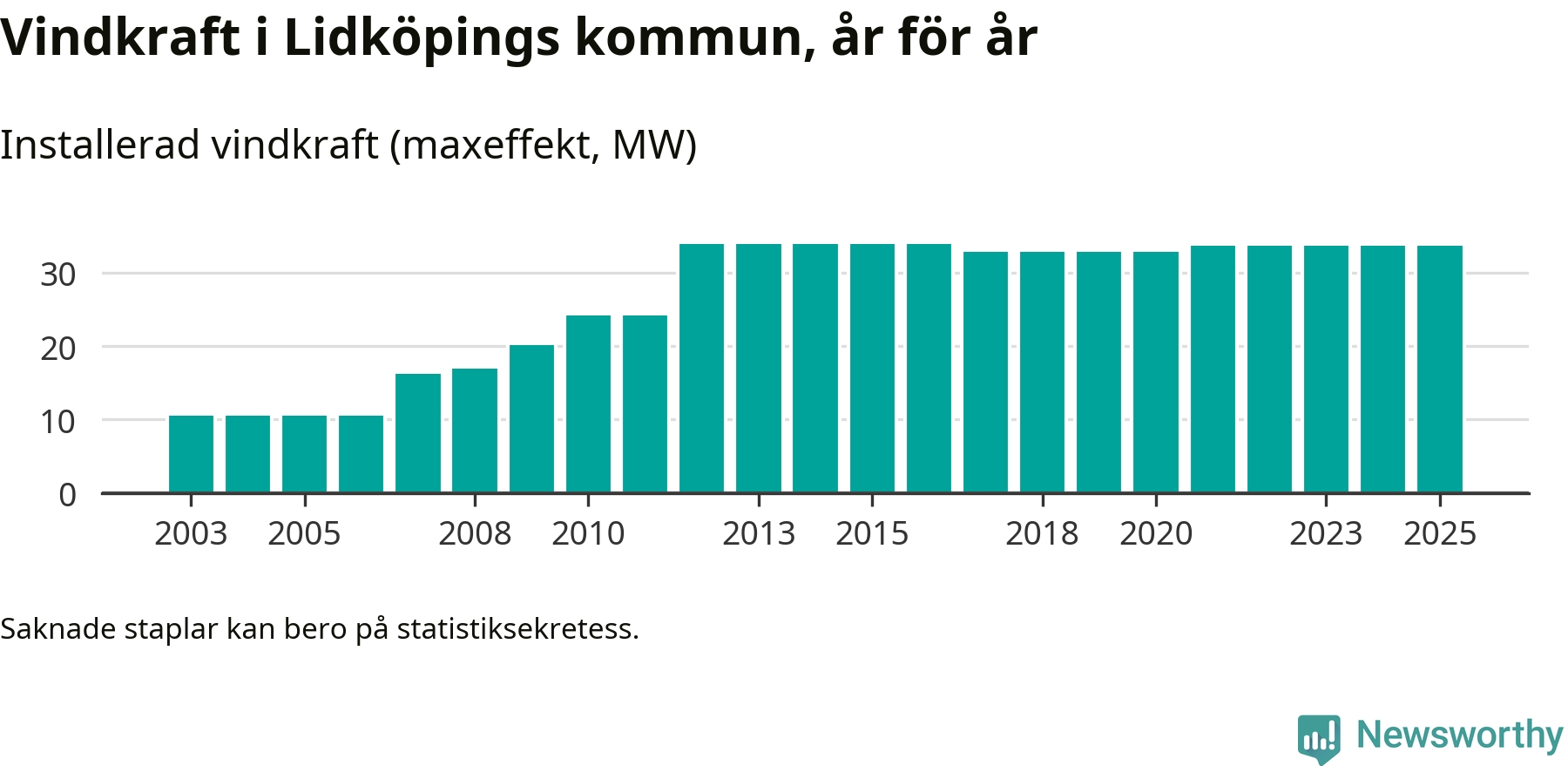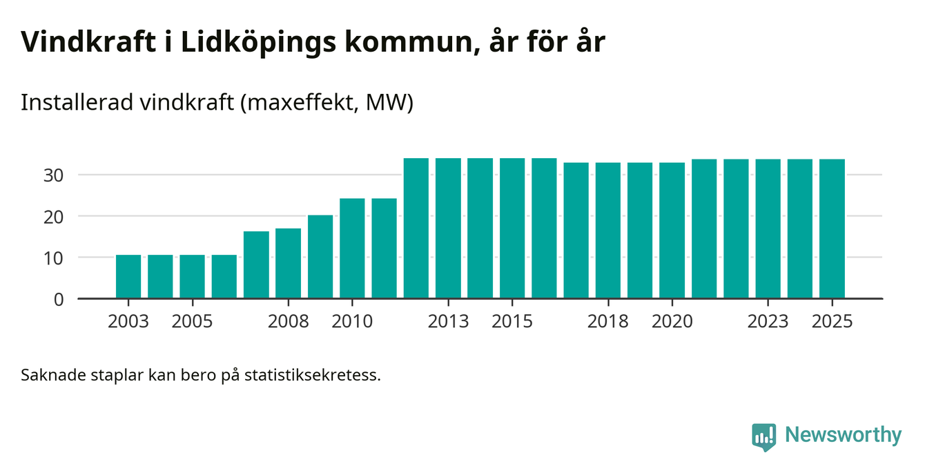 Totalt fanns i slutet av förra året 31 vindkraftverk i Lidköpings kommun, med en sammanlagd maxeffekt på 34 megawatt. Det är, för fjärde året i rad, oförändrade siffror jämfört med året innan. Det visar nya siffror från Energimyndigheten.