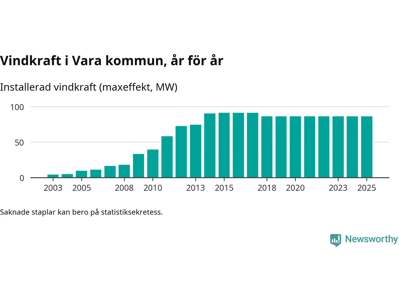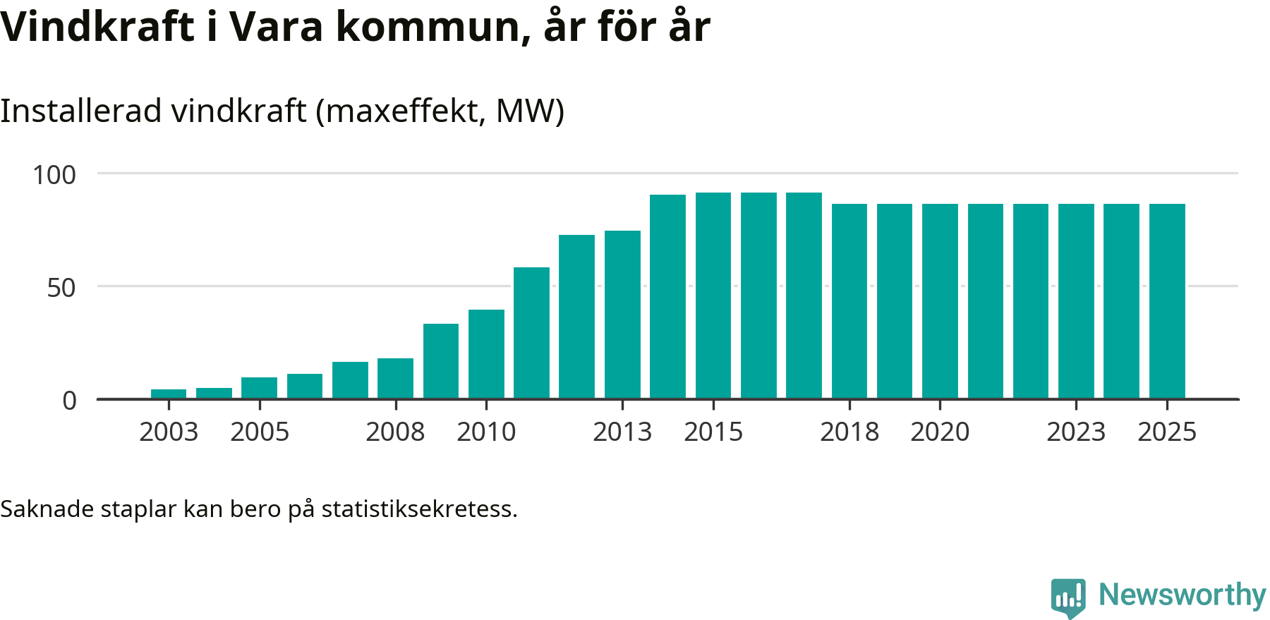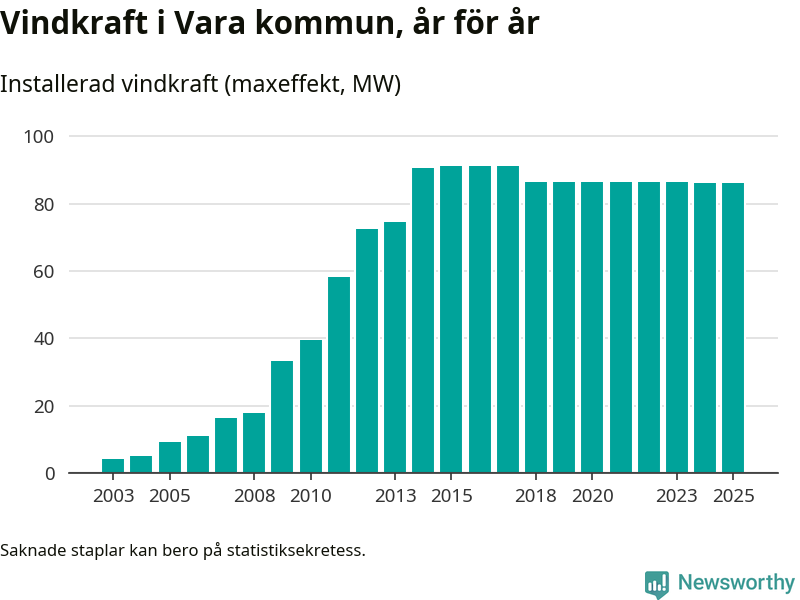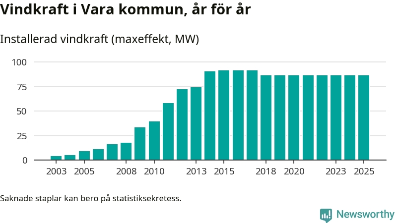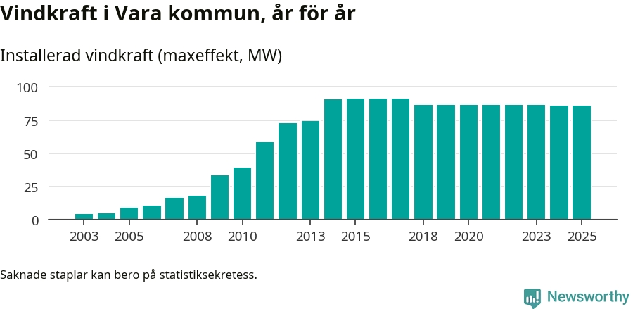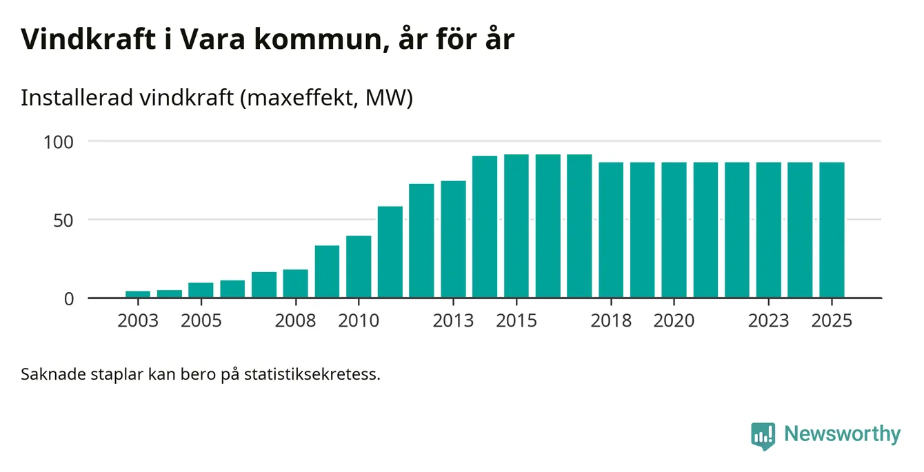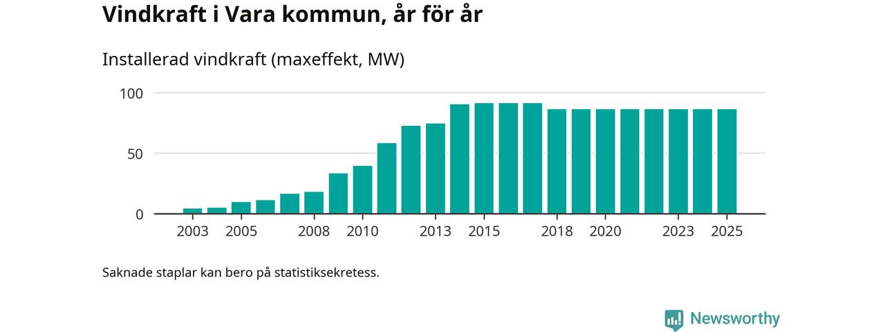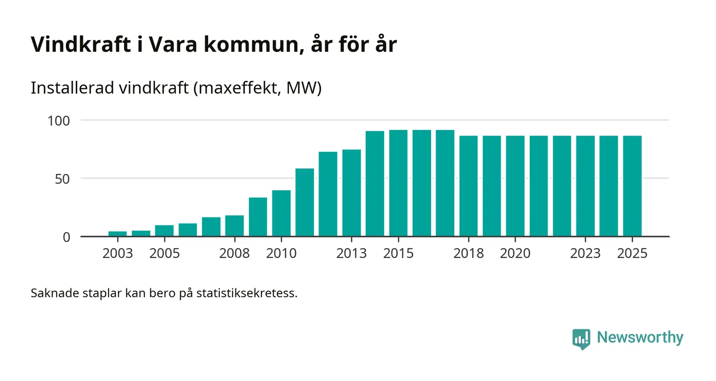 Totalt fanns i slutet av förra året 54 vindkraftverk i Vara kommun, med en sammanlagd maxeffekt på 86 megawatt. Det är oförändrade siffror jämfört med året innan. Det visar nya siffror från Energimyndigheten.