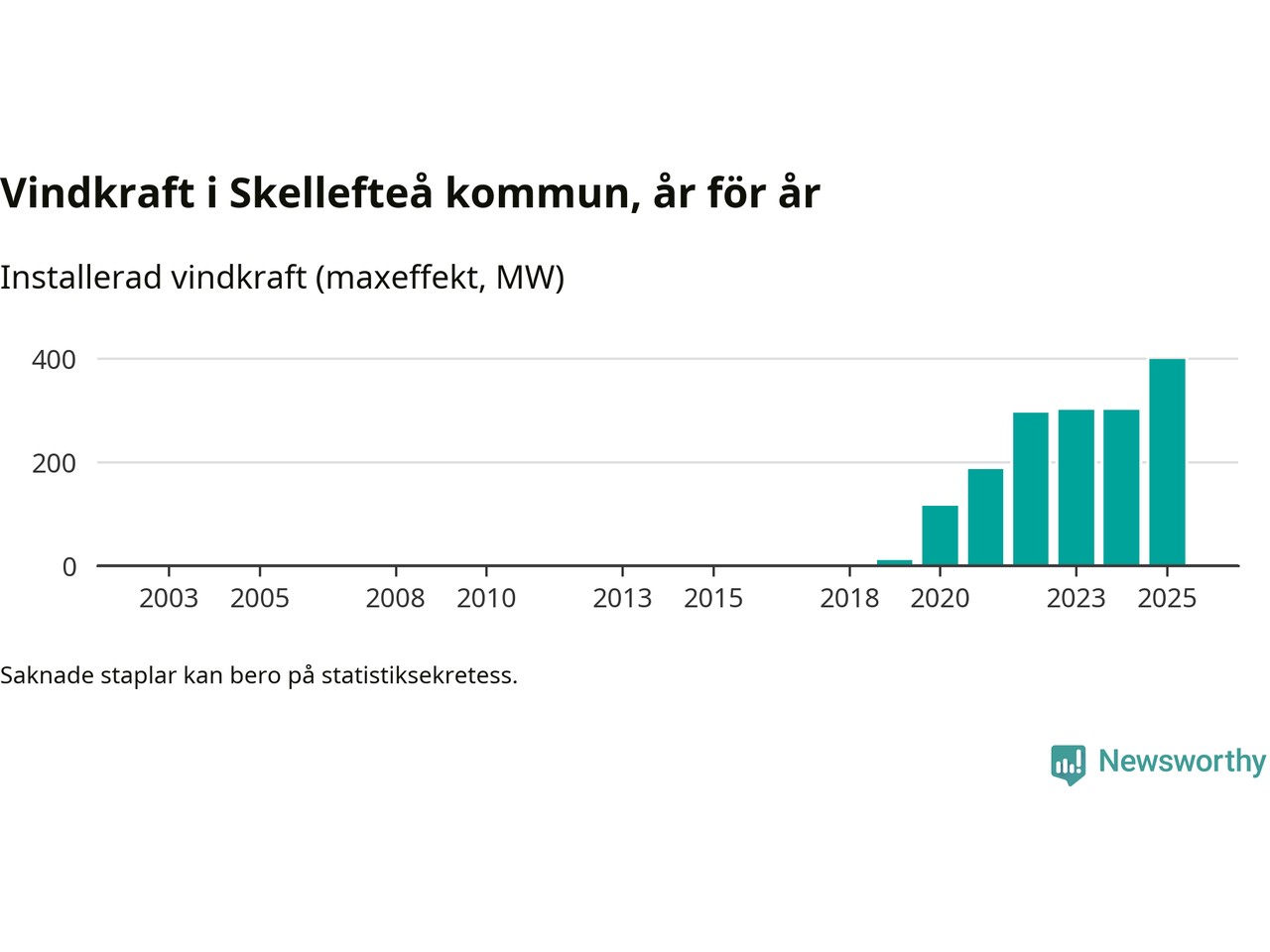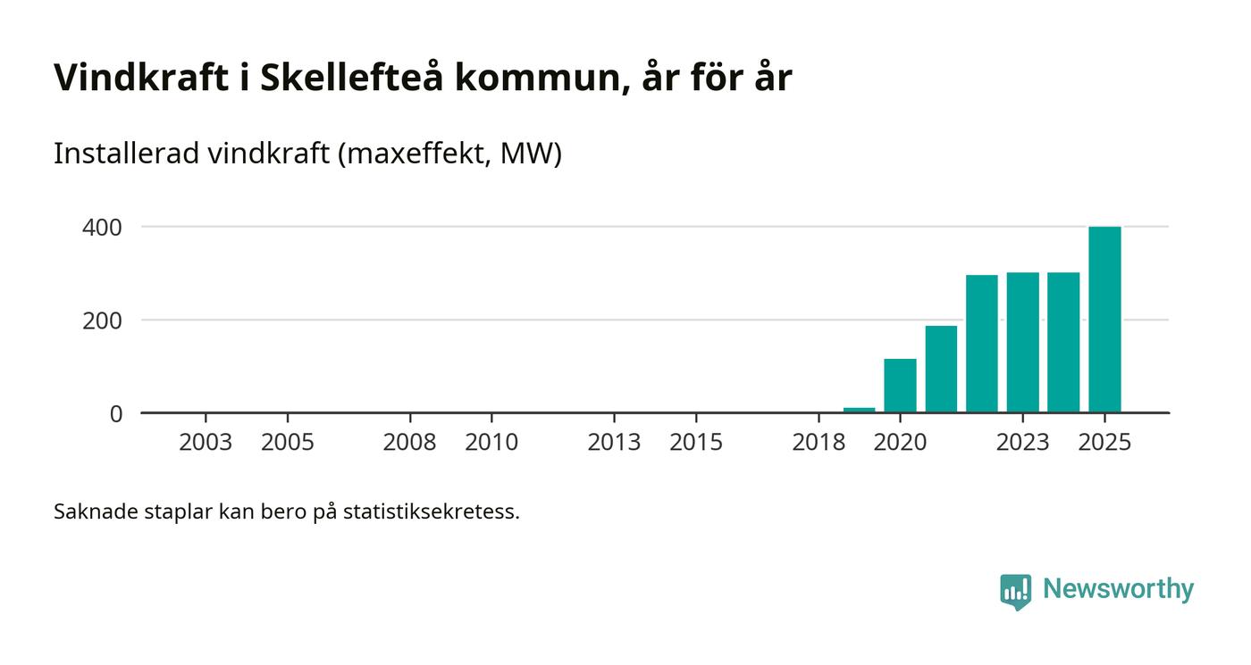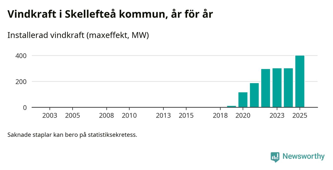 Totalt fanns i slutet av förra året 80 vindkraftverk i Skellefteå kommun, med en sammanlagd maxeffekt på 398 megawatt. Det är en ökning med 98 megawatt, eller 33 procent, jämfört med året innan. Det visar nya siffror från Energimyndigheten.