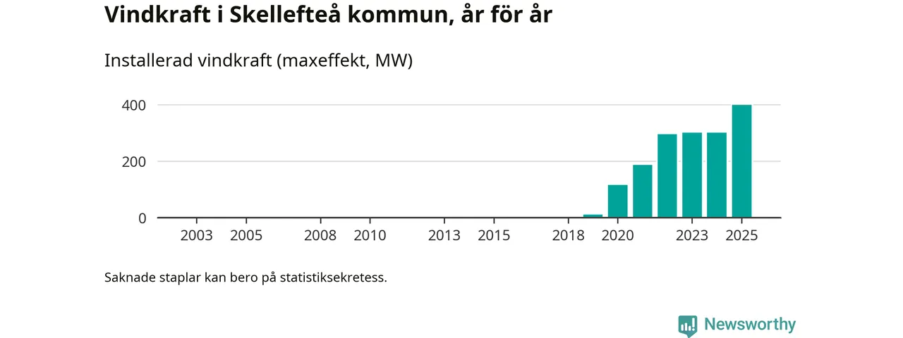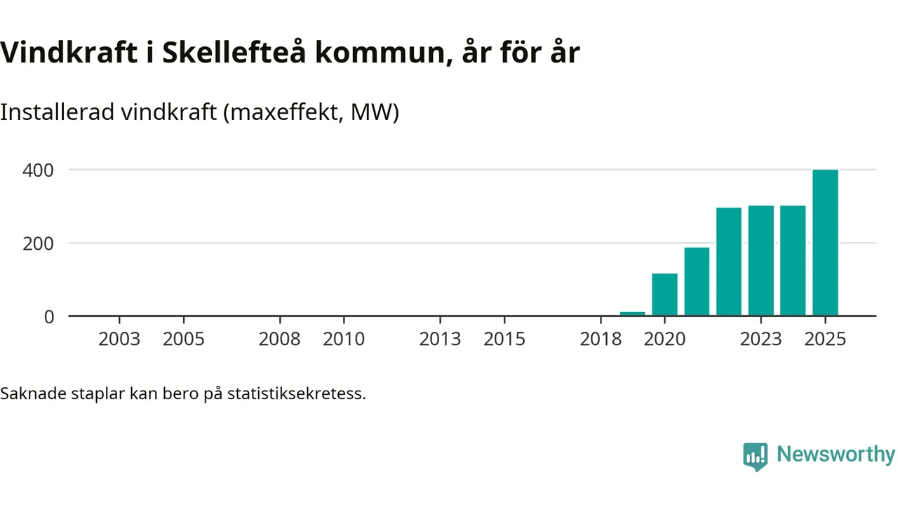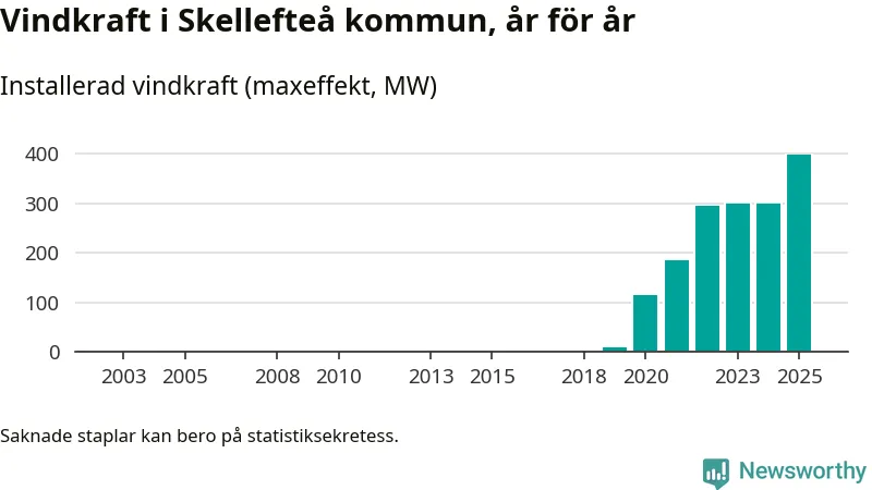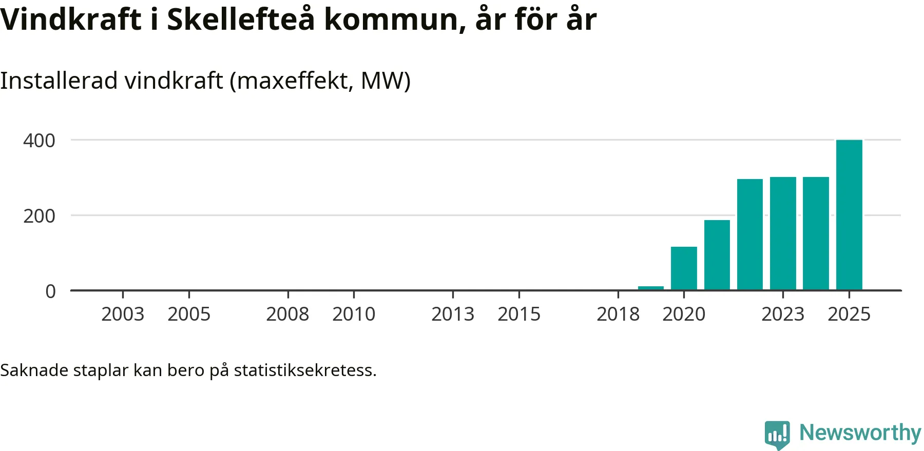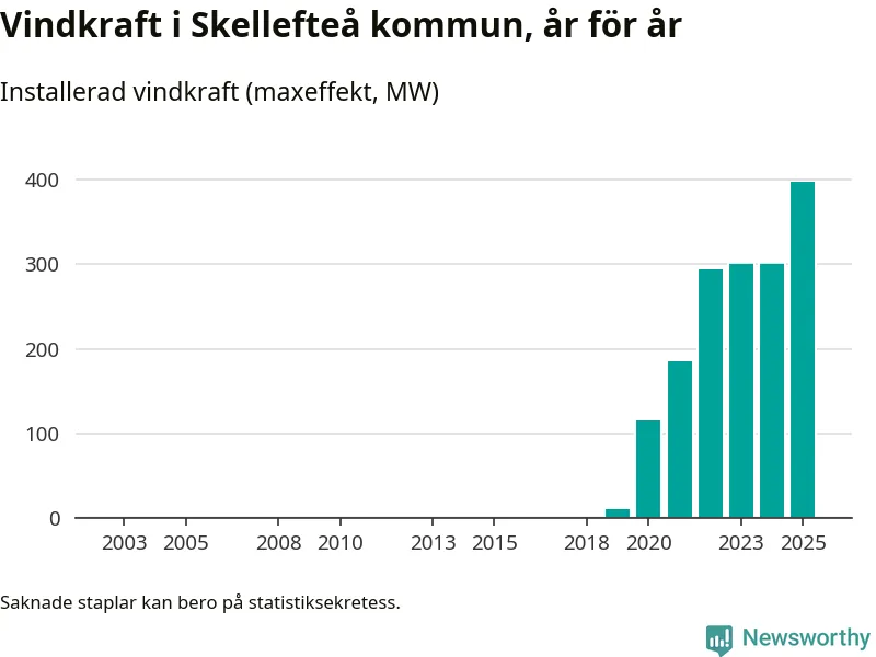 Totalt fanns i slutet av förra året 80 vindkraftverk i Skellefteå kommun, med en sammanlagd maxeffekt på 398 megawatt. Det är en ökning med 98 megawatt, eller 33 procent, jämfört med året innan. Det visar nya siffror från Energimyndigheten.
