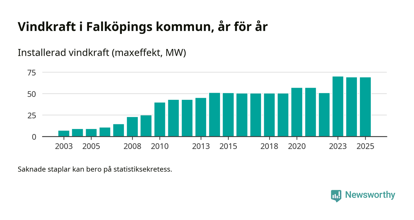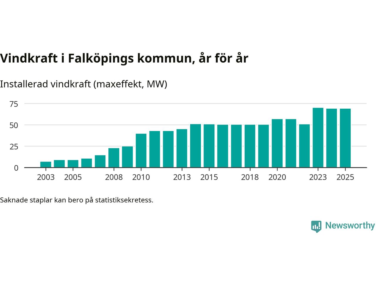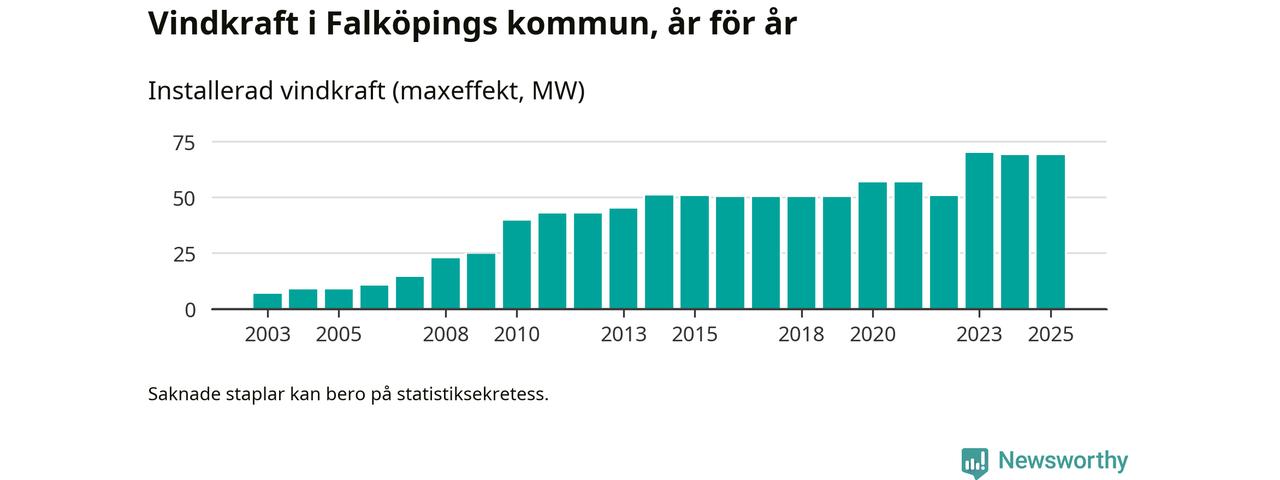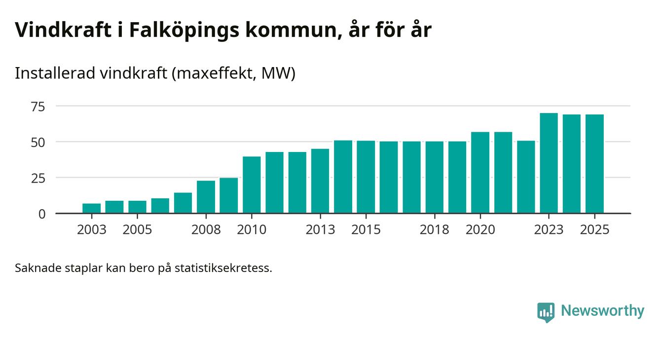 Totalt fanns i slutet av förra året 39 vindkraftverk i Falköpings kommun, med en sammanlagd maxeffekt på 69 megawatt. Det är oförändrade siffror jämfört med året innan. Det visar nya siffror från Energimyndigheten.