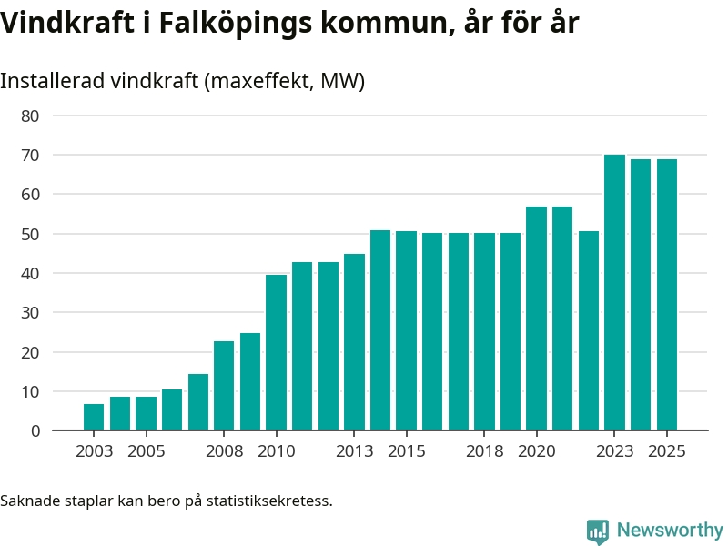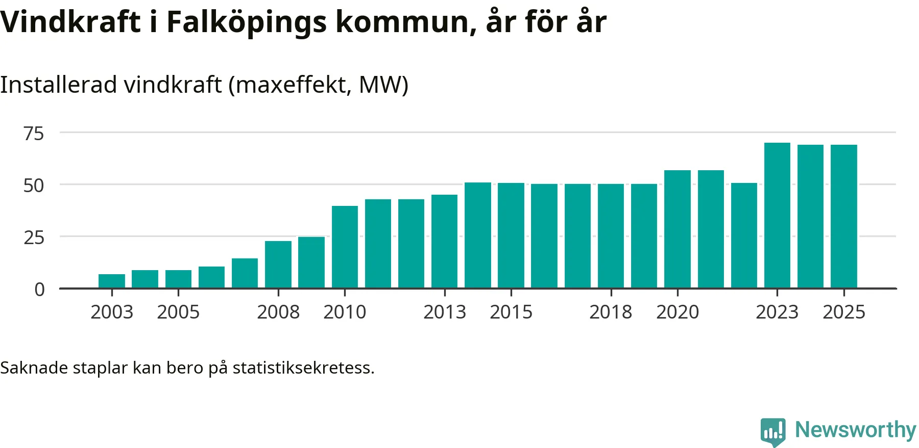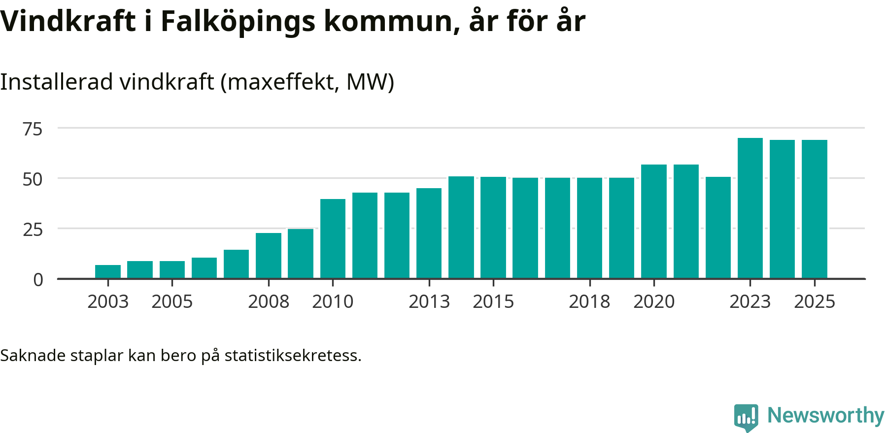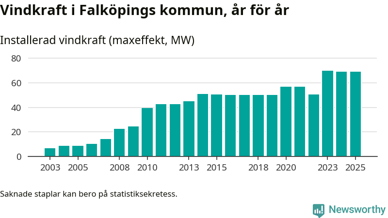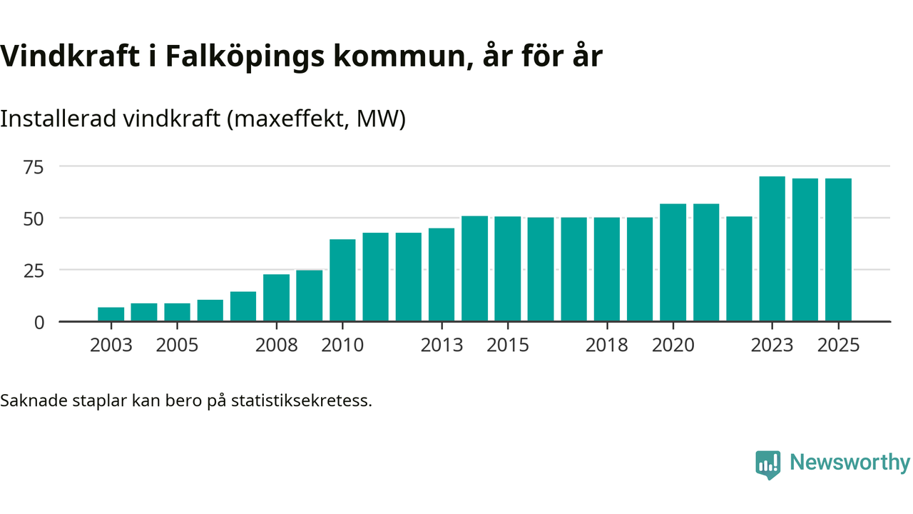 Totalt fanns i slutet av förra året 39 vindkraftverk i Falköpings kommun, med en sammanlagd maxeffekt på 69 megawatt. Det är oförändrade siffror jämfört med året innan. Det visar nya siffror från Energimyndigheten.