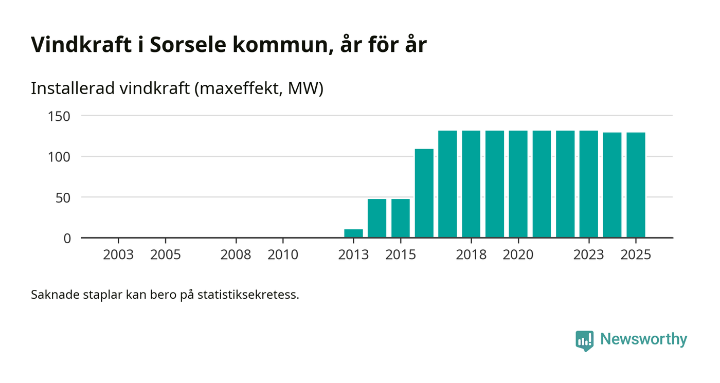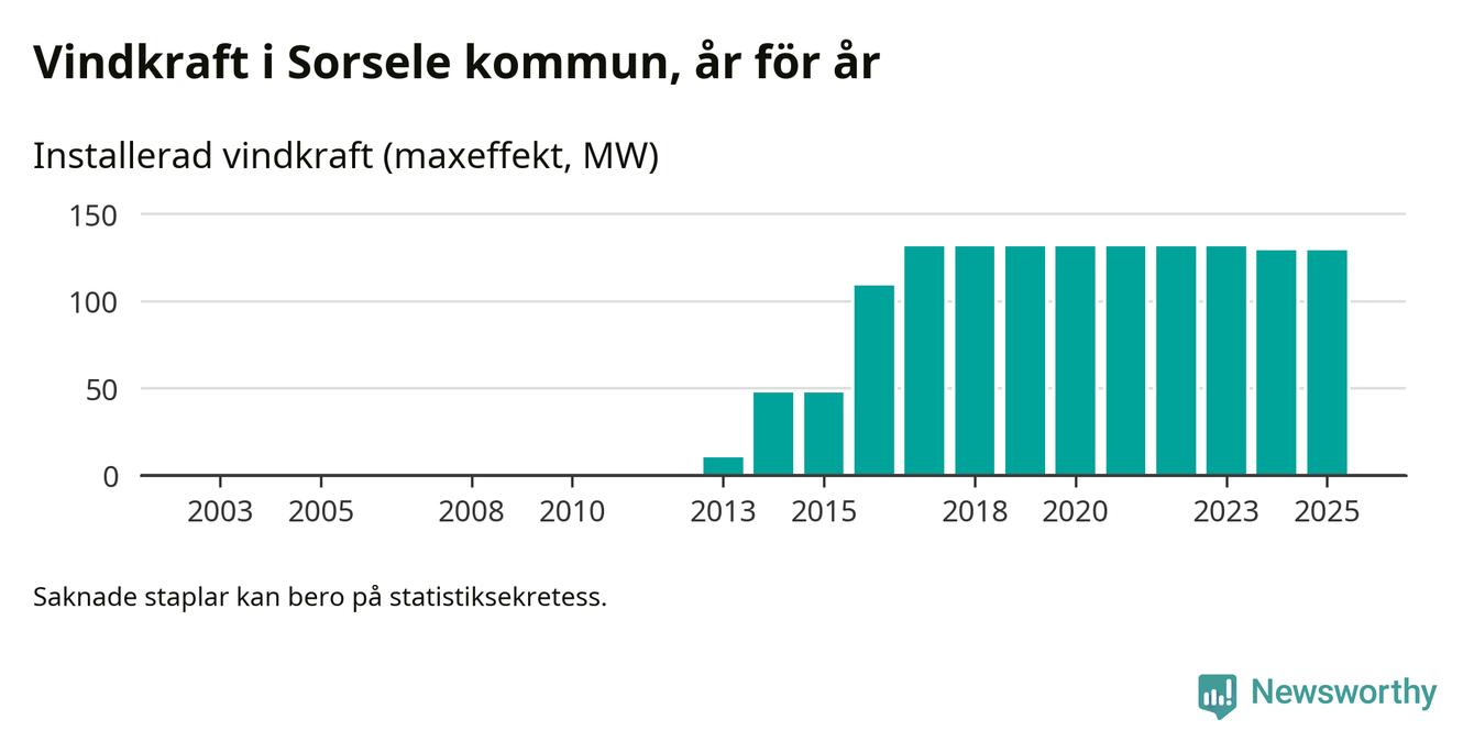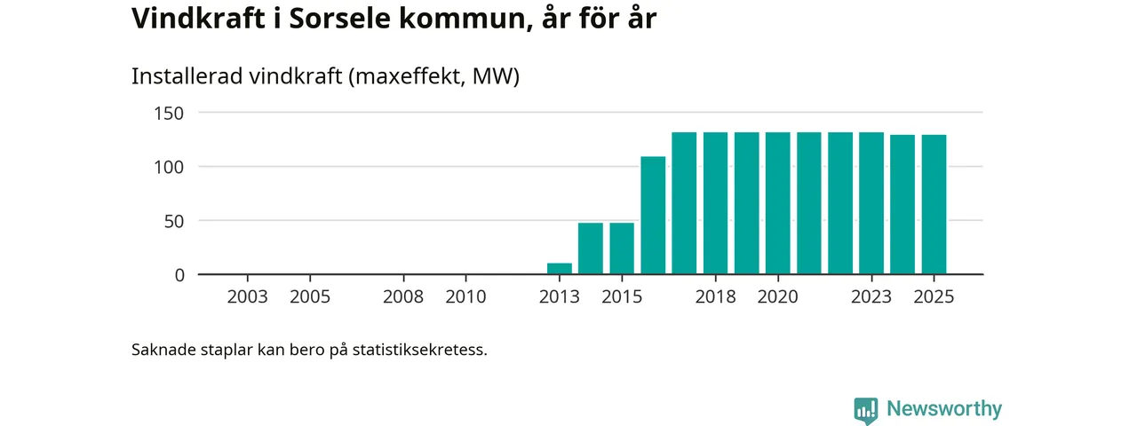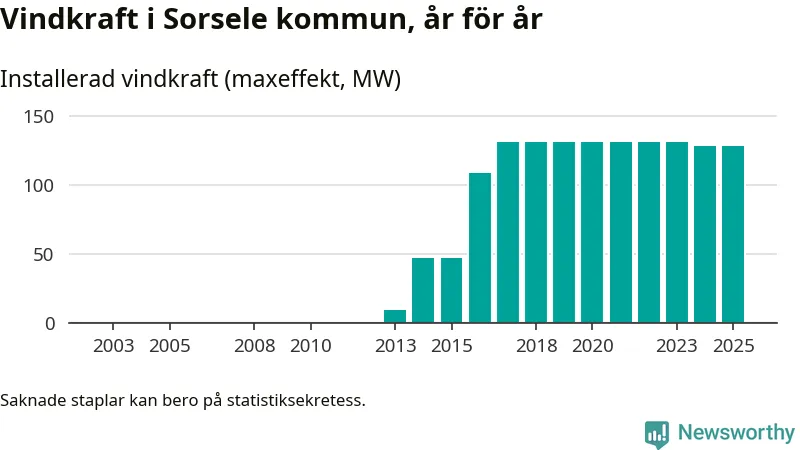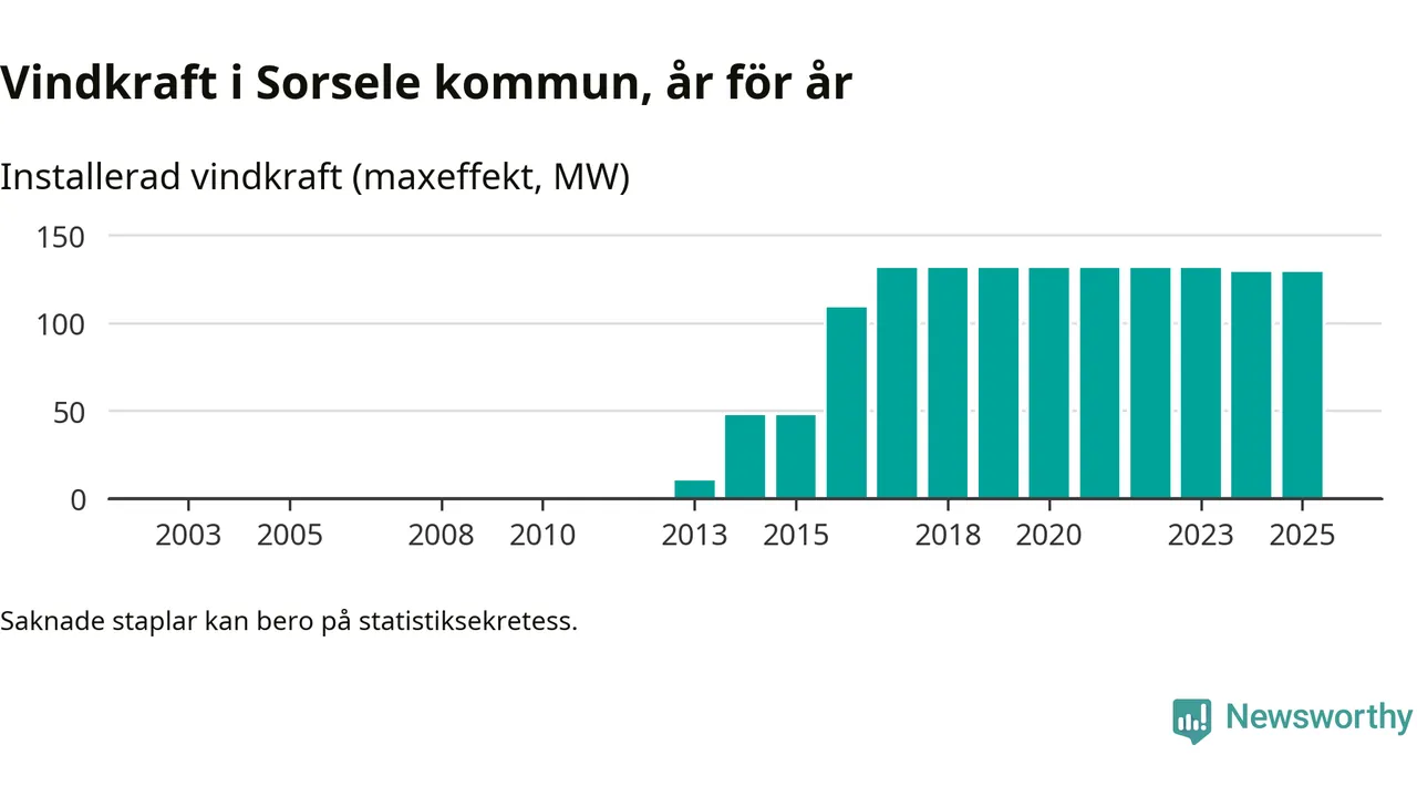 Totalt fanns i slutet av förra året 49 vindkraftverk i Sorsele kommun, med en sammanlagd maxeffekt på 129 megawatt. Det är oförändrade siffror jämfört med året innan. Det visar nya siffror från Energimyndigheten.