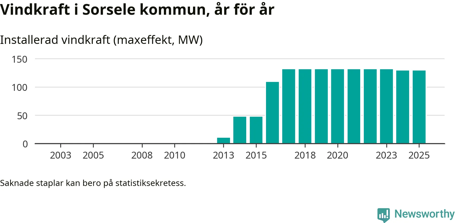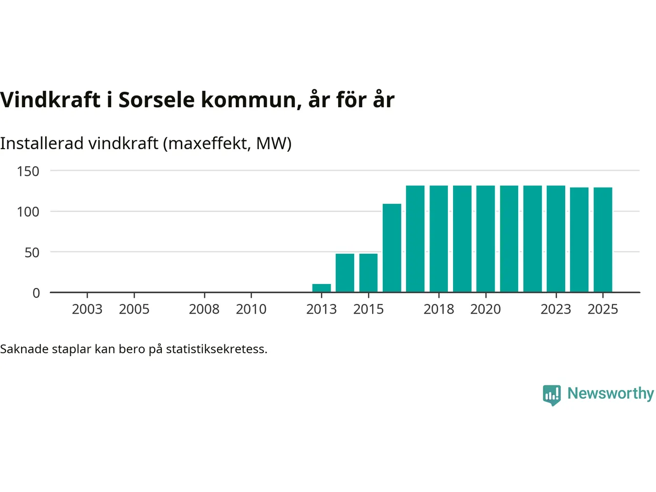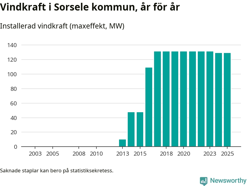Totalt fanns i slutet av förra året 49 vindkraftverk i Sorsele kommun, med en sammanlagd maxeffekt på 129 megawatt. Det är oförändrade siffror jämfört med året innan. Det visar nya siffror från Energimyndigheten.