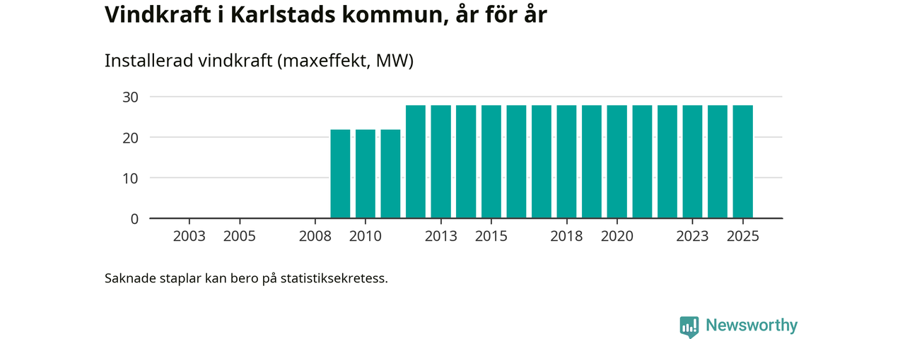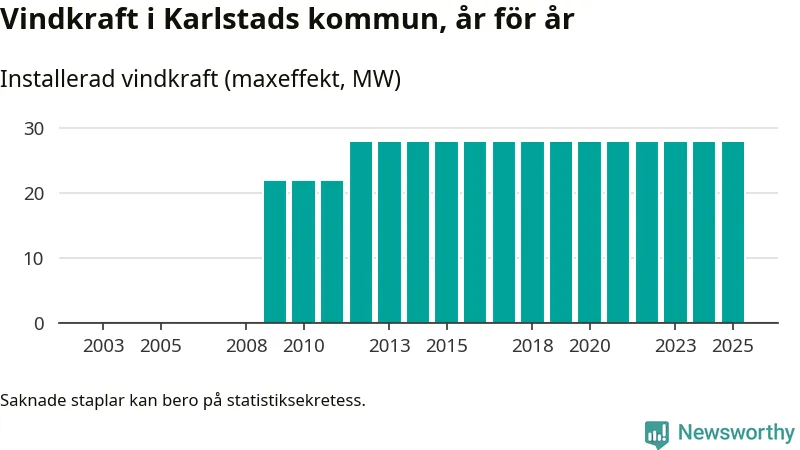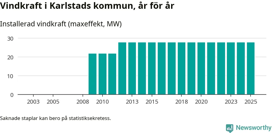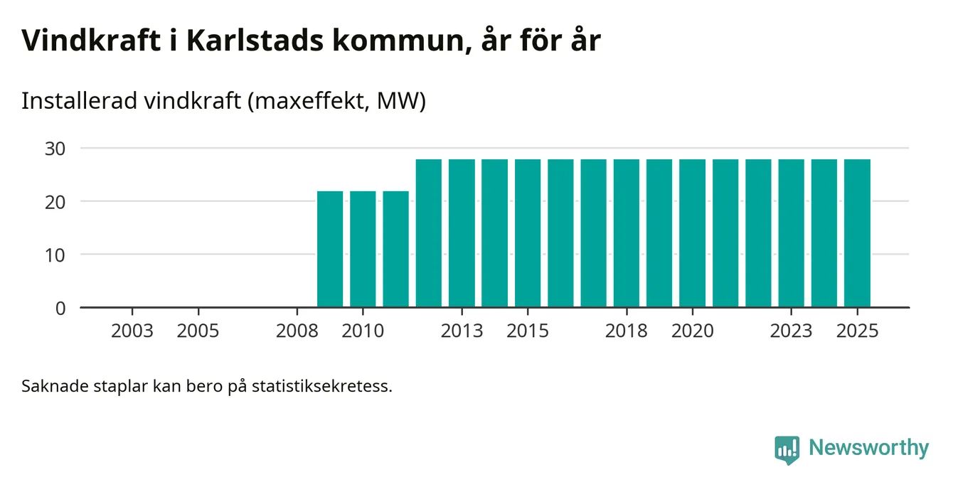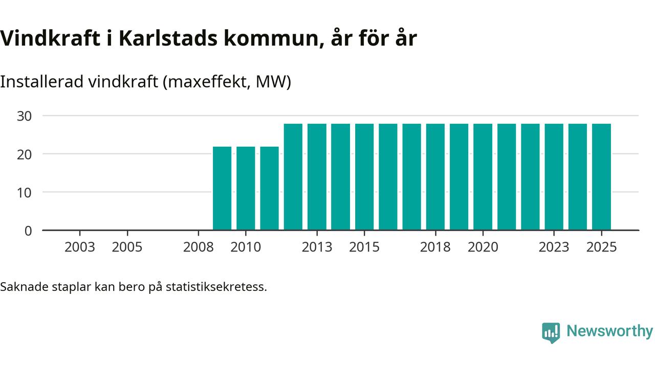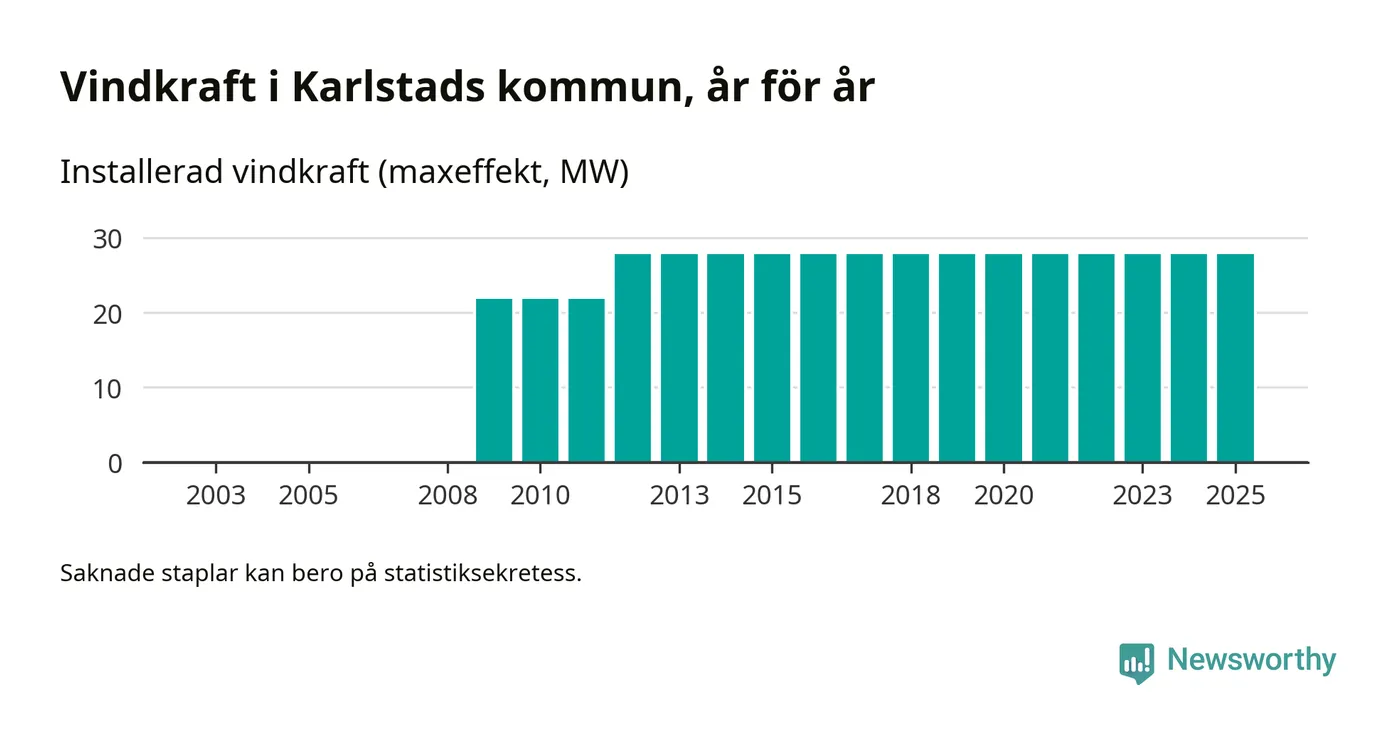 Totalt fanns i slutet av förra året tio vindkraftverk i Karlstads kommun, med en sammanlagd maxeffekt på 28 megawatt. Det är, för 13:e året i rad, oförändrade siffror jämfört med året innan. Det visar nya siffror från Energimyndigheten.