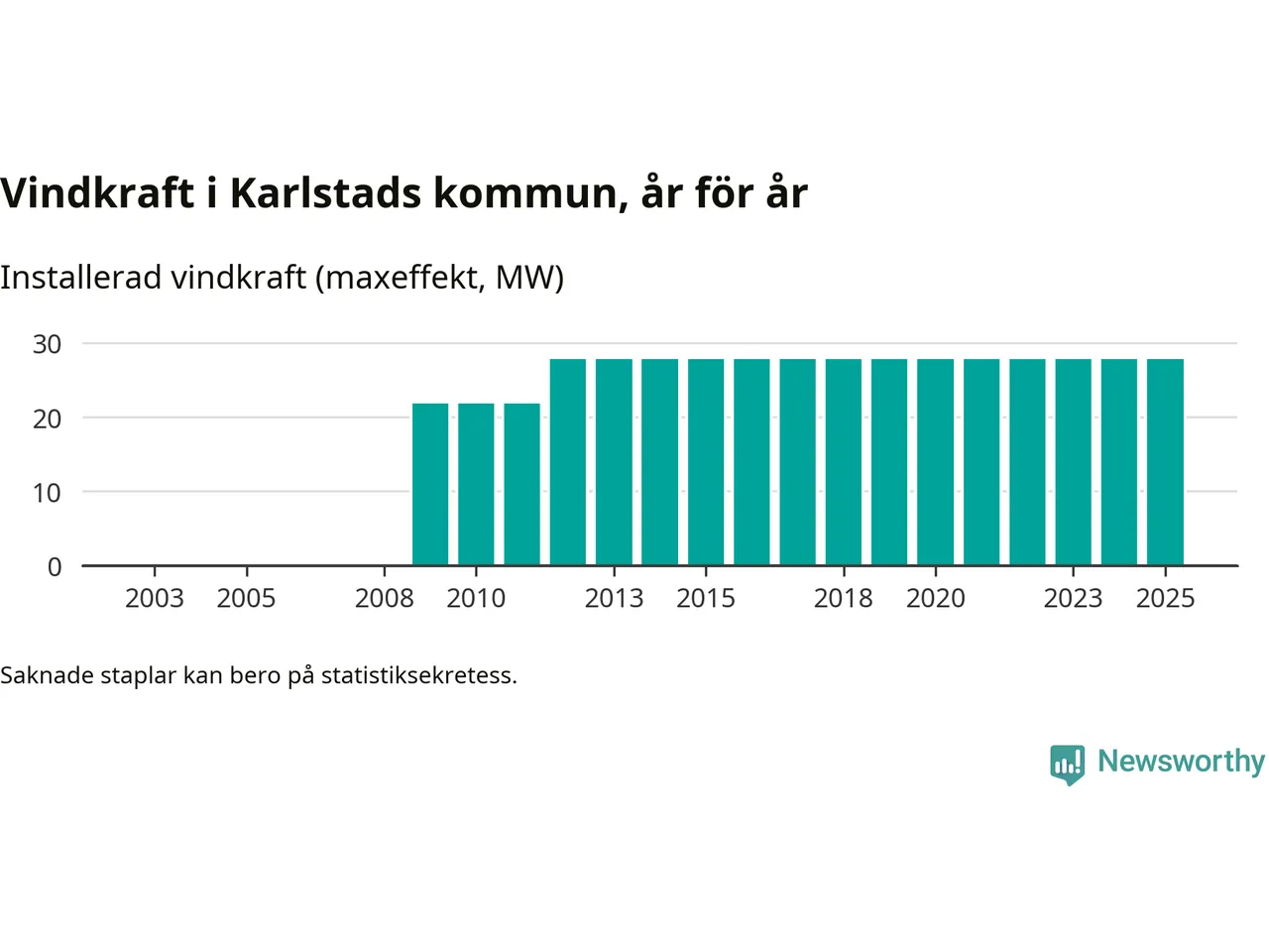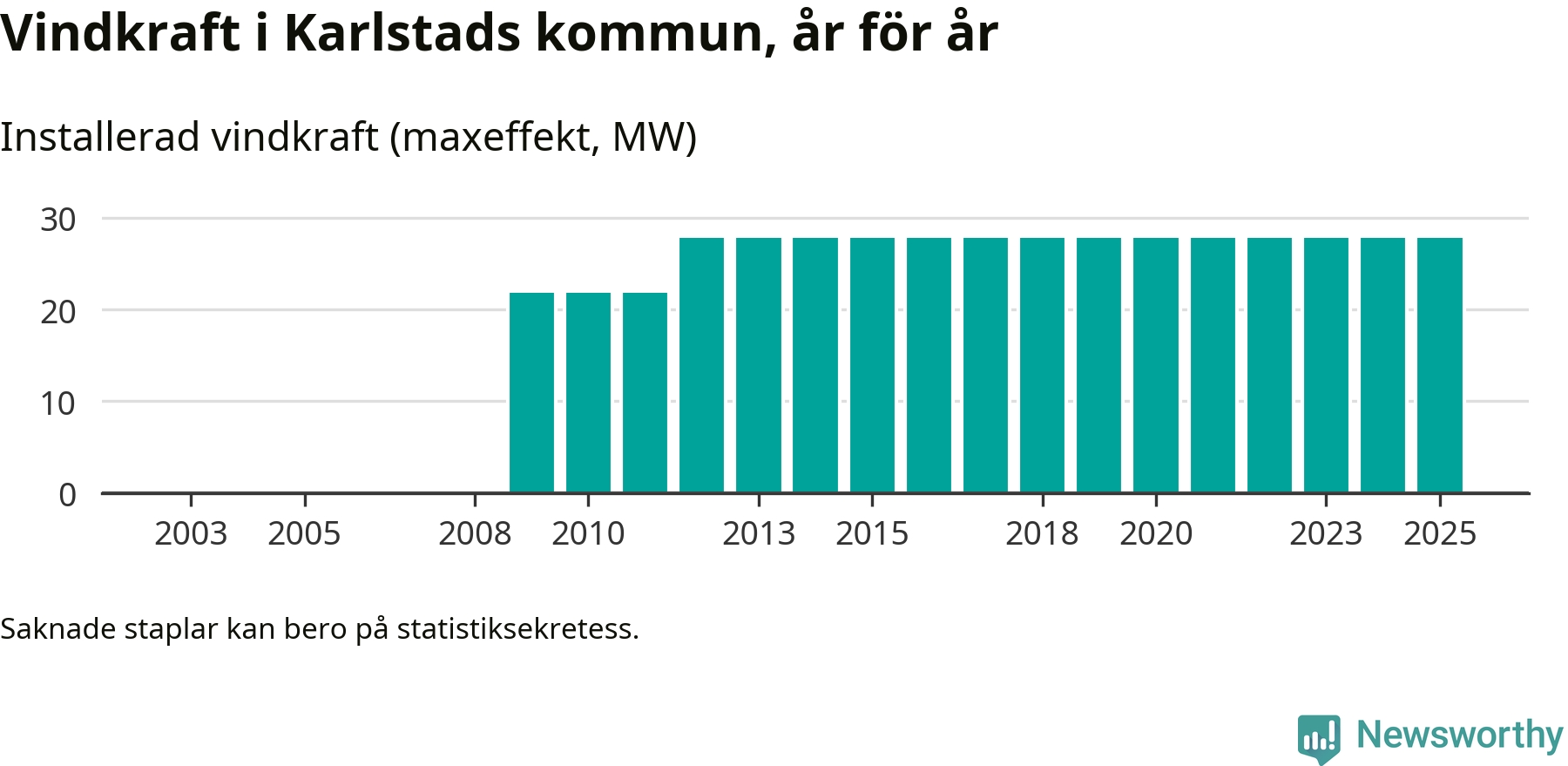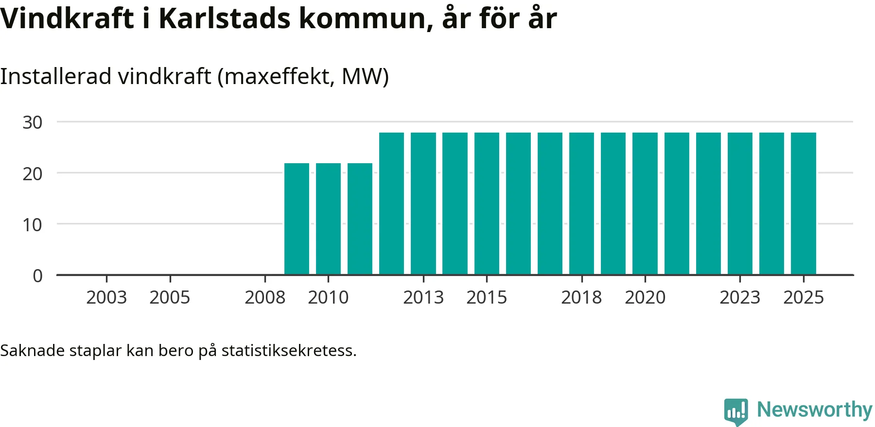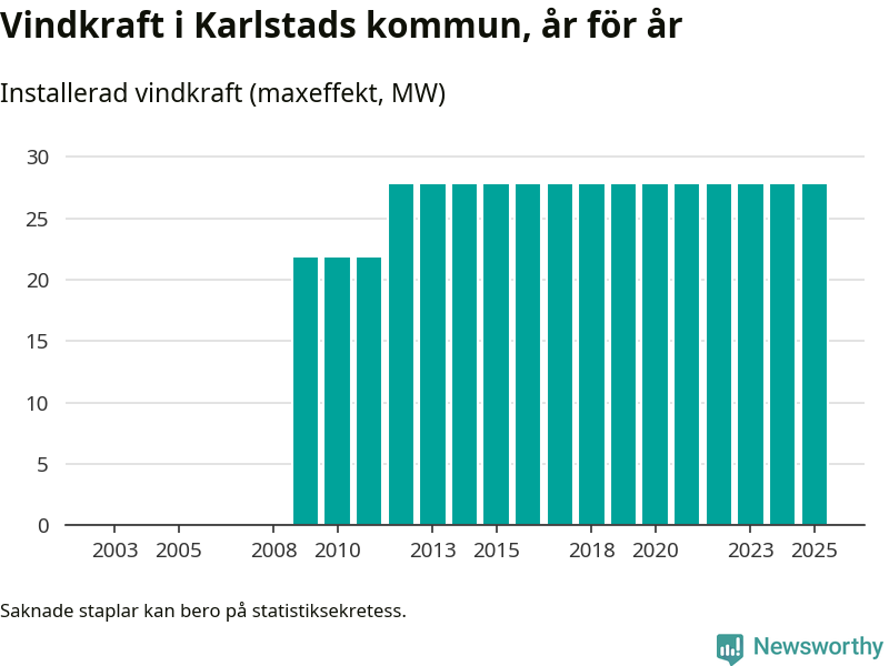 Totalt fanns i slutet av förra året tio vindkraftverk i Karlstads kommun, med en sammanlagd maxeffekt på 28 megawatt. Det är, för 13:e året i rad, oförändrade siffror jämfört med året innan. Det visar nya siffror från Energimyndigheten.