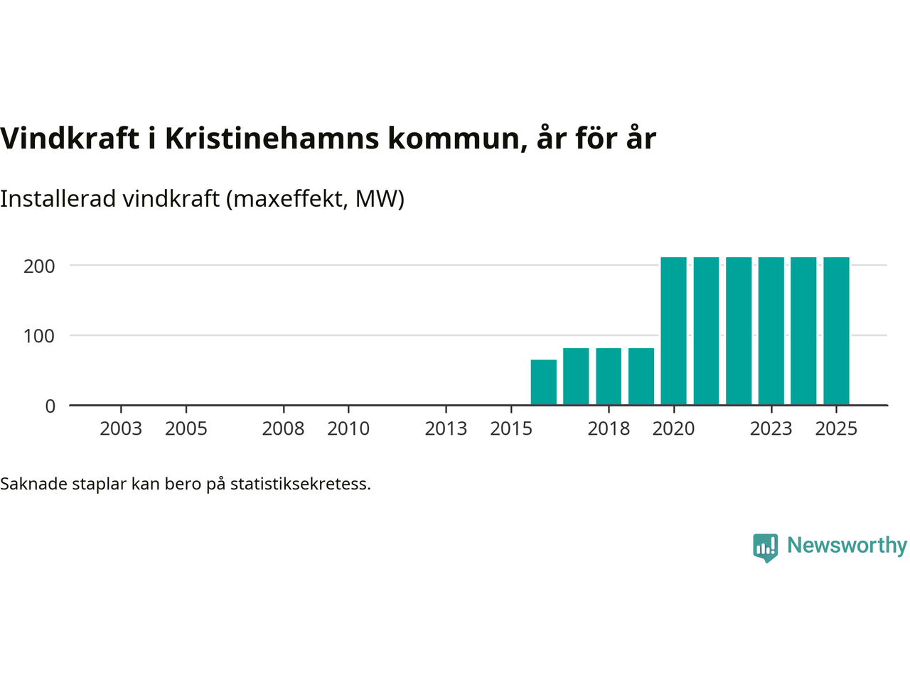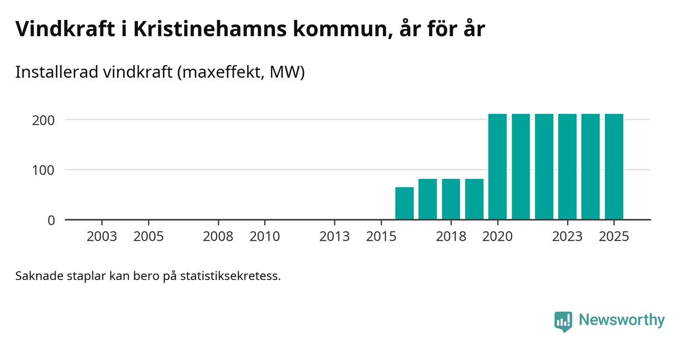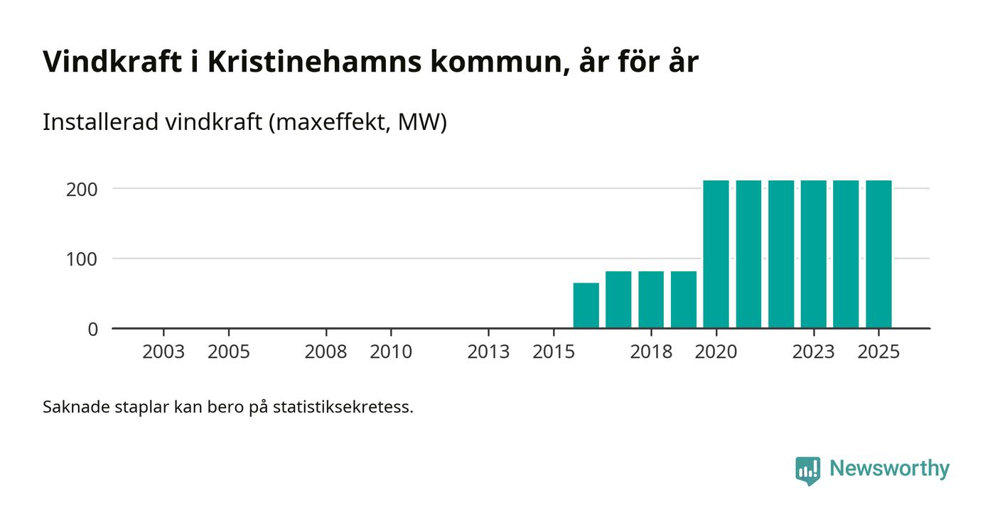 Totalt fanns i slutet av förra året 57 vindkraftverk i Kristinehamns kommun, med en sammanlagd maxeffekt på 211 megawatt. Det är, för femte året i rad, oförändrade siffror jämfört med året innan. Det visar nya siffror från Energimyndigheten.