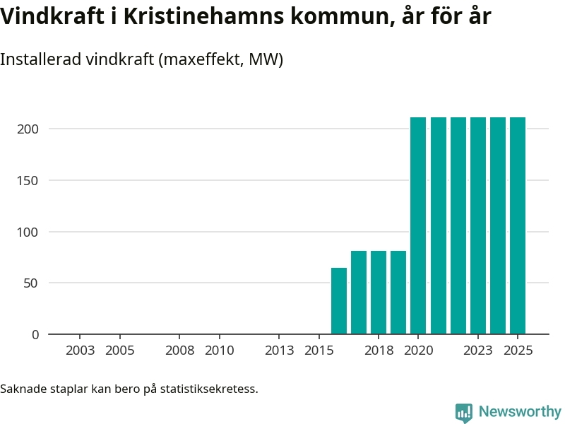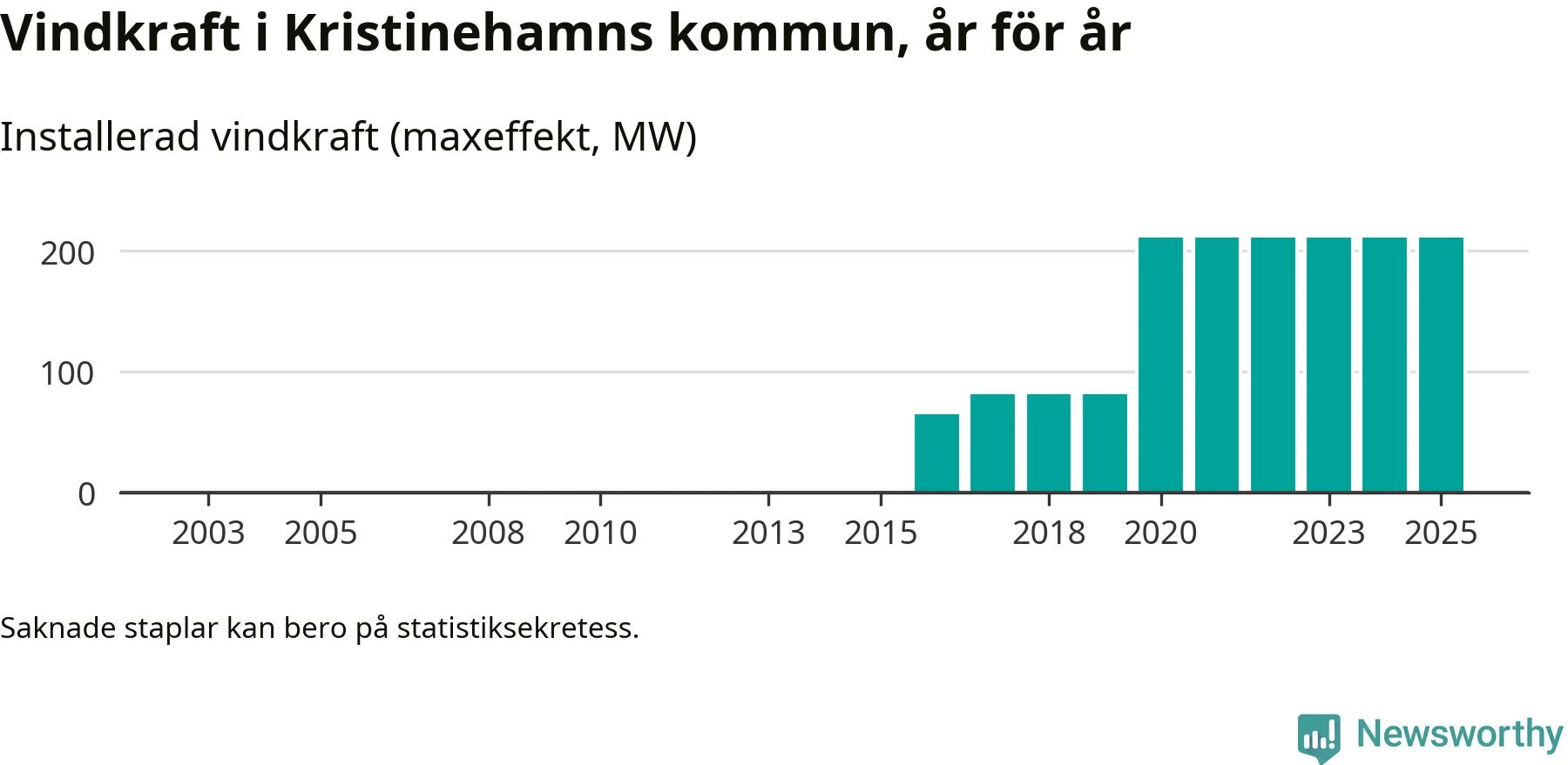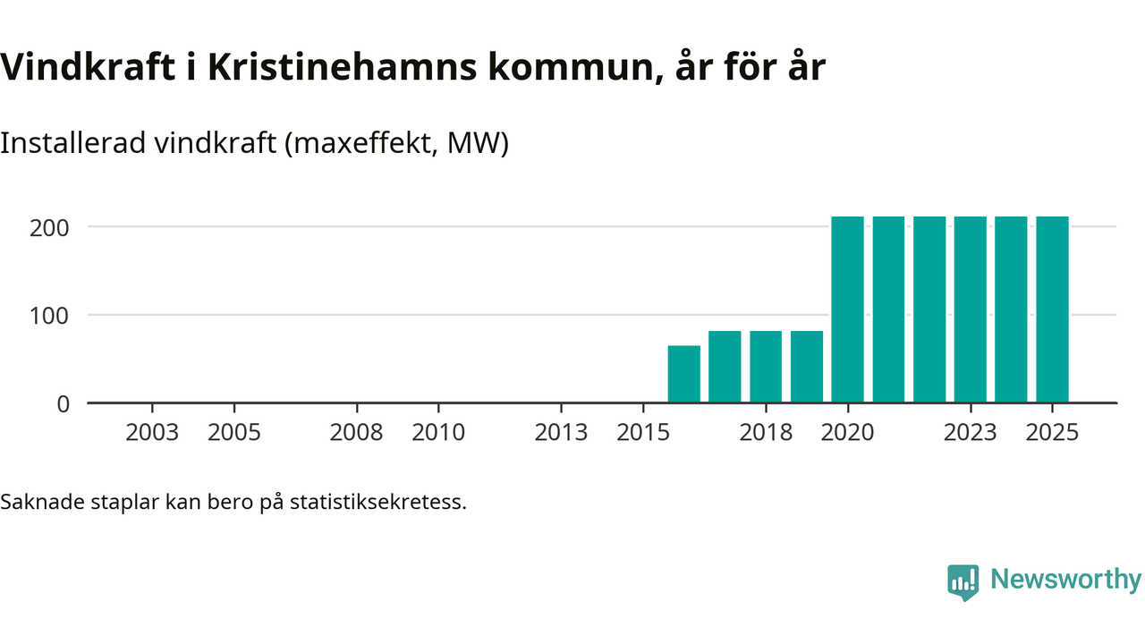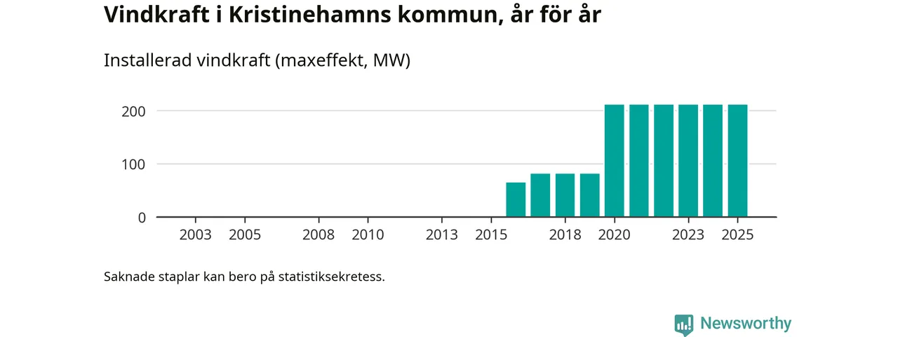 Totalt fanns i slutet av förra året 57 vindkraftverk i Kristinehamns kommun, med en sammanlagd maxeffekt på 211 megawatt. Det är, för femte året i rad, oförändrade siffror jämfört med året innan. Det visar nya siffror från Energimyndigheten.