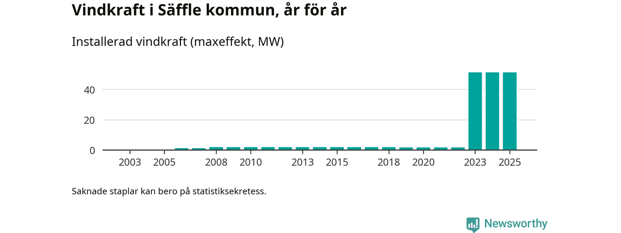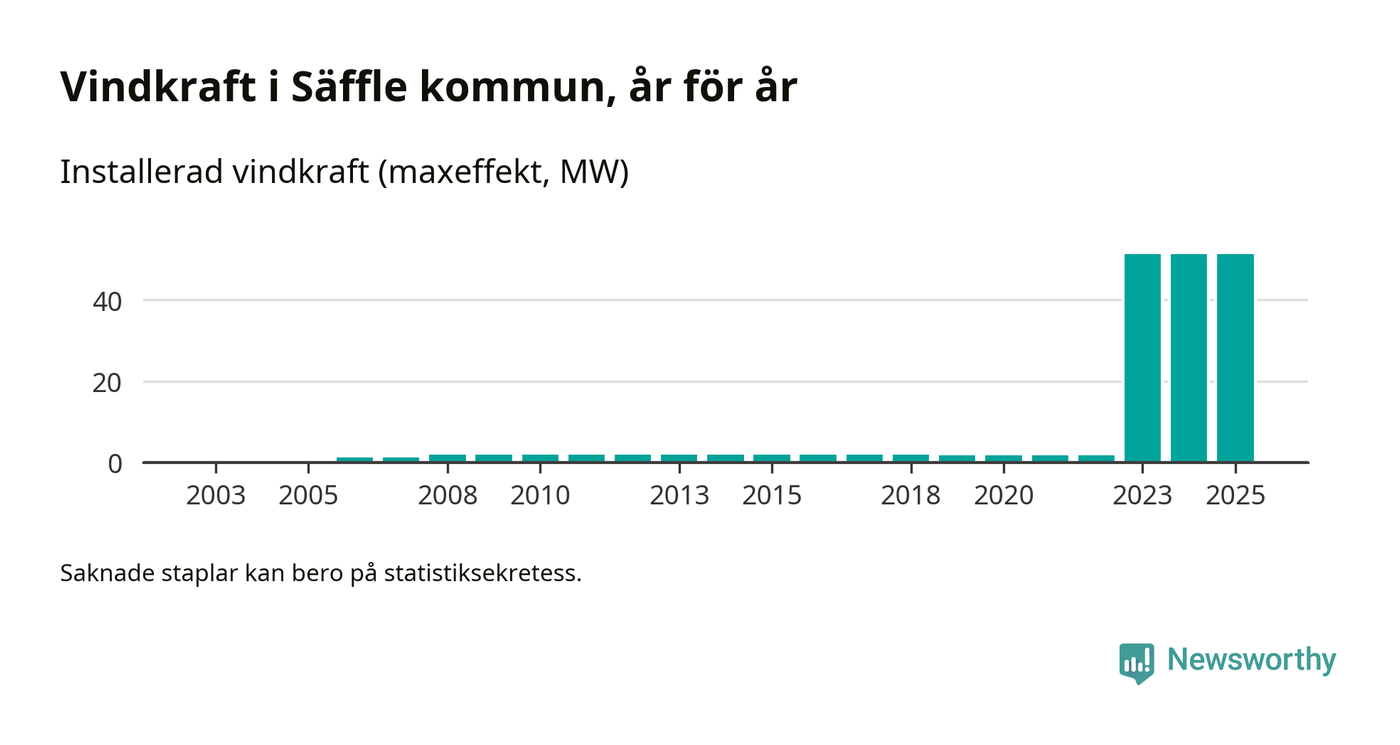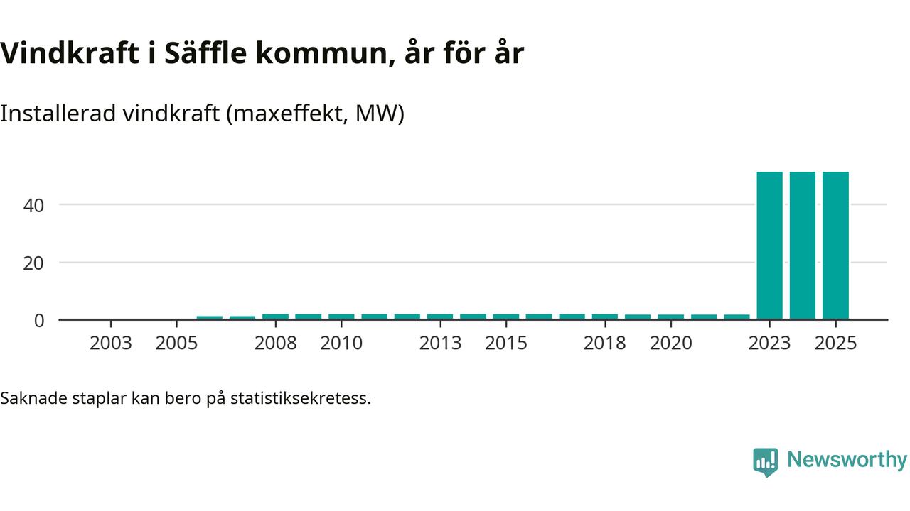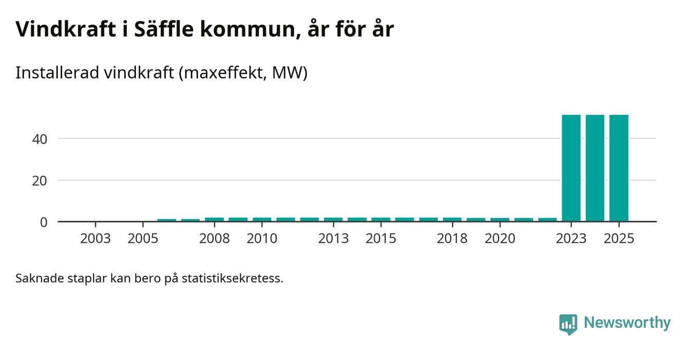 Totalt fanns i slutet av förra året elva vindkraftverk i Säffle kommun, med en sammanlagd maxeffekt på 51 megawatt. Det är, för andra året i rad, oförändrade siffror jämfört med året innan. Det visar nya siffror från Energimyndigheten.