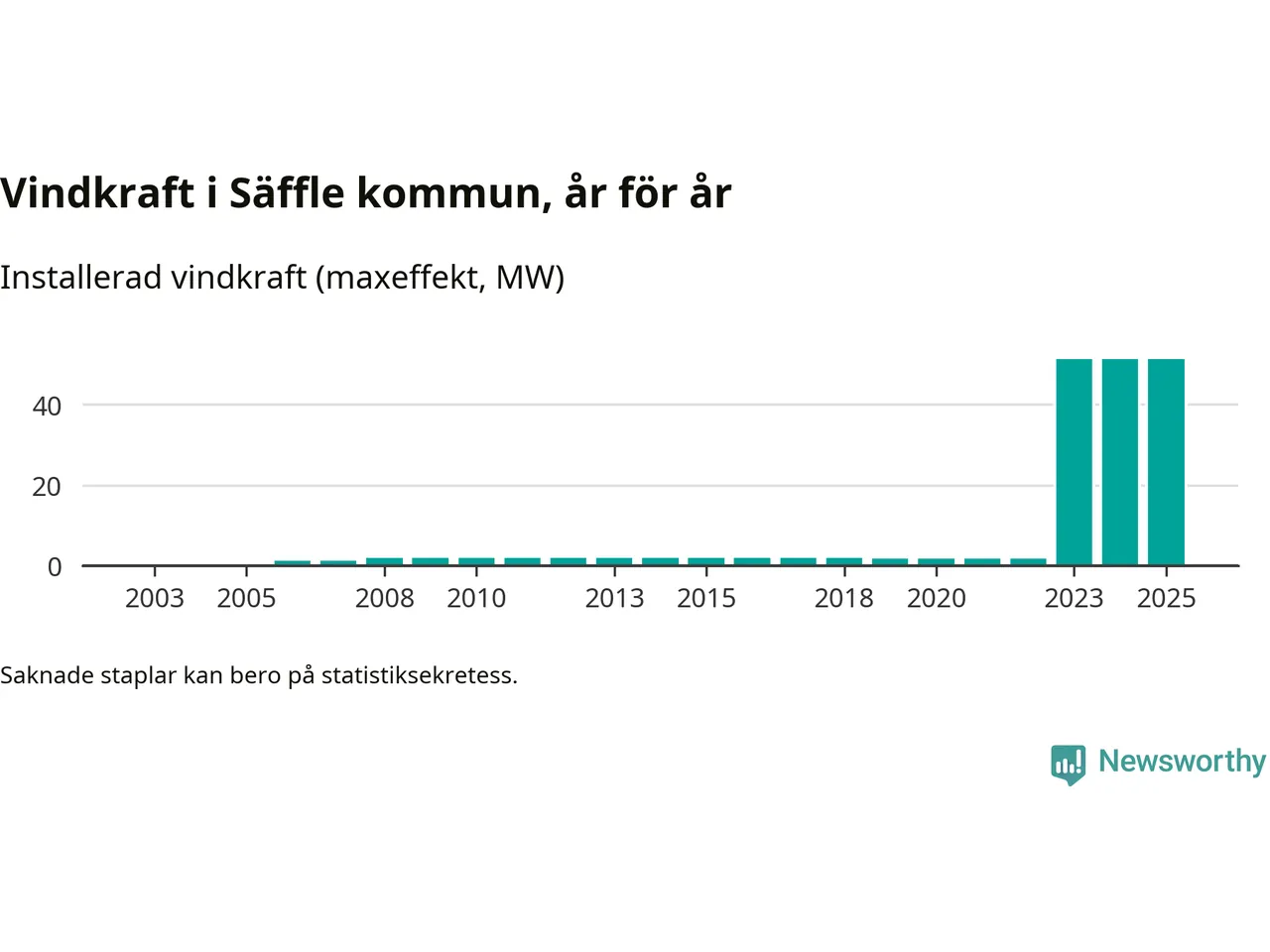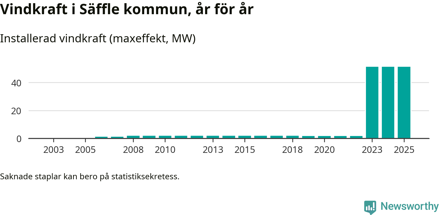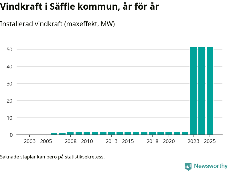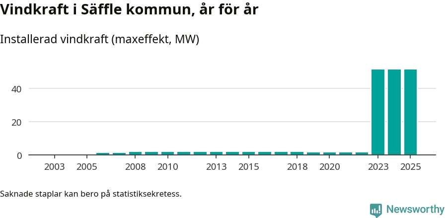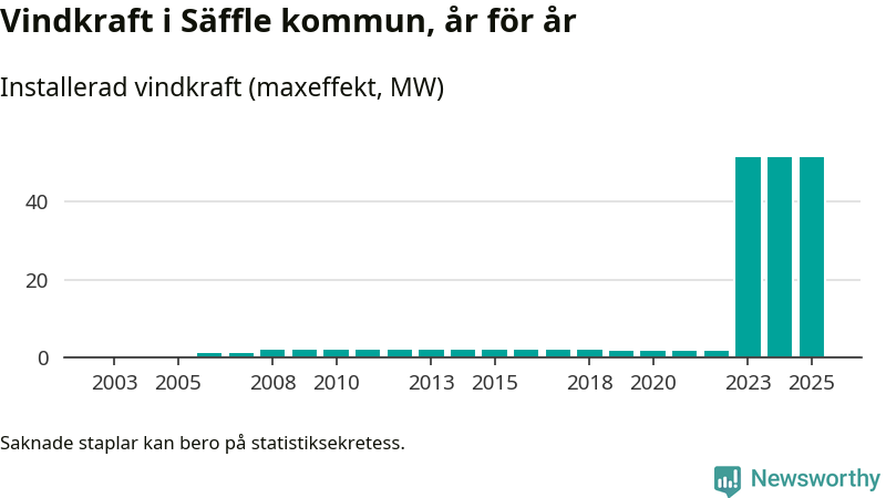 Totalt fanns i slutet av förra året elva vindkraftverk i Säffle kommun, med en sammanlagd maxeffekt på 51 megawatt. Det är, för andra året i rad, oförändrade siffror jämfört med året innan. Det visar nya siffror från Energimyndigheten.