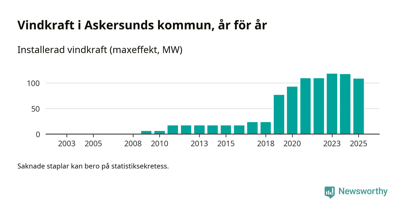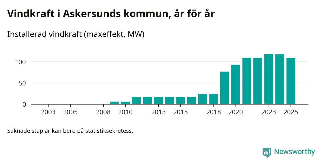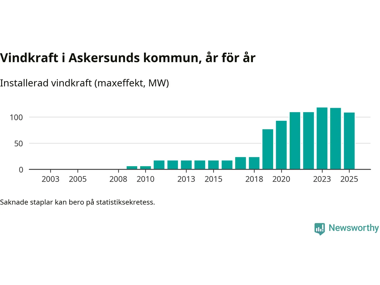 Totalt fanns i slutet av förra året 35 vindkraftverk i Askersunds kommun, med en sammanlagd maxeffekt på 108 megawatt. Det är en minskning med nio megawatt 1, jämfört med året innan. Det visar nya siffror från Energimyndigheten.
