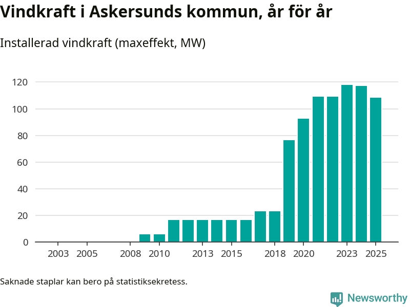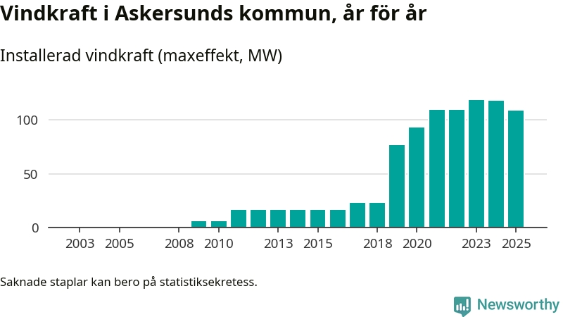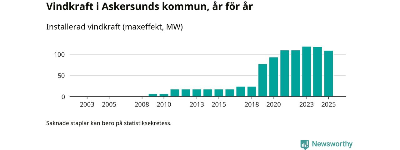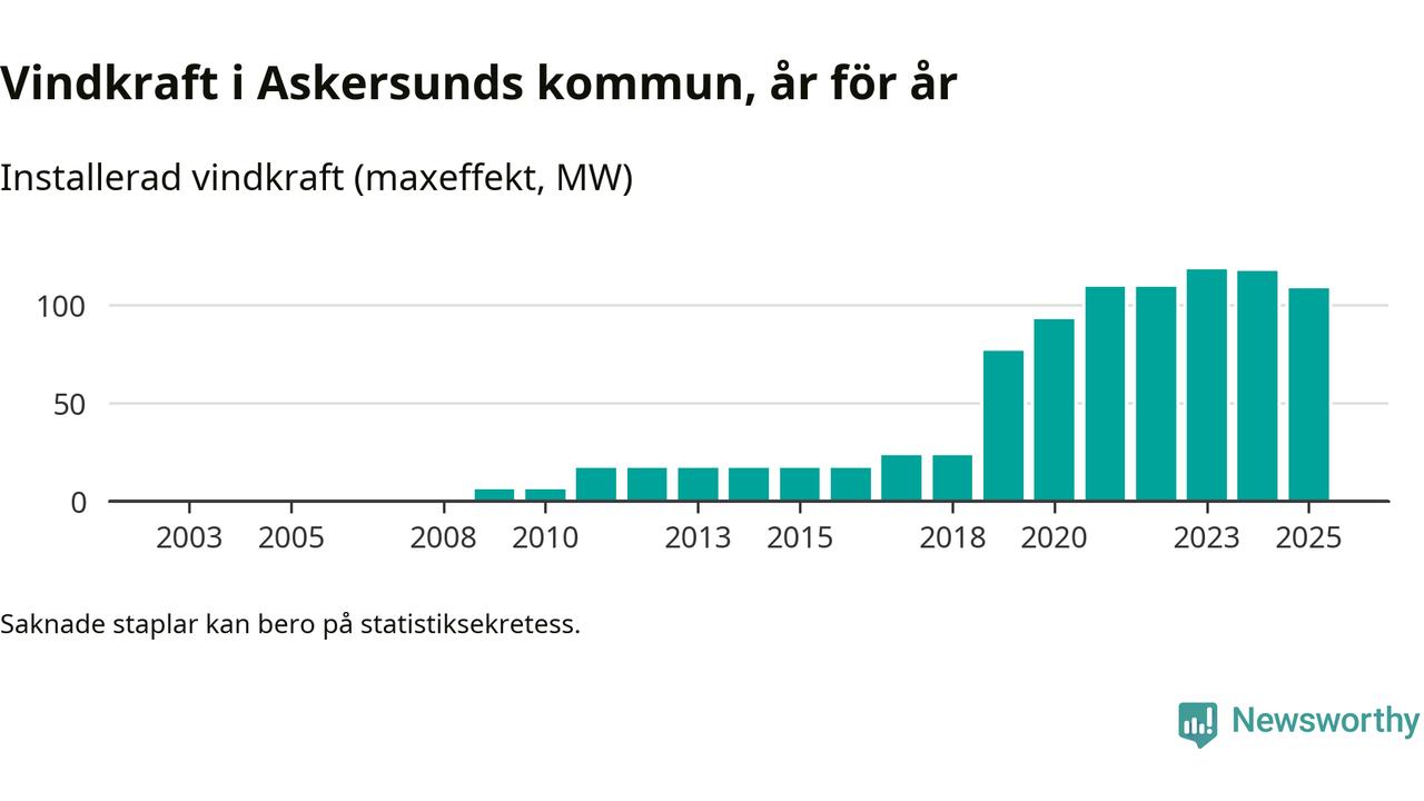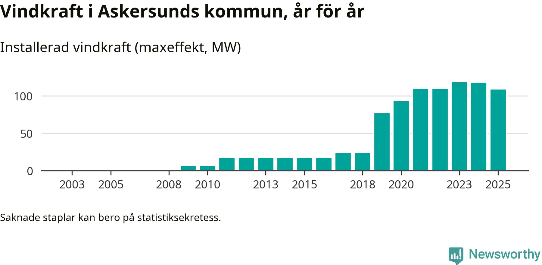 Totalt fanns i slutet av förra året 35 vindkraftverk i Askersunds kommun, med en sammanlagd maxeffekt på 108 megawatt. Det är en minskning med nio megawatt 1, jämfört med året innan. Det visar nya siffror från Energimyndigheten.