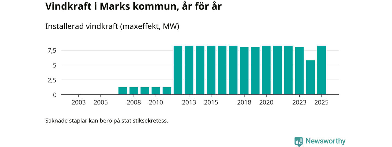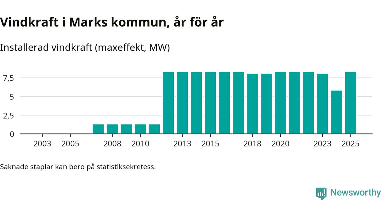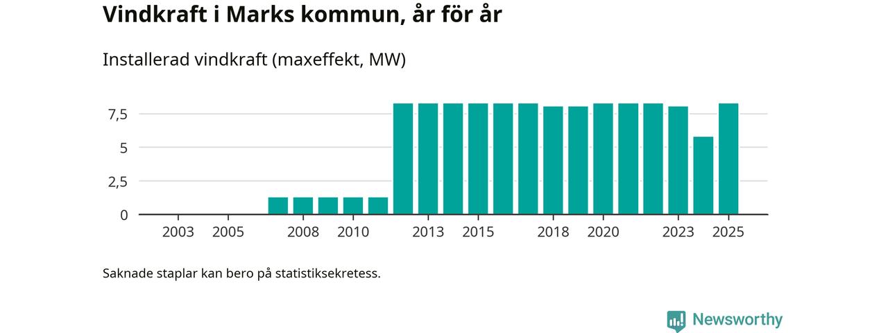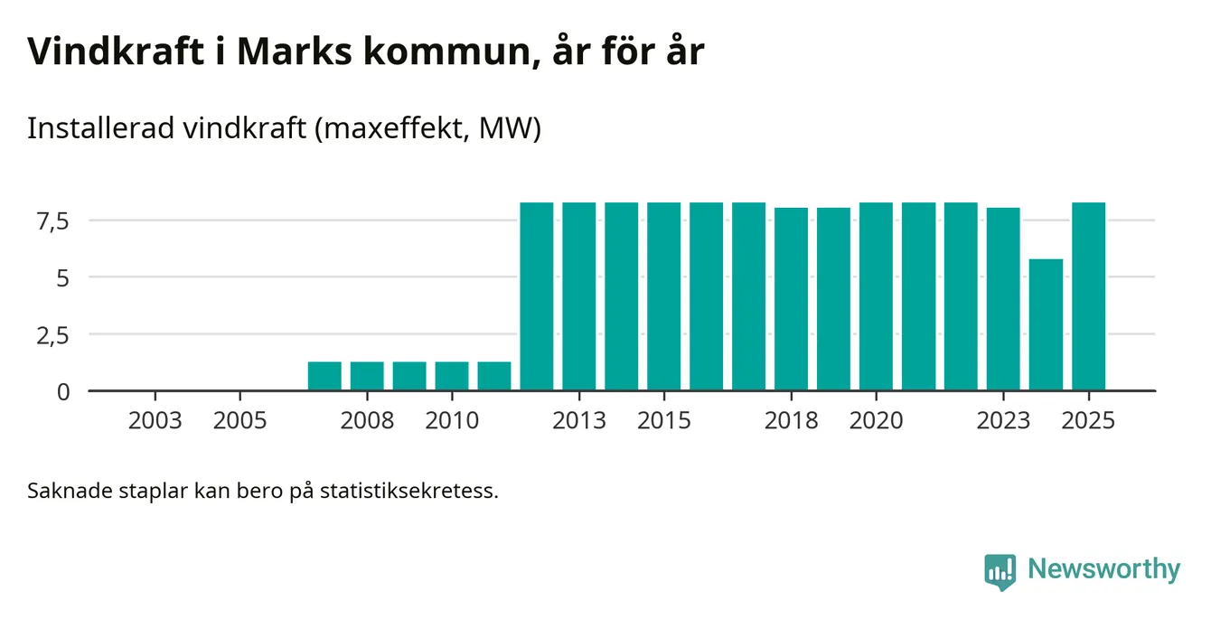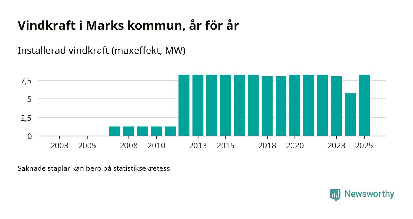 Totalt fanns i slutet av förra året sex vindkraftverk i Marks kommun, med en sammanlagd maxeffekt på 8 megawatt. Det är en liten ökning jämfört med året innan. Det visar nya siffror från Energimyndigheten.
