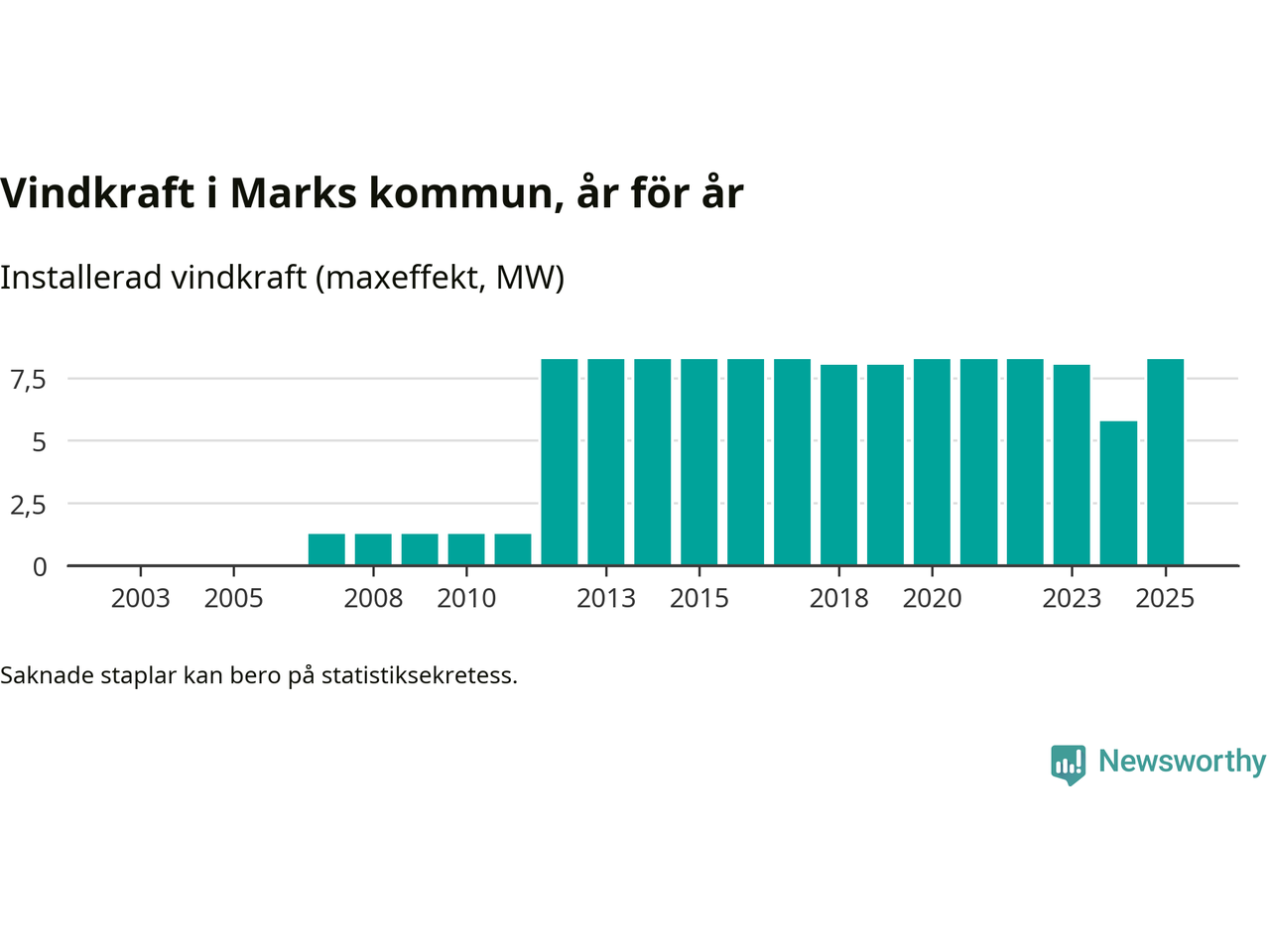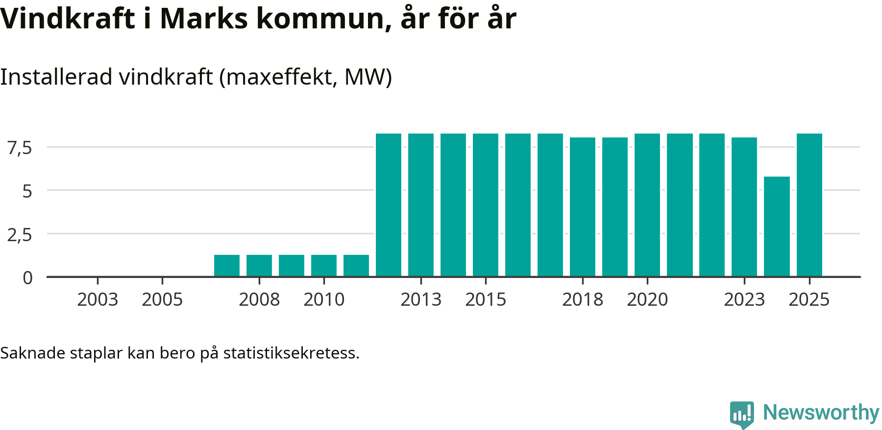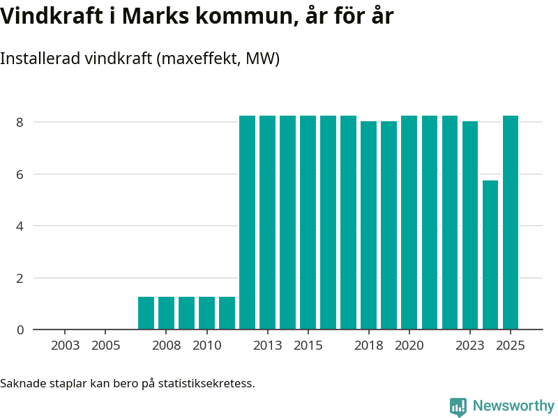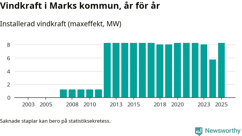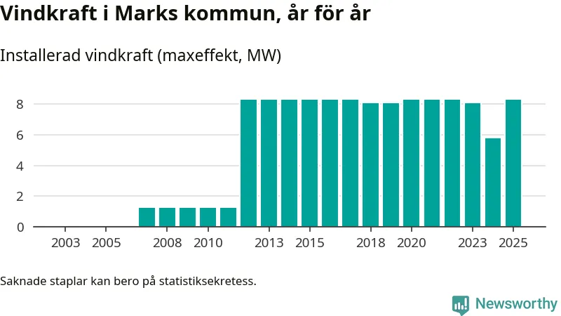 Totalt fanns i slutet av förra året sex vindkraftverk i Marks kommun, med en sammanlagd maxeffekt på 8 megawatt. Det är en liten ökning jämfört med året innan. Det visar nya siffror från Energimyndigheten.