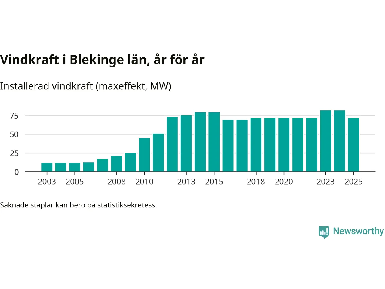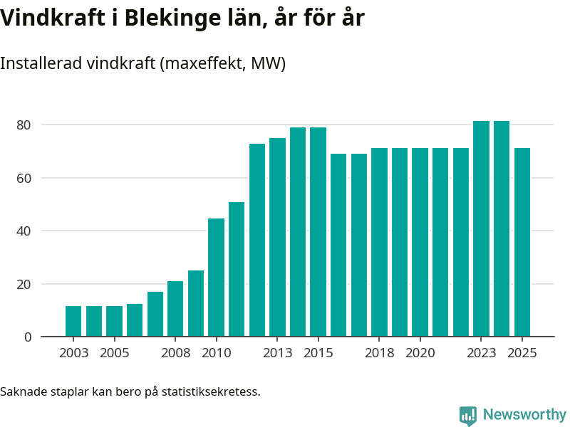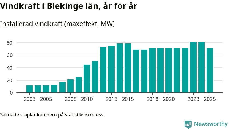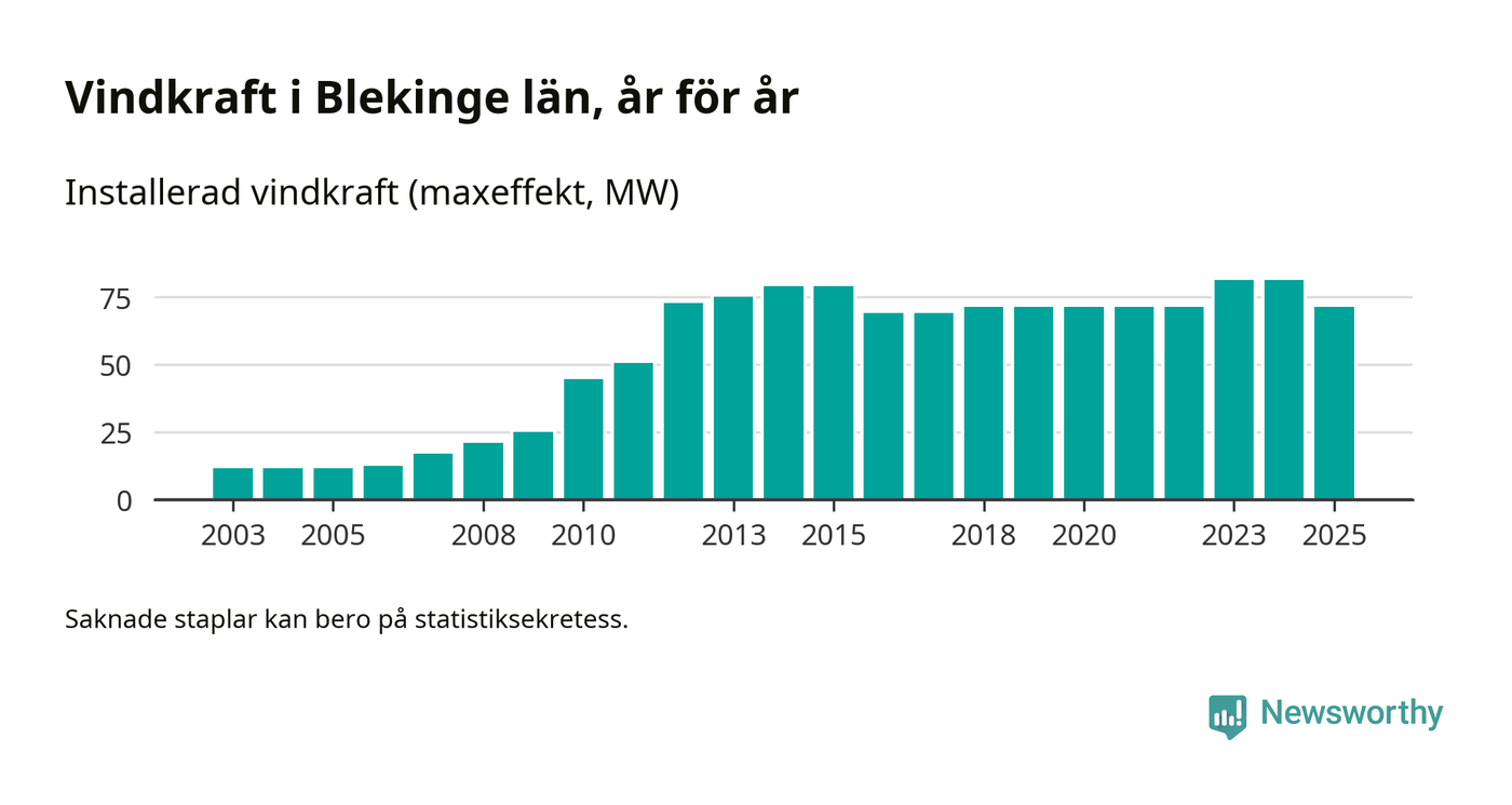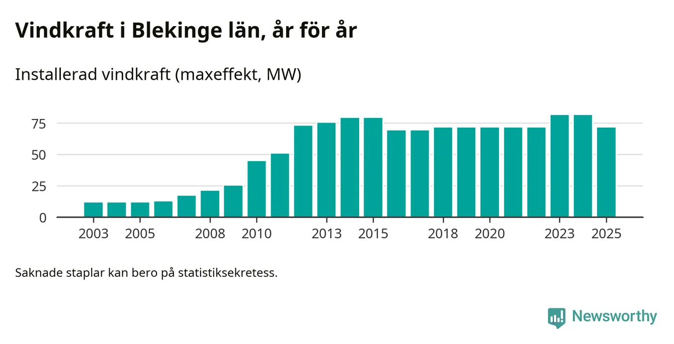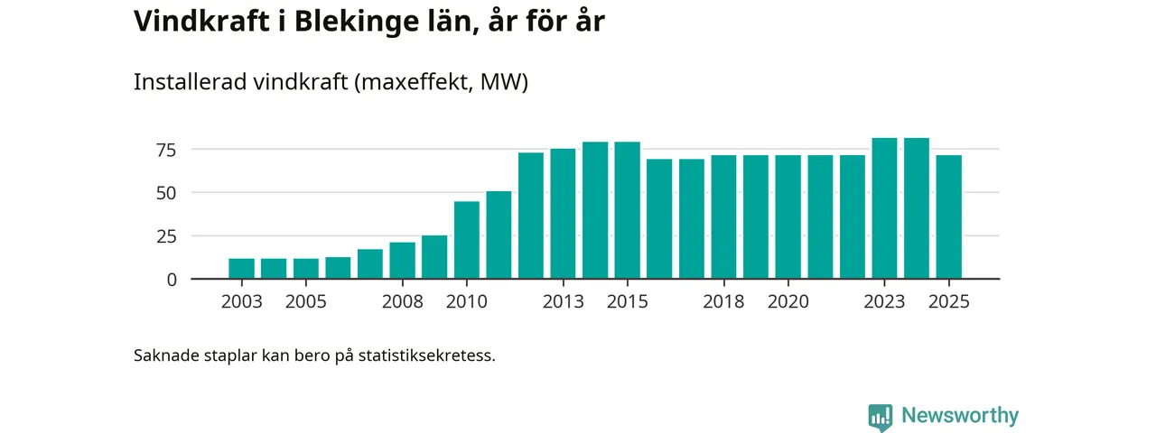 Totalt fanns i slutet av förra året 49 vindkraftverk i Blekinge län, med en sammanlagd maxeffekt på 71 megawatt. Det är en minskning med tio megawatt 1, jämfört med året innan. Det visar nya siffror från Energimyndigheten.