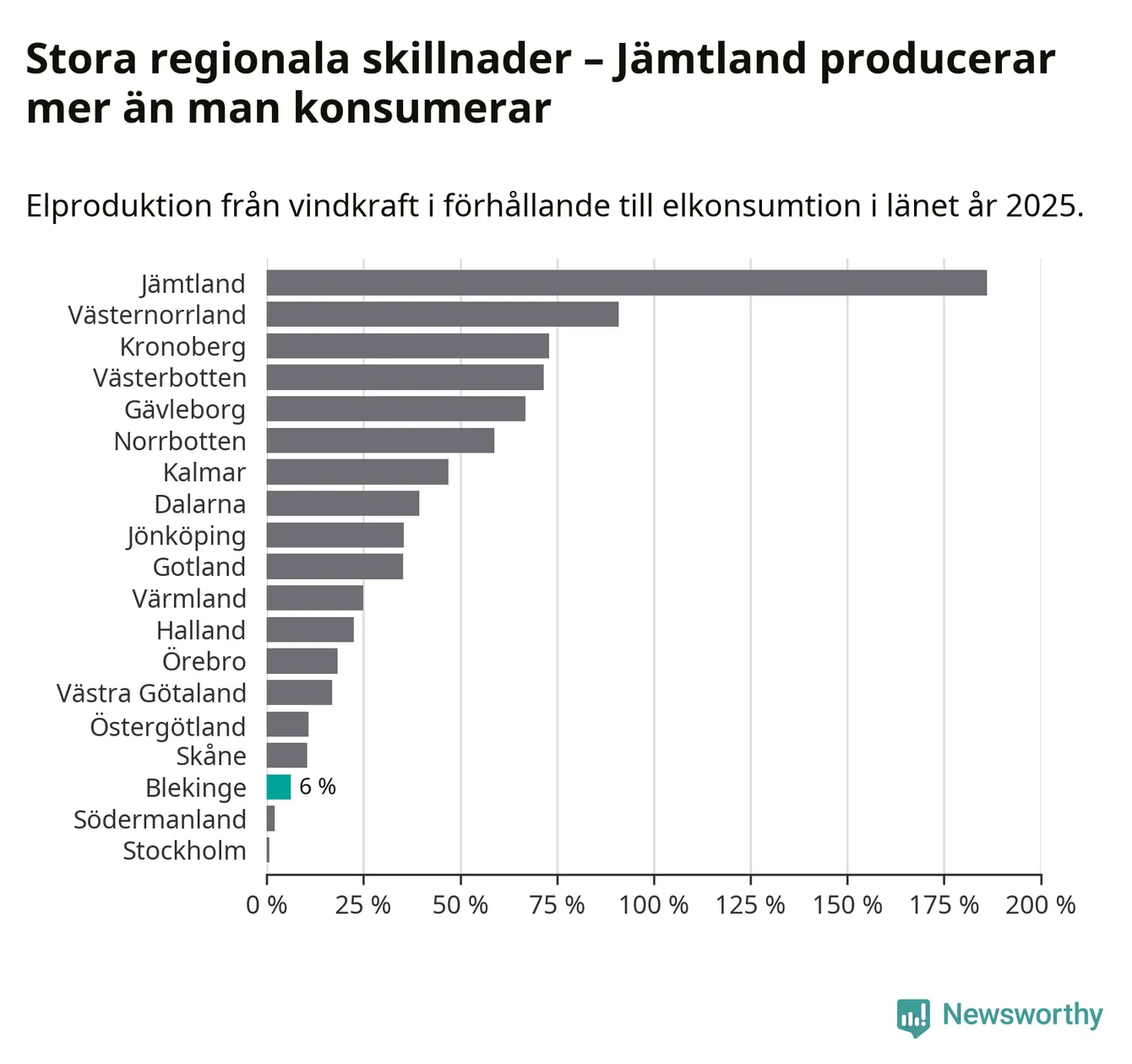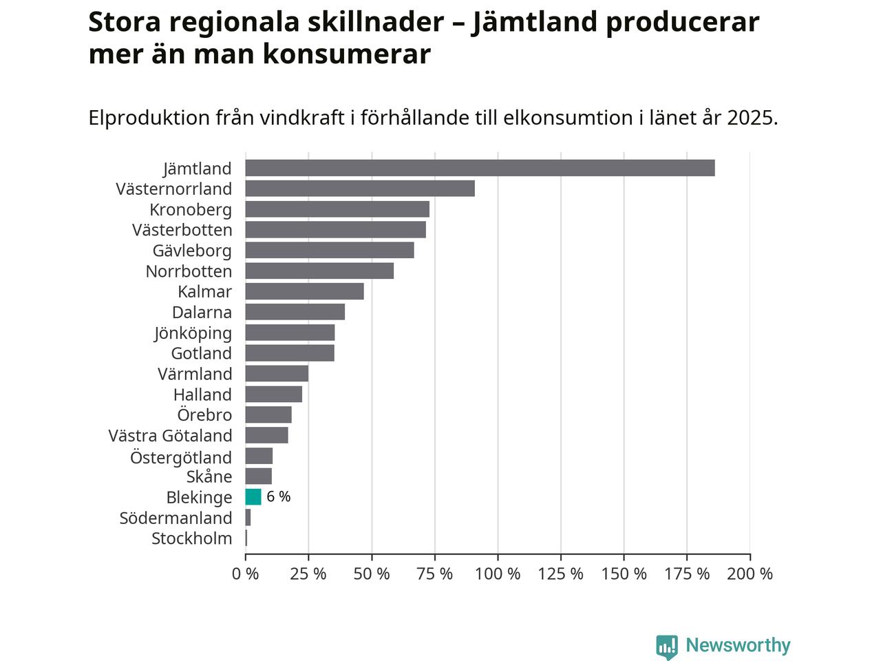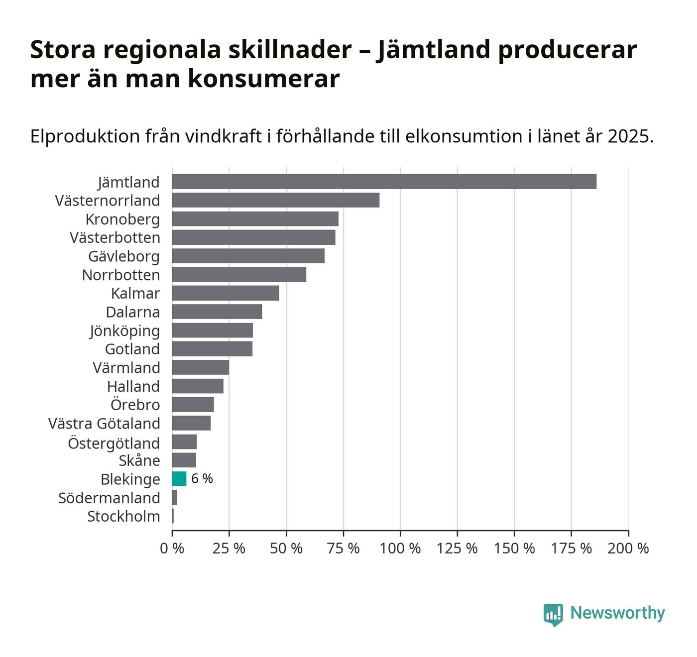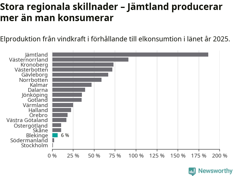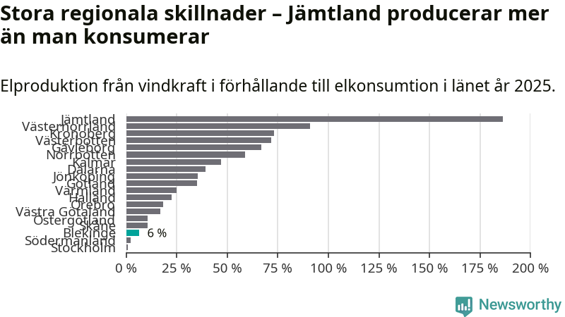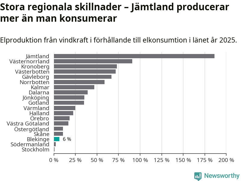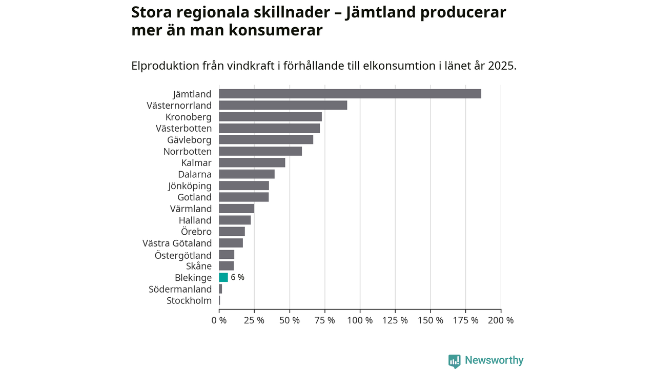 Störst installerad vindkraftseffekt bland landets län finns nu i Västernorrland, med 3 477 megawatt. Bland kommunerna i Blekinge ligger Sölvesborgs kommun i topp i effektligan.