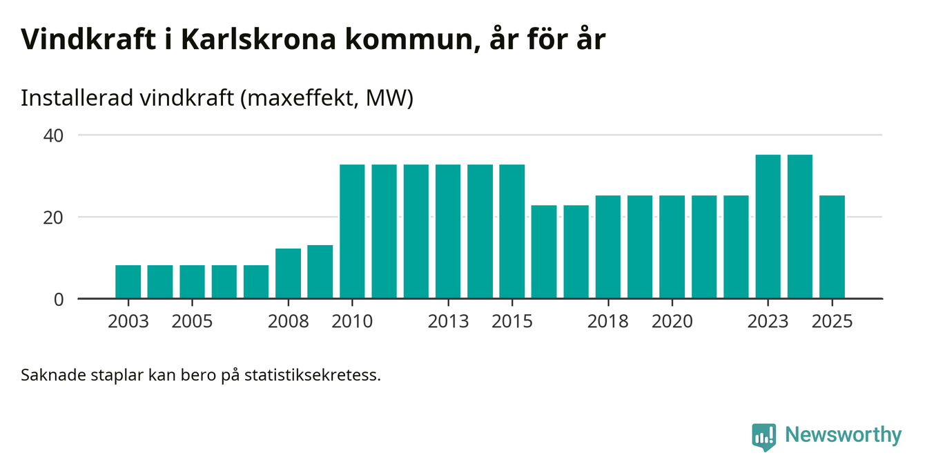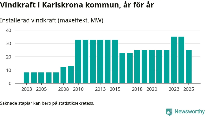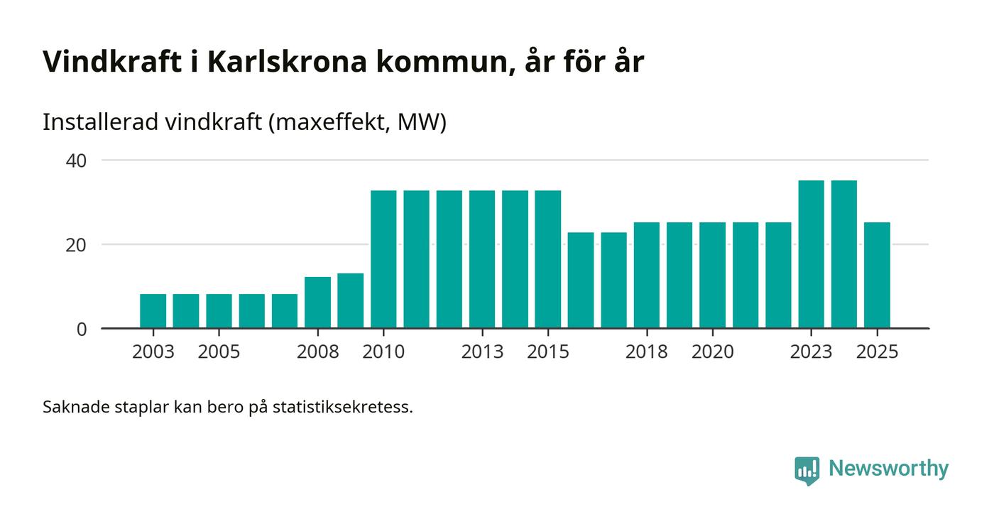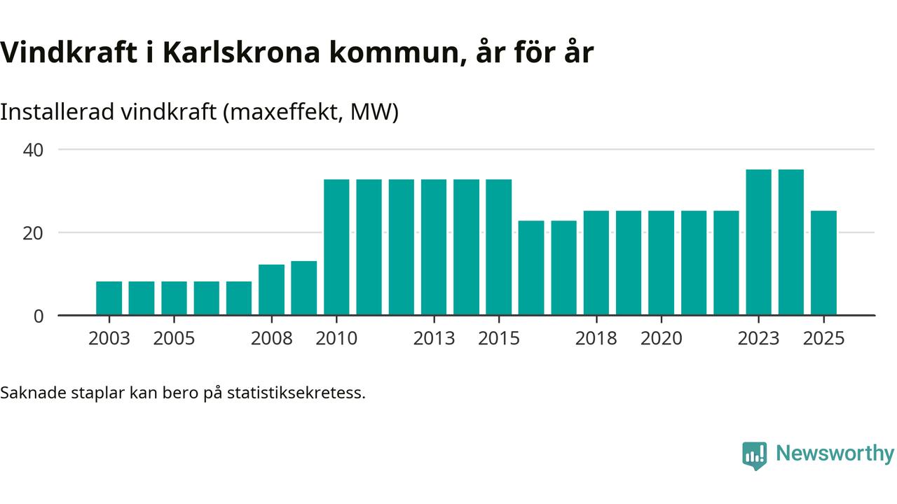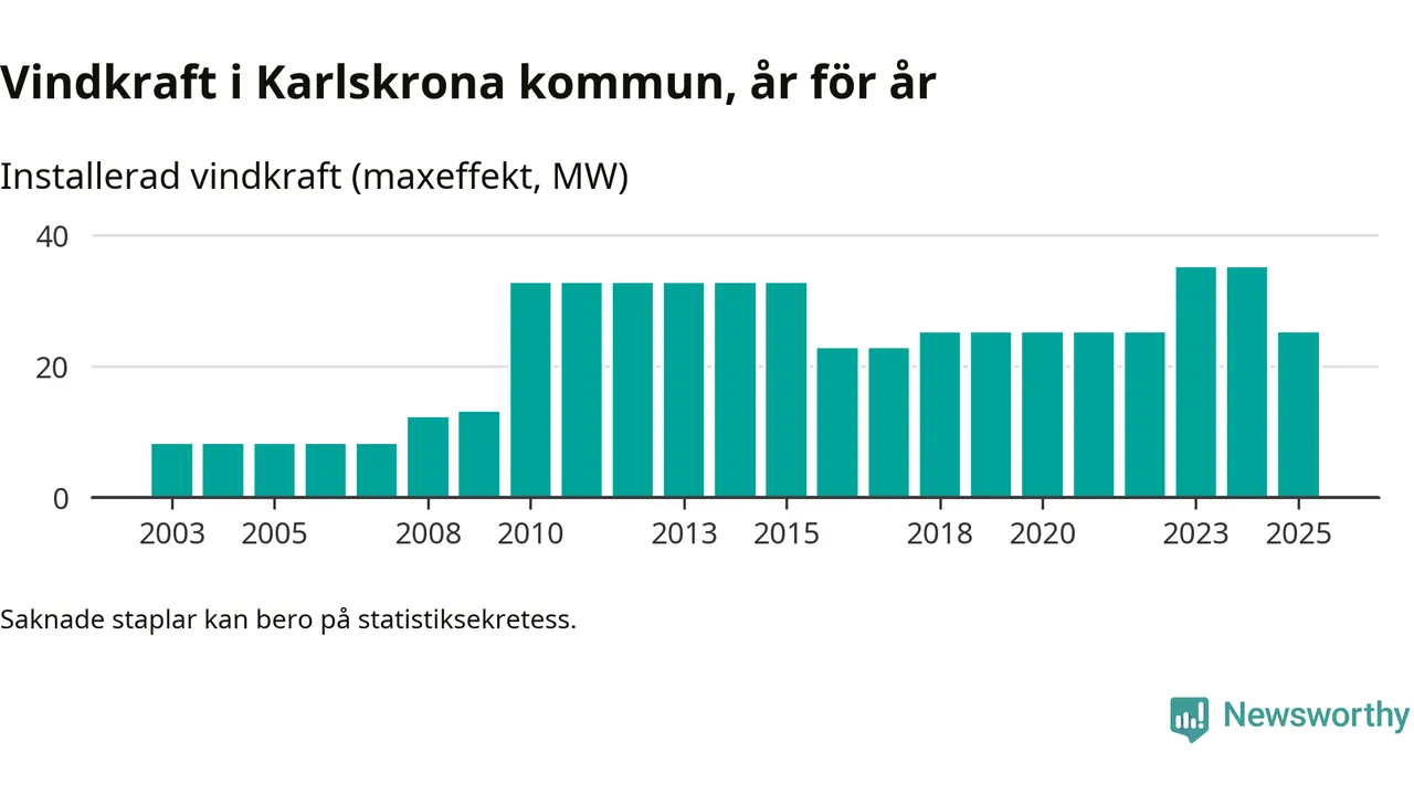 Totalt fanns i slutet av förra året 16 vindkraftverk i Karlskrona kommun, med en sammanlagd maxeffekt på 25 megawatt. Det är en minskning med tio megawatt 1, jämfört med året innan. Det visar nya siffror från Energimyndigheten.