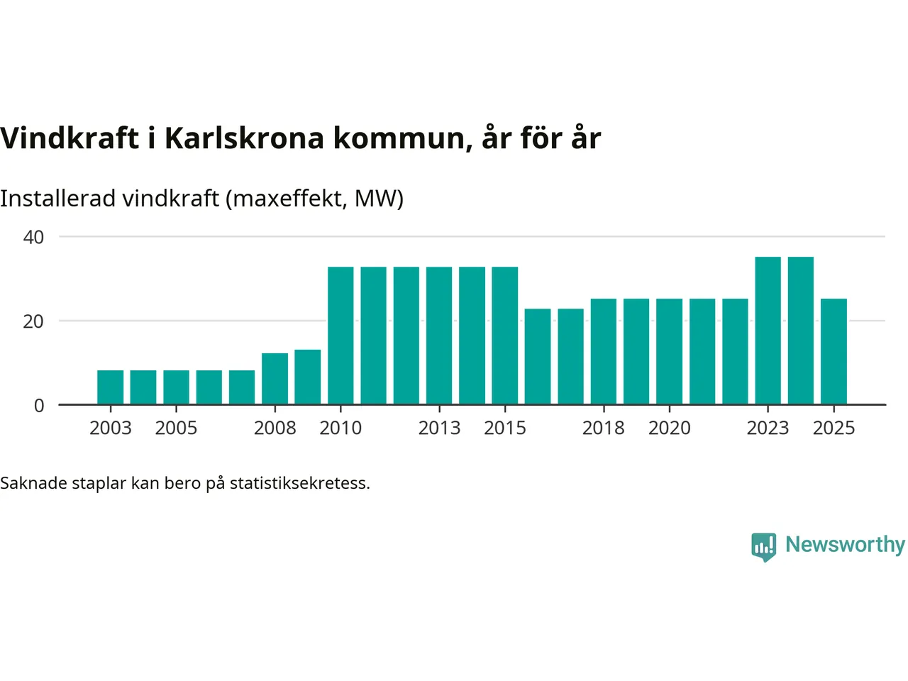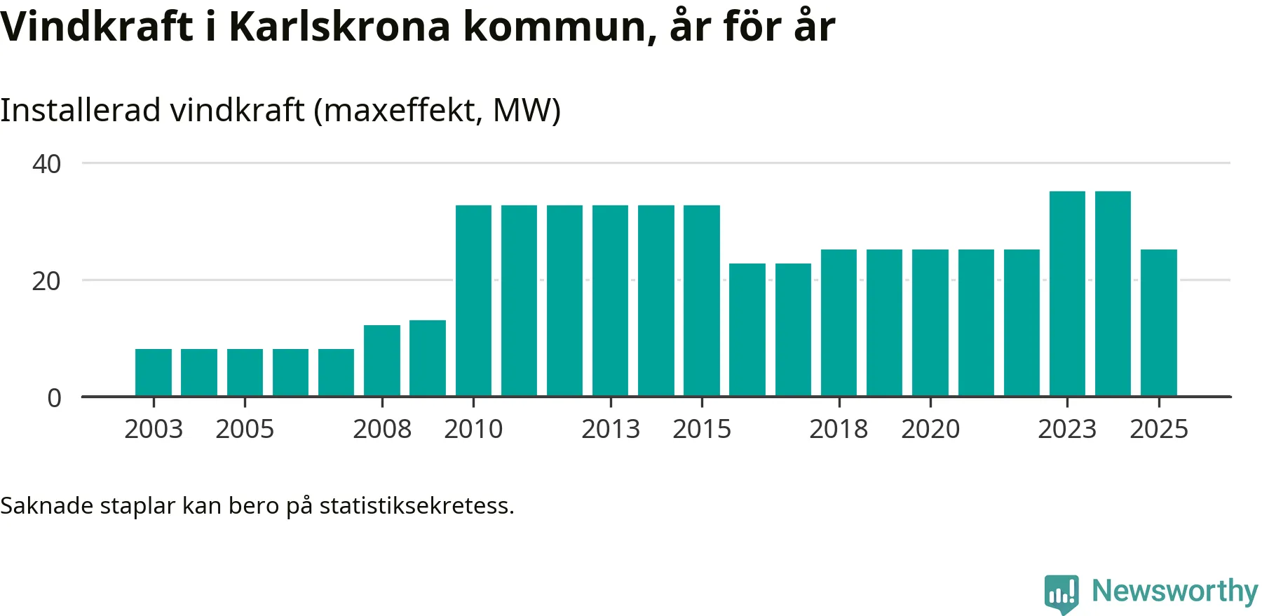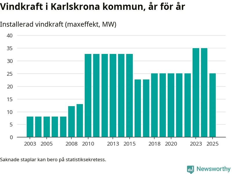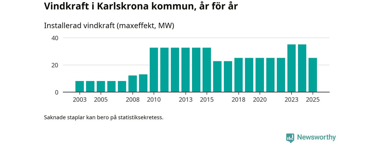Totalt fanns i slutet av förra året 16 vindkraftverk i Karlskrona kommun, med en sammanlagd maxeffekt på 25 megawatt. Det är en minskning med tio megawatt 1, jämfört med året innan. Det visar nya siffror från Energimyndigheten.