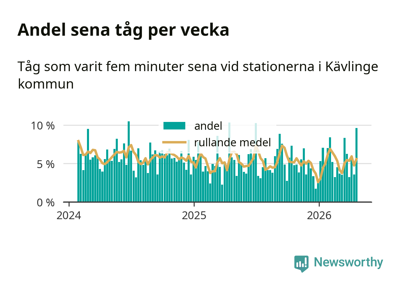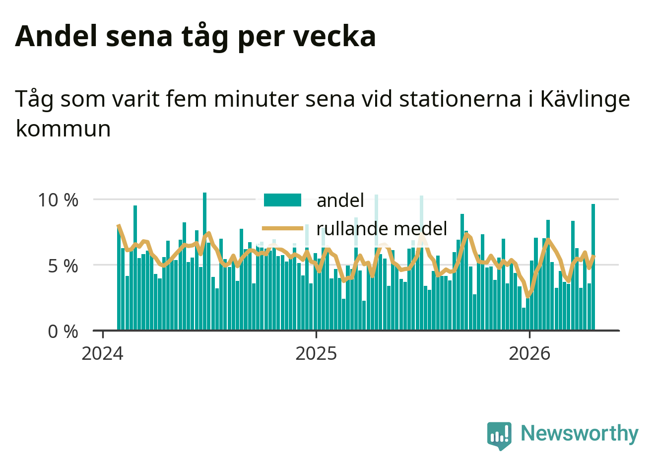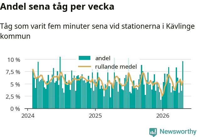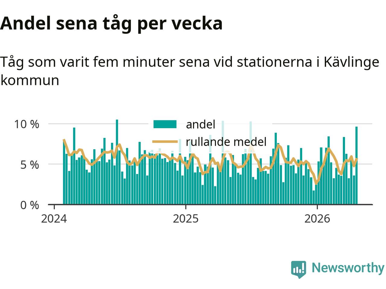 har andelen sena tåg varit 5 procent.