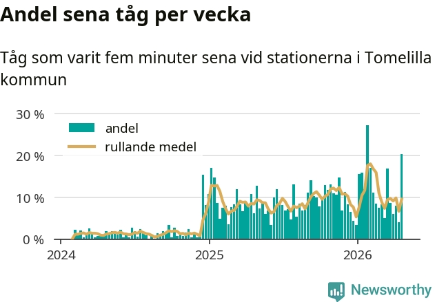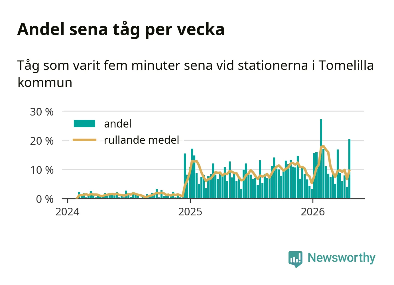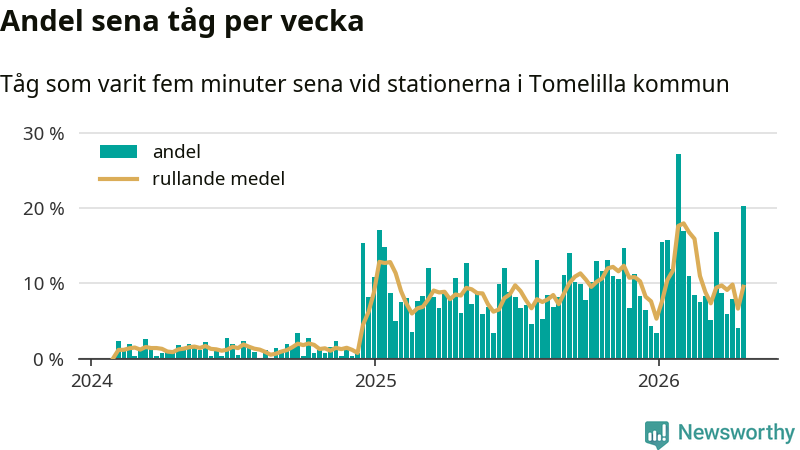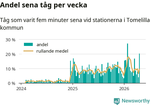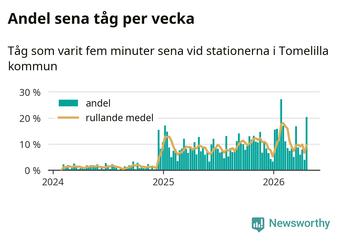 20 procent av tågen var sena när de passerade stationerna Lunnarp, Smedstorp eller Tomelilla under vecka 17. Det är fler än vanligt. En genomsnittlig vecka är motsvarande siffra sex procent,