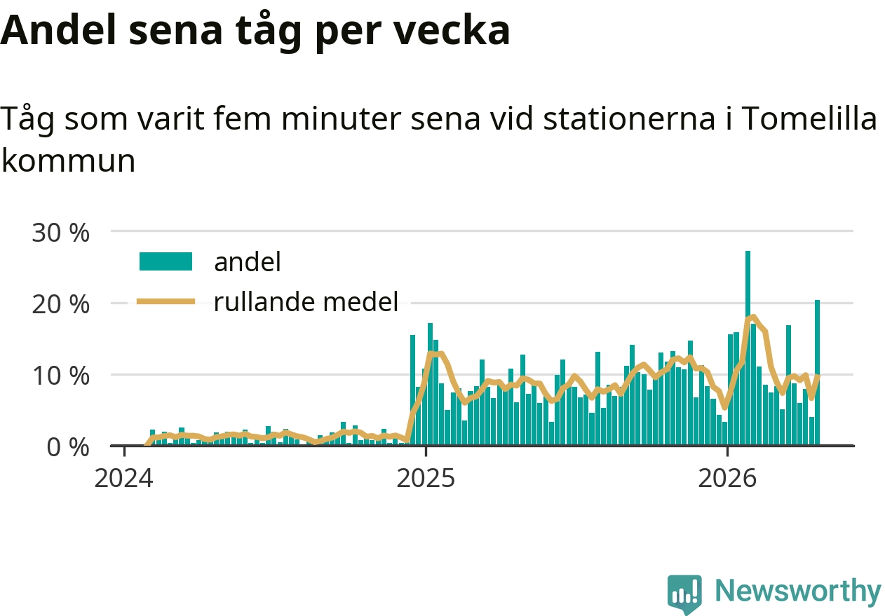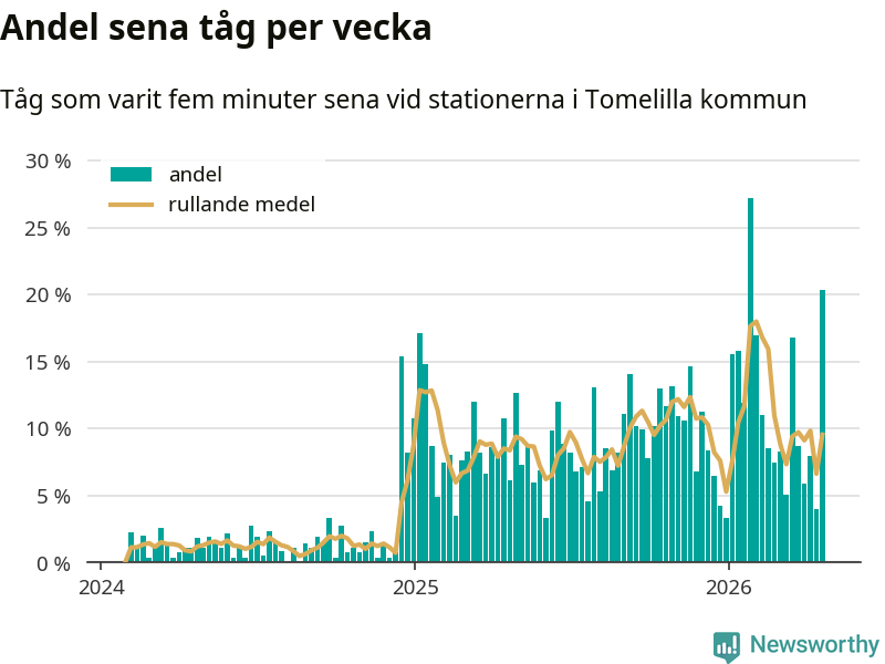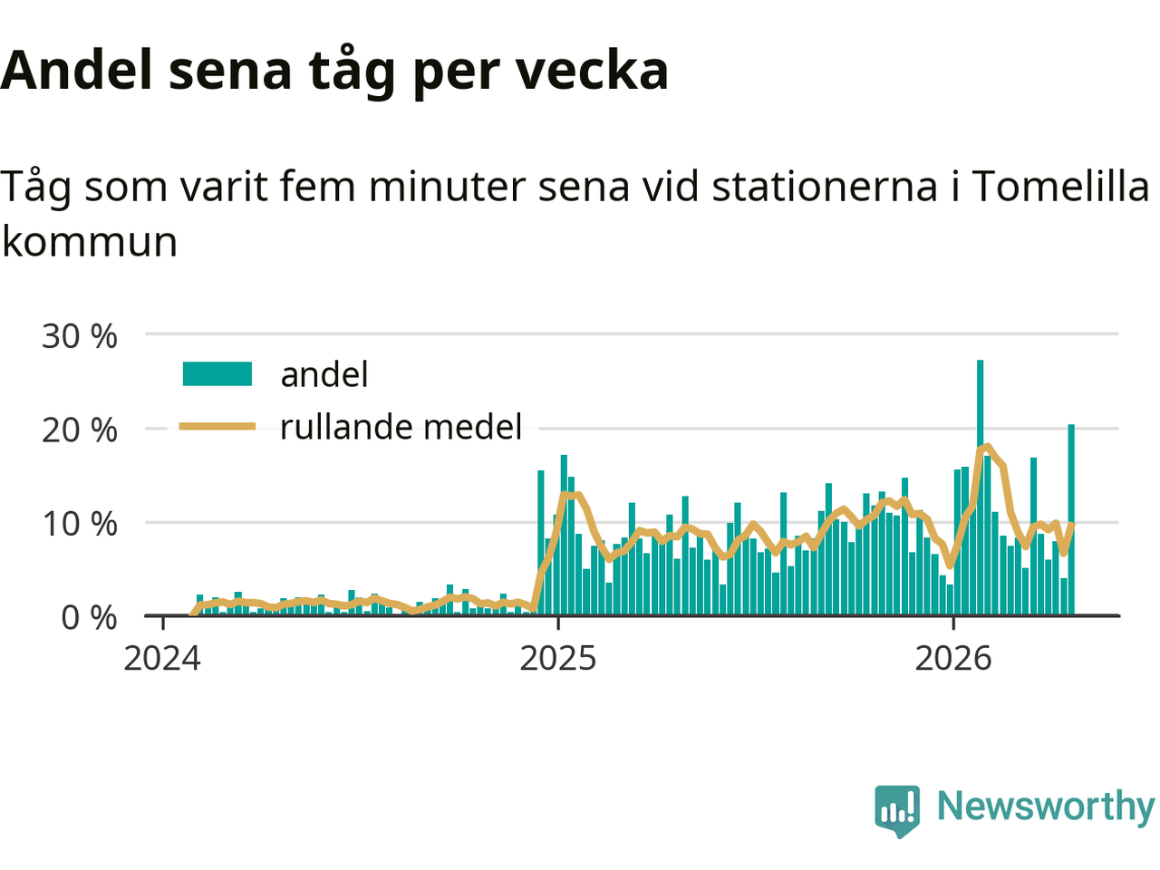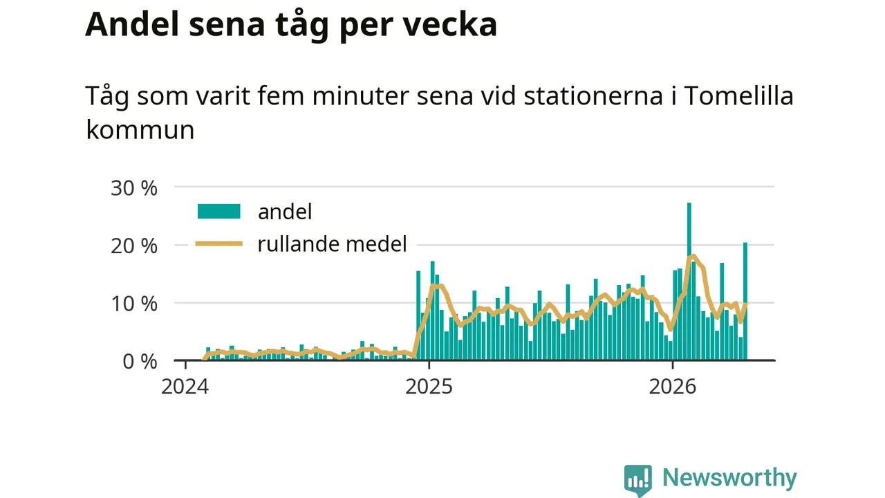 20 procent av tågen var sena när de passerade stationerna Lunnarp, Smedstorp eller Tomelilla under vecka 17. Det är fler än vanligt. En genomsnittlig vecka är motsvarande siffra sex procent,