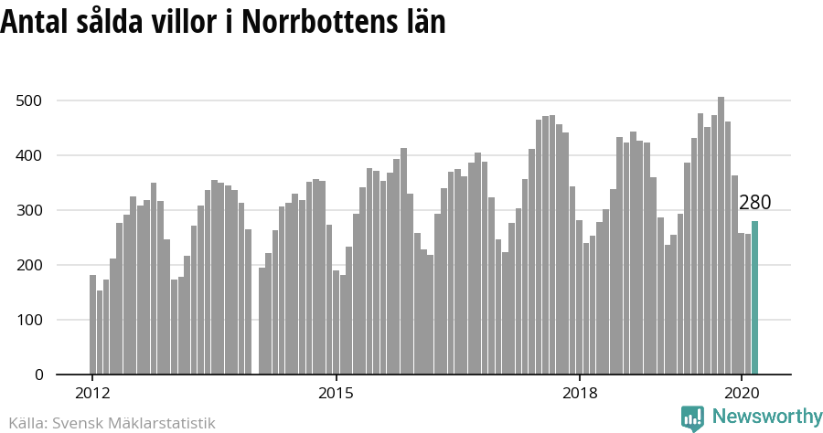 Sammanlagt såldes 280 villor i Norrbottens län mellan januari och mars till ett genomsnittligt pris på 1,9 miljoner kronor. I fjol gjordes 255 affärer vid den här tiden på året.