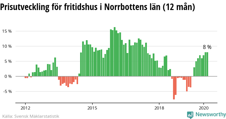 Priserna på fritidshus har gått upp i Norrbottens län. Medelpriset på försäljningarna under de senaste tolv månaderna visar på en uppgång med 8 procent.