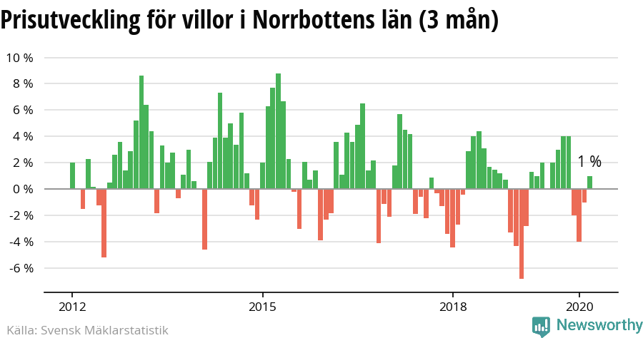 Villapriserna har gått upp i Norrbottens län. Medelpriset på försäljningarna under de senaste tre månaderna visar på en uppgång med 1 procent.