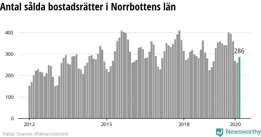 Sammanlagt såldes 286 bostadsrätter i Norrbottens län mellan januari och mars till ett genomsnittligt pris på 1,3 miljoner kronor. I fjol gjordes 266 affärer vid den här tiden på året.