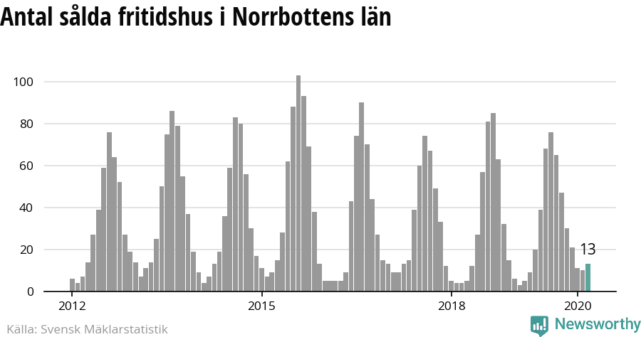 Sammanlagt såldes 13 fritidshus i Norrbottens län mellan januari och mars till ett genomsnittligt pris på 1,2 miljoner kronor. I fjol gjordes fem affärer vid den här tiden på året.
