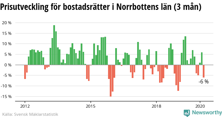 Priserna på bostadsrätter har gått ner i Norrbottens län. Medelpriset på försäljningarna under de senaste tre månaderna visar på en nedgång med 6 procent.