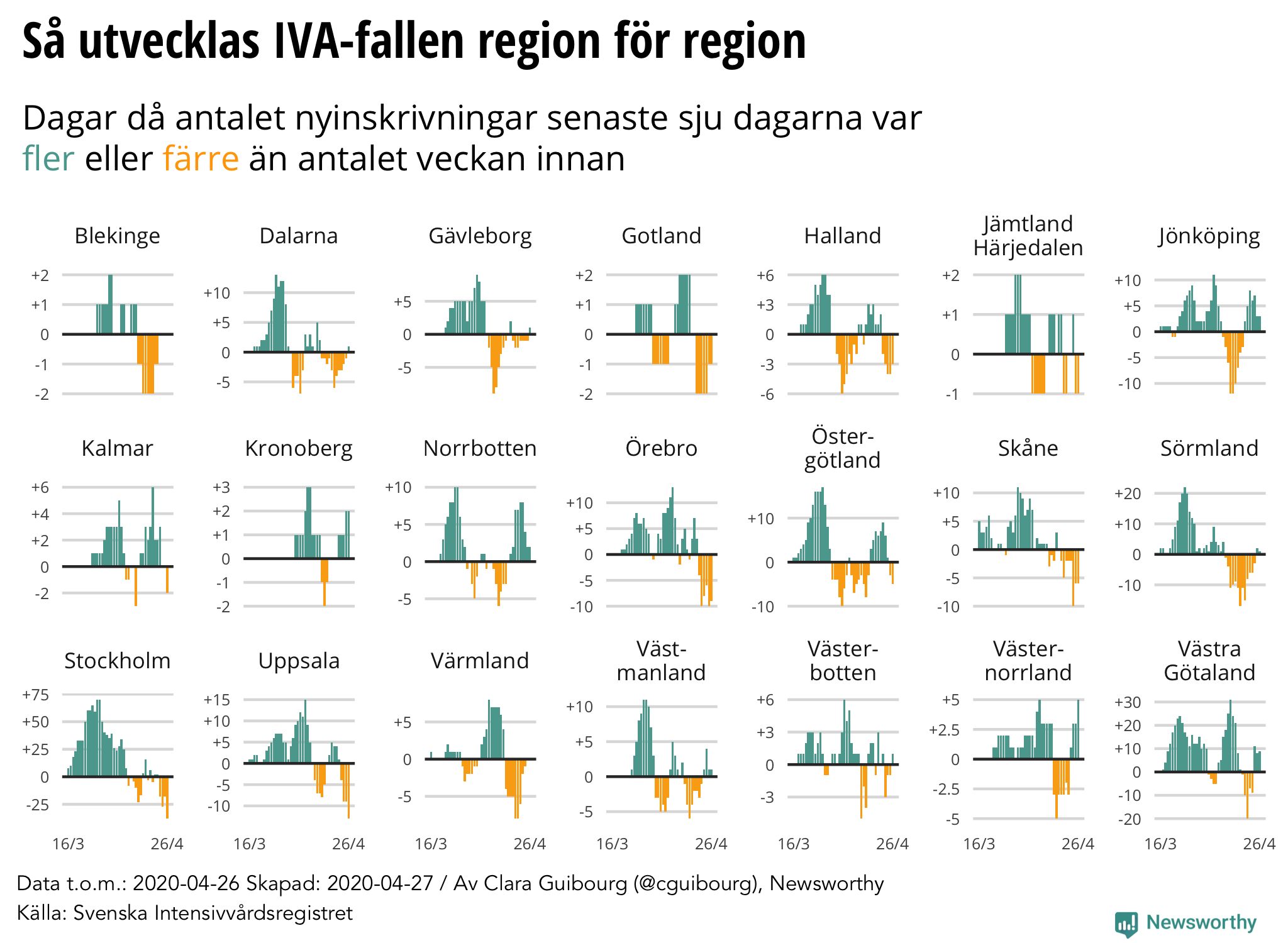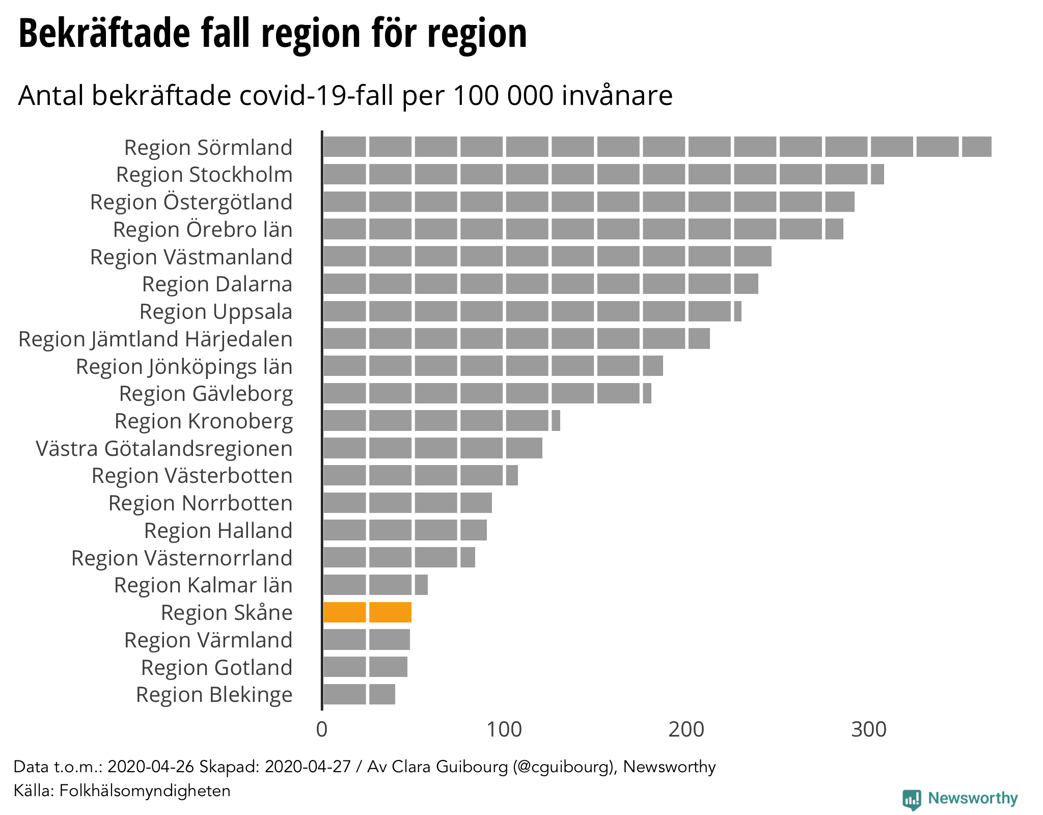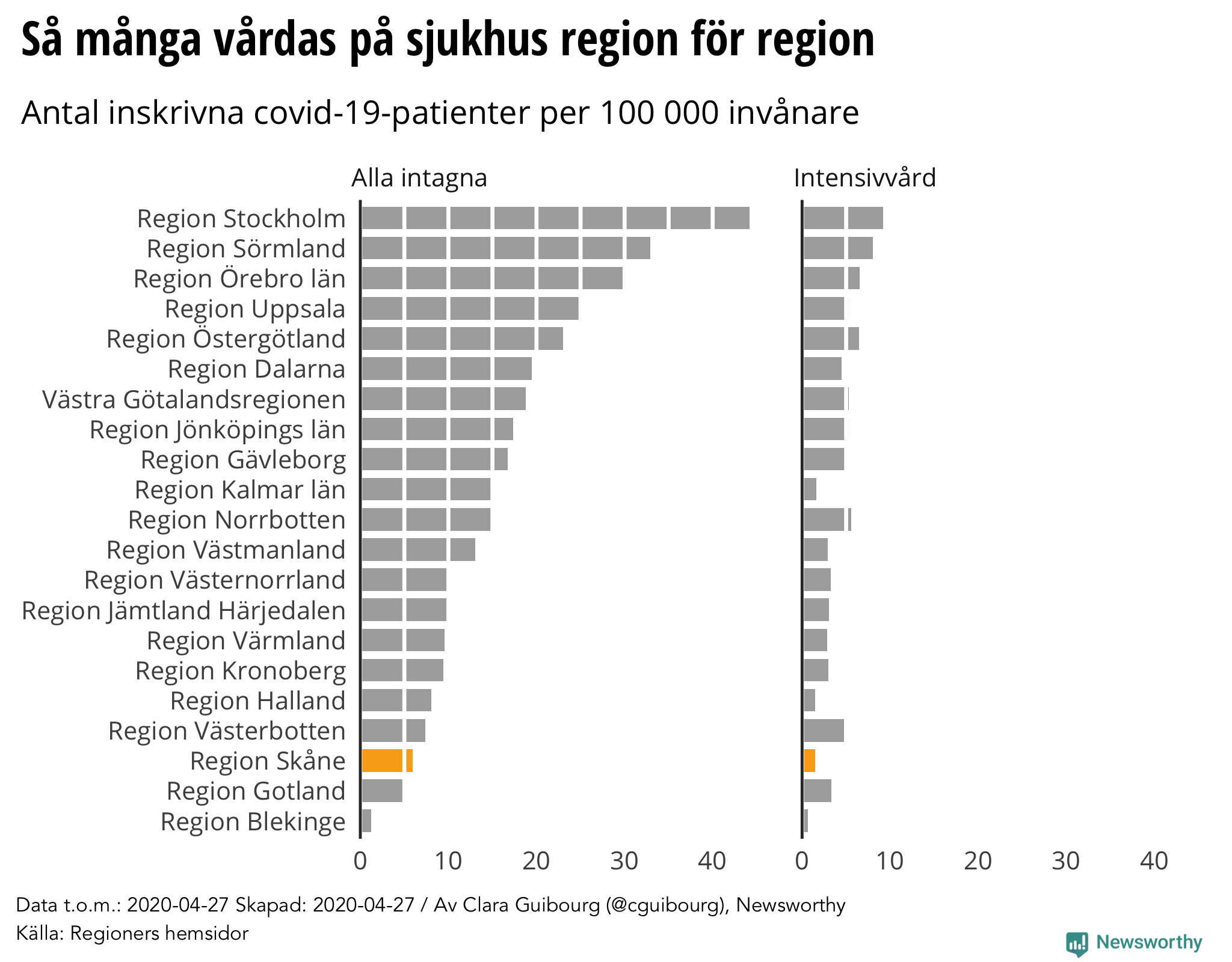 Newsworthy sammanställer varje dag en regional rapport om coronaviruset i Sverige baserat på statistik från Folkhälsomyndigheten, Svenska Intensivvårdsregistret och regioners egna hemsidor.