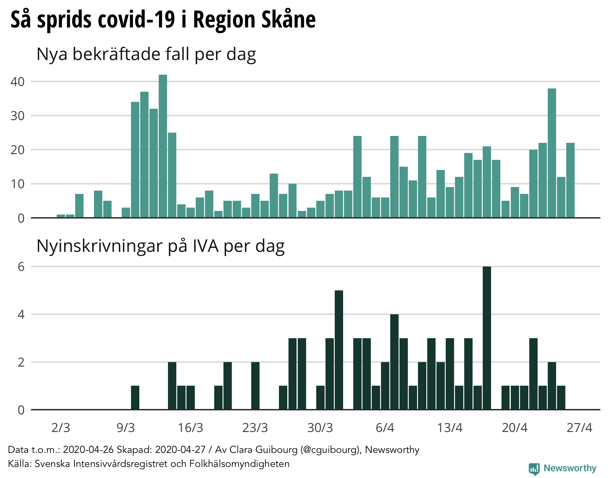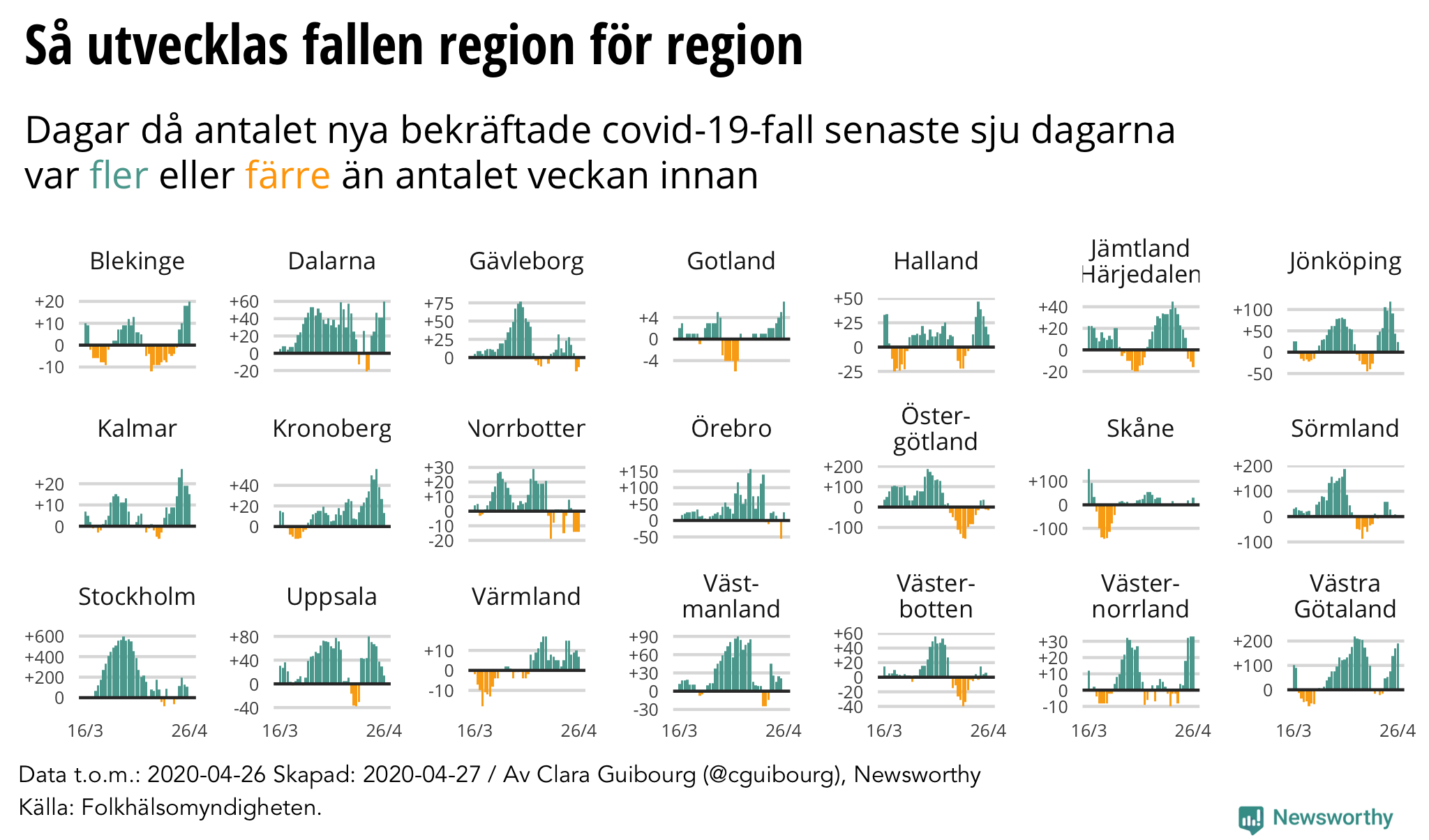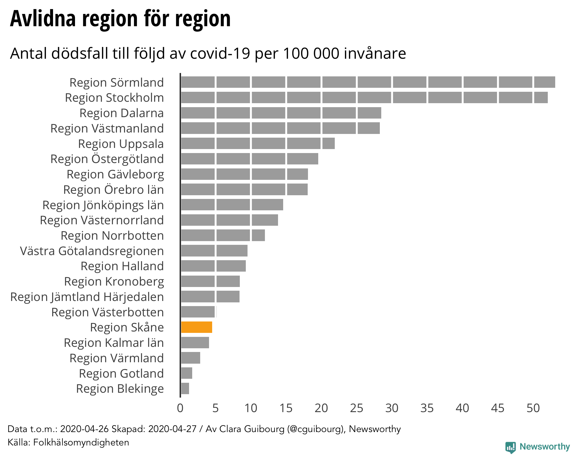 Newsworthy sammanställer varje dag en regional rapport om coronaviruset i Sverige baserat på statistik från Folkhälsomyndigheten, Svenska Intensivvårdsregistret och regioners egna hemsidor.