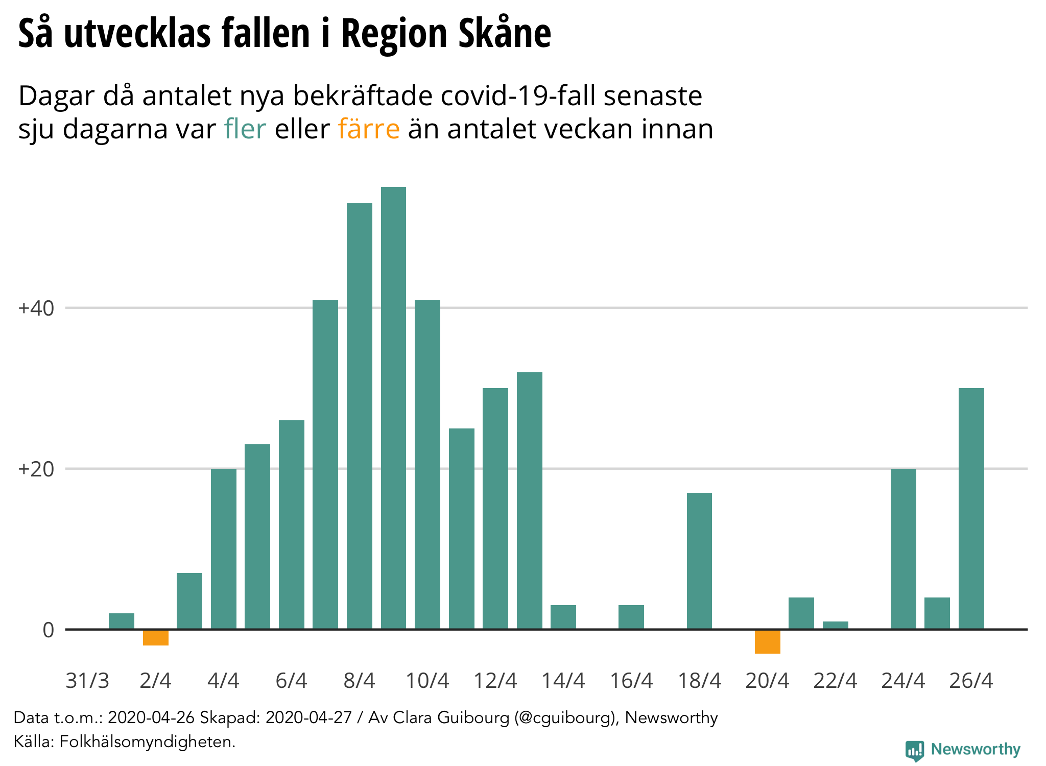 Den 26 april rapporterade Region Skåne 22 nya bekräftade coronafall. Totalt har regionen 678 bekräftade fall.