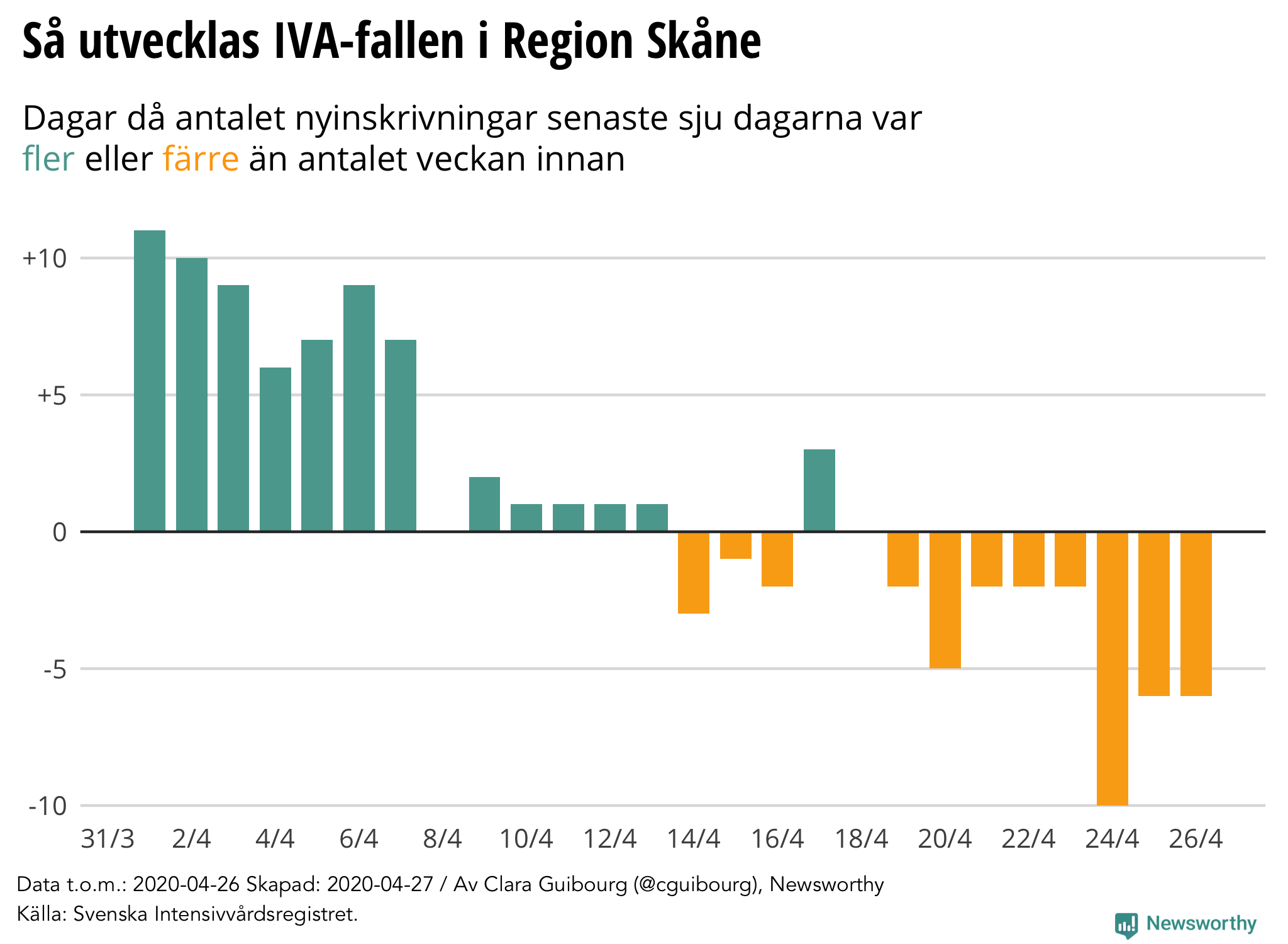 I snitt sker inskrivning för intensivvård omkring tio dagar efter insjuknande. Det innebär att nya IVA-patienter i Skåne vi se här insjuknade omkring den 16 april.