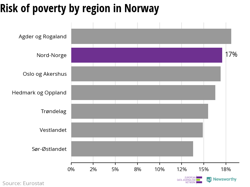 17 percent of people in Nord-Norge are living at risk of poverty, according to the figures from 2018. This is lower than the EU average.