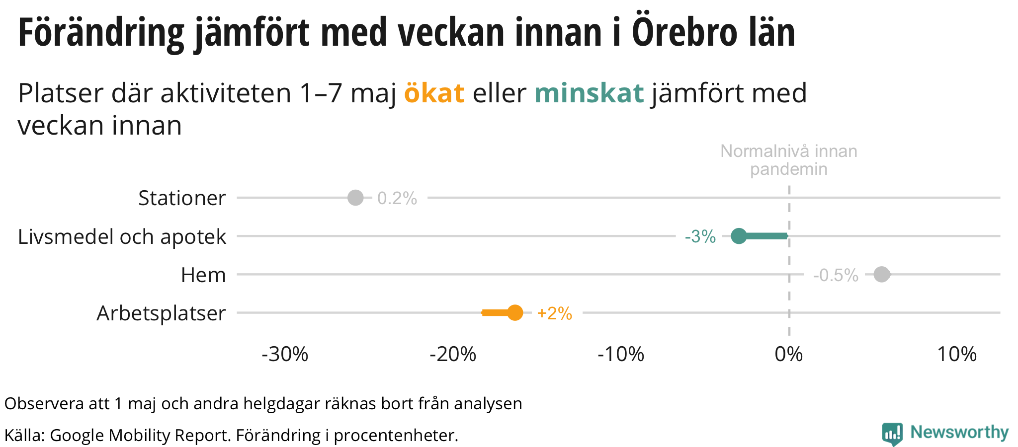 Orkar folk i Örebro hålla i den sociala isoleringen? Med hjälp av data från Google kan vi mäta hur besök till olika typer av platser har förändrats på senaste tiden, jämfört med innan pandemin.