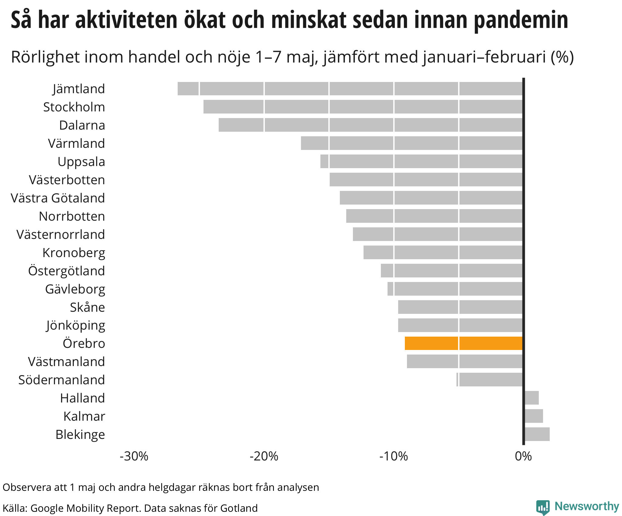 Googles senaste siffror, som publicerades nyligen och som sträcker sig till och med torsdagen den 7 maj, visar att invånarna i Örebro rörde sig mindre på kaféer, restauranger och i affärer förra veckan än veckan innan.