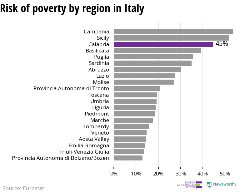 45 percent of people in Calabria are living at risk of poverty, according to the figures from 2018. This is the seventh highest rate in Europe1.